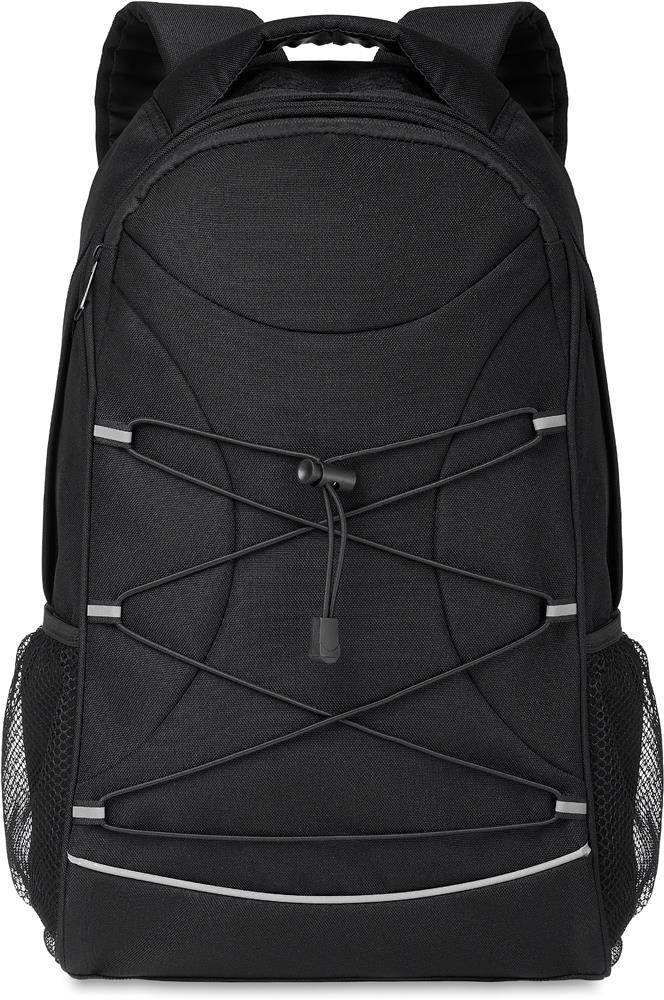 Rucksack aus 600D RPET mit Schnürung auf der Vorderseite und reflektierenden Details. Netztaschen auf beiden Seiten.