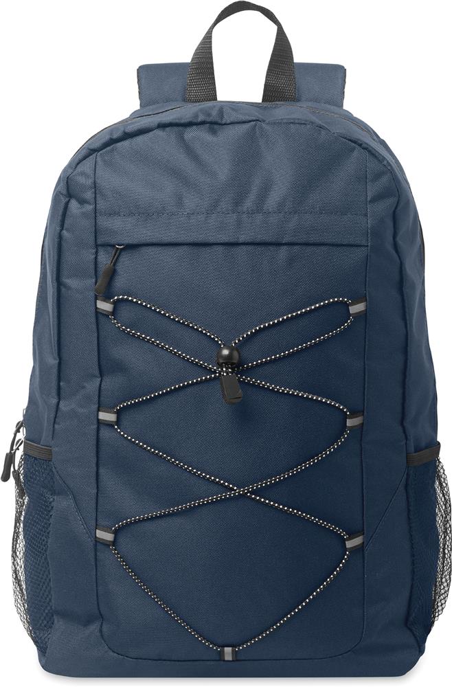Rucksack mit Schnürung. Fronttasche mit Reißverschluss. Netztaschen auf beiden Seiten. 600D RPET-Polyester.
