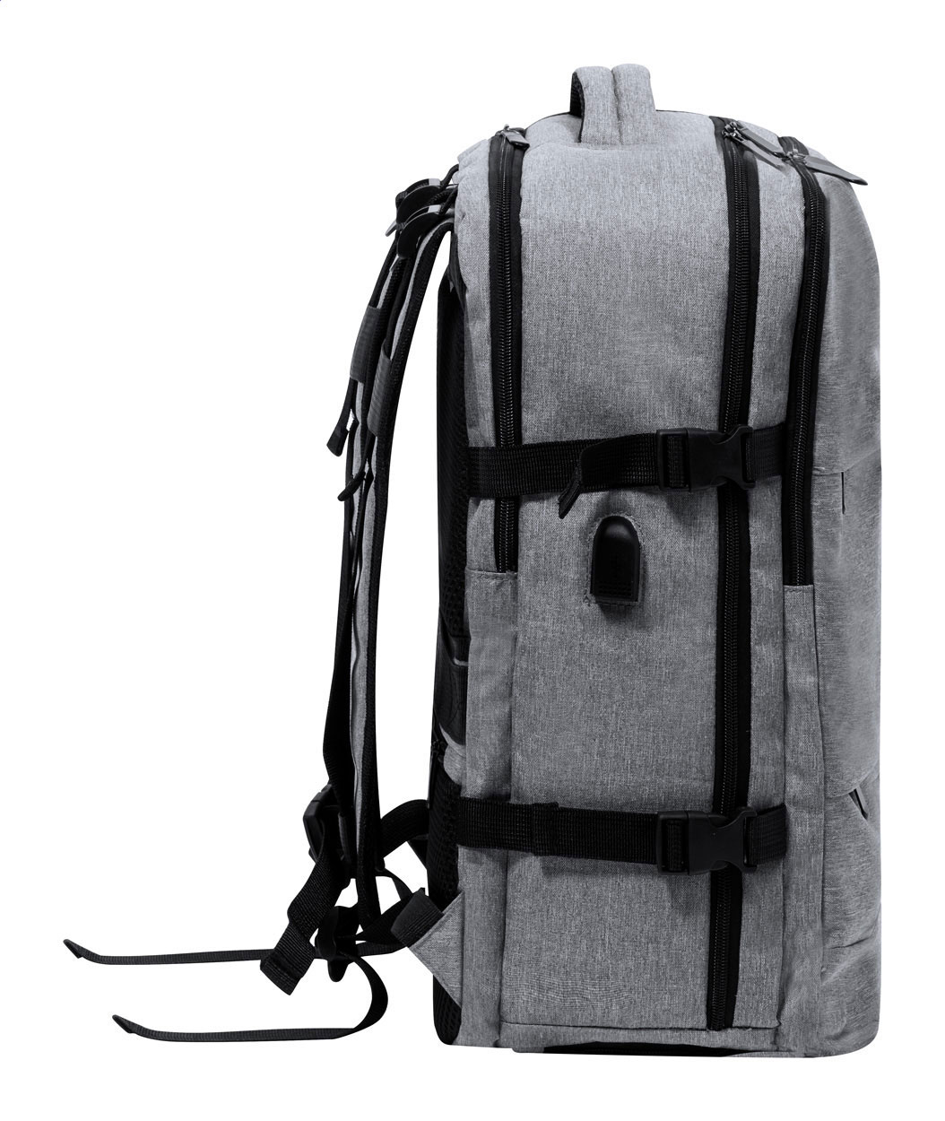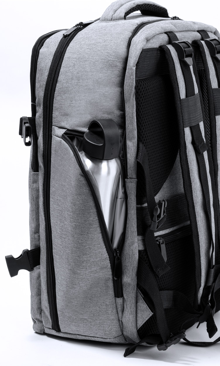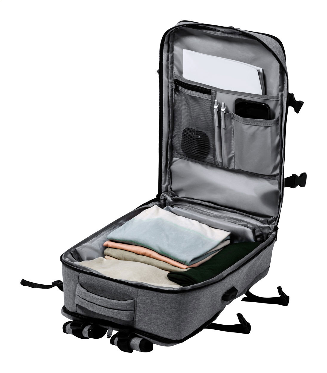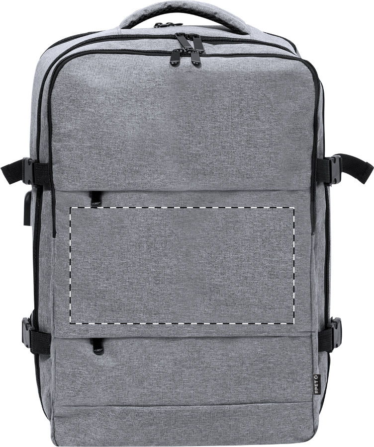 Wasserabweisender RPET-Rucksack mit 3 Hauptfächern mit Reißverschluss, 2 Fronttaschen mit Reißverschluss, Seitentasche mit Reißverschluss und versteckter Diebstahlschutztasche. Mit gepolstertem Laptop- (17") und Schuhfach, gepolstertem Rücken und Schultergurten. Mit Trolley-Gurt und integriertem USB-Anschluss für Powerbanks. 300D RPET-Polyester mit markantem RPET-Label.