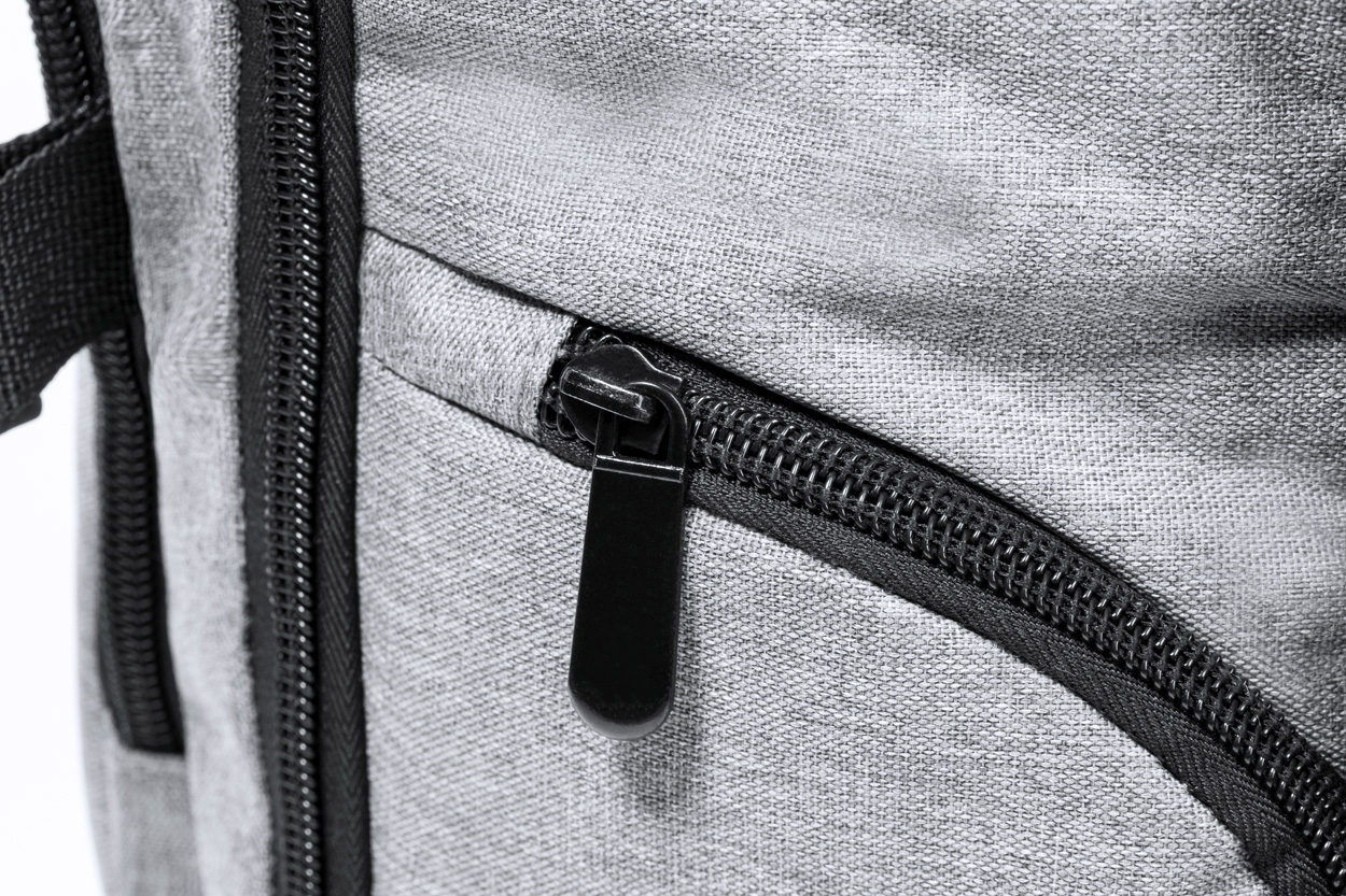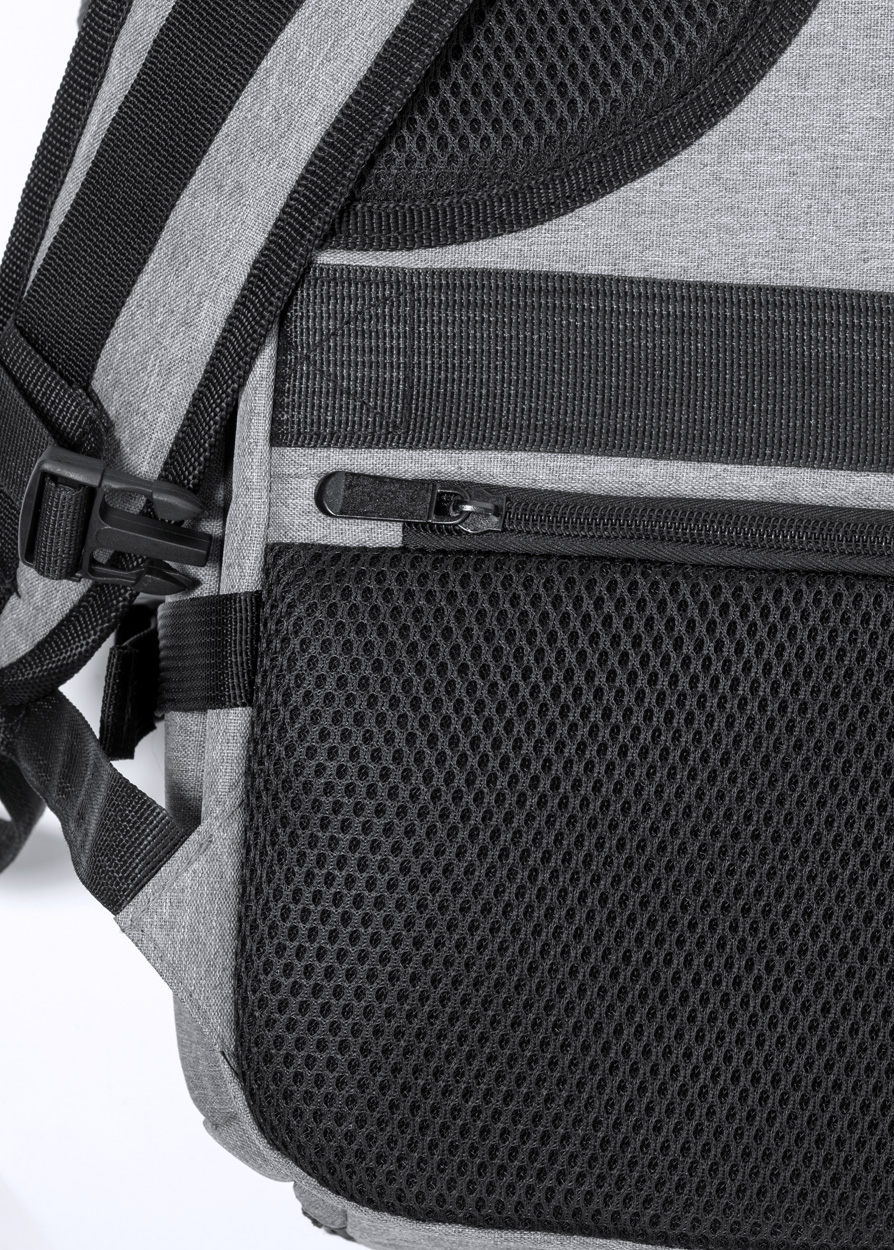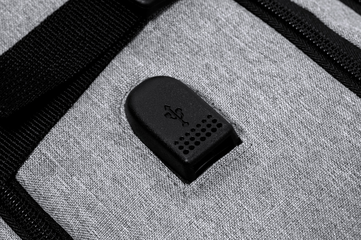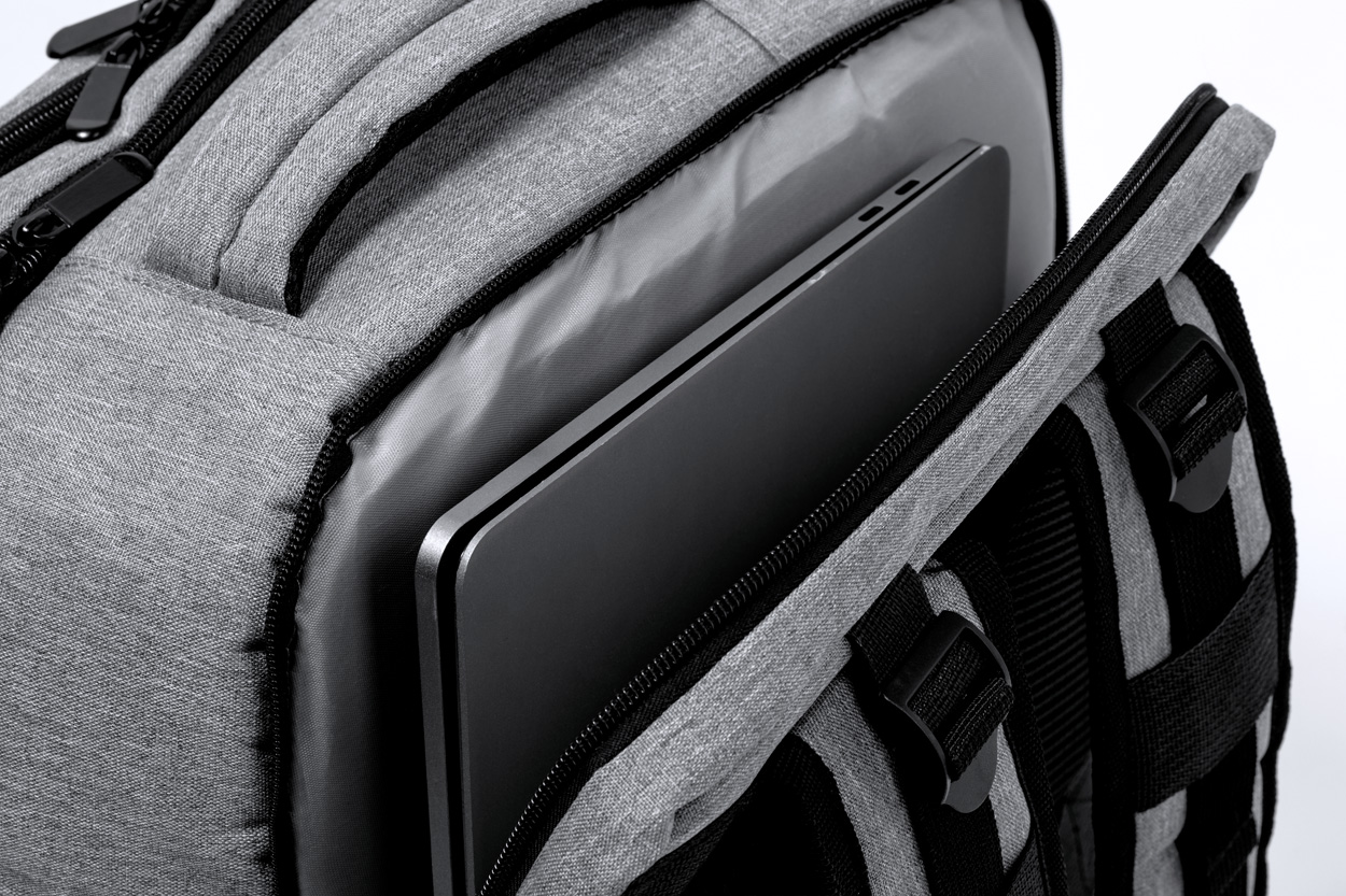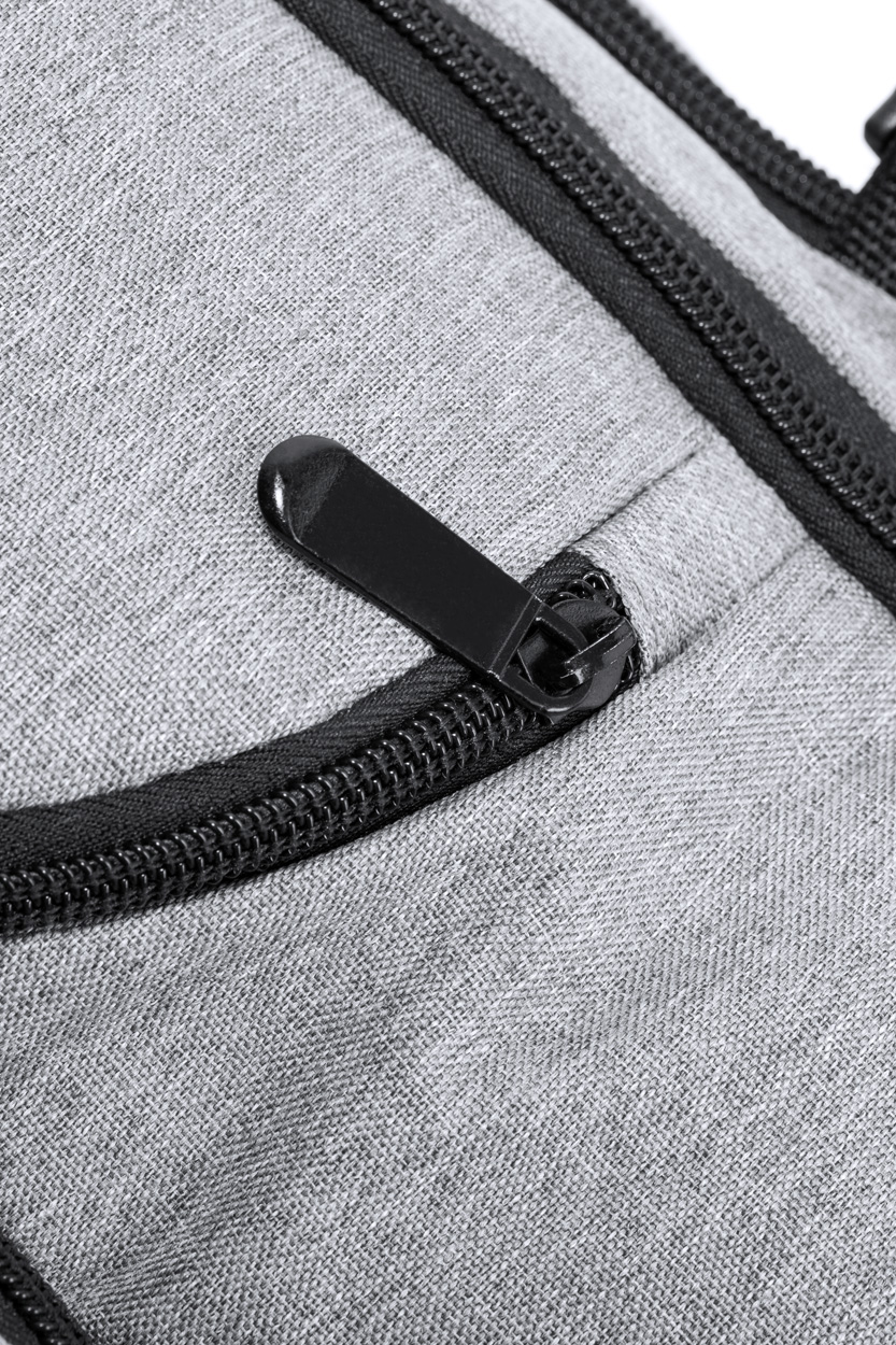 Wasserabweisender RPET-Rucksack mit 3 Hauptfächern mit Reißverschluss, 2 Fronttaschen mit Reißverschluss, Seitentasche mit Reißverschluss und versteckter Diebstahlschutztasche. Mit gepolstertem Laptop- (17") und Schuhfach, gepolstertem Rücken und Schultergurten. Mit Trolley-Gurt und integriertem USB-Anschluss für Powerbanks. 300D RPET-Polyester mit markantem RPET-Label.