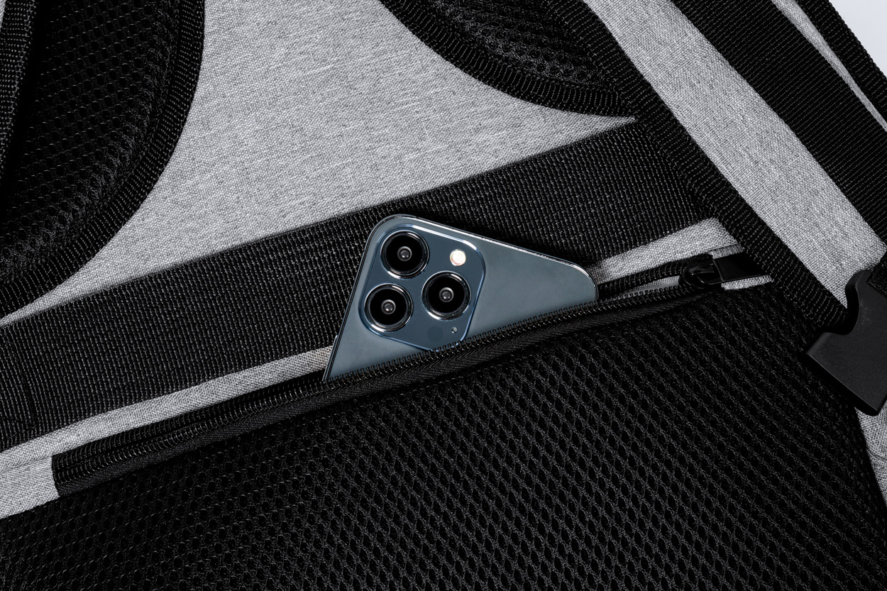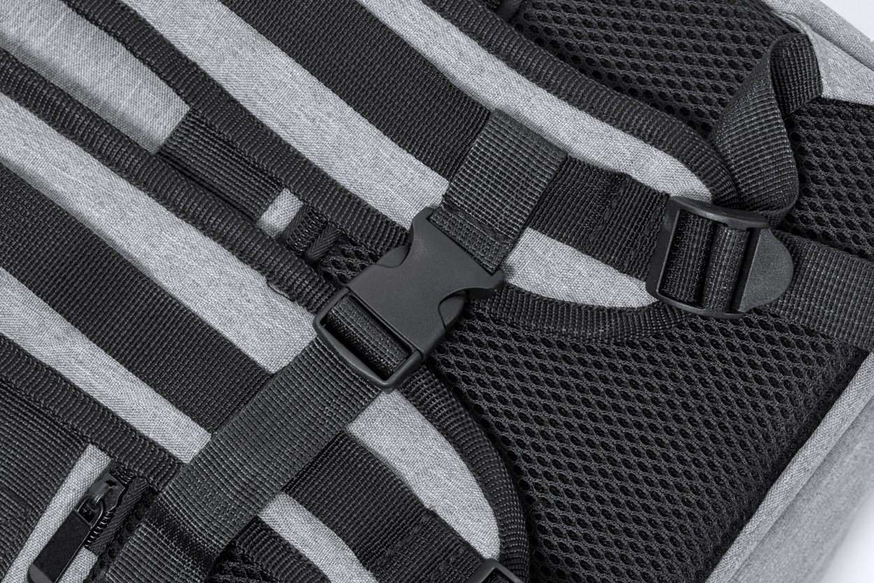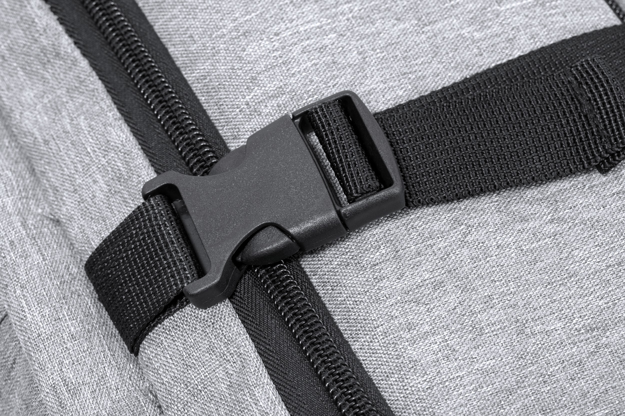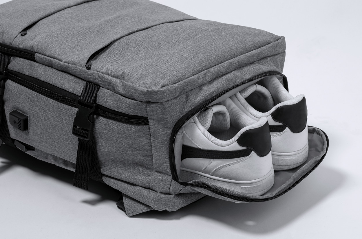 Wasserabweisender RPET-Rucksack mit 3 Hauptfächern mit Reißverschluss, 2 Fronttaschen mit Reißverschluss, Seitentasche mit Reißverschluss und versteckter Diebstahlschutztasche. Mit gepolstertem Laptop- (17") und Schuhfach, gepolstertem Rücken und Schultergurten. Mit Trolley-Gurt und integriertem USB-Anschluss für Powerbanks. 300D RPET-Polyester mit markantem RPET-Label.