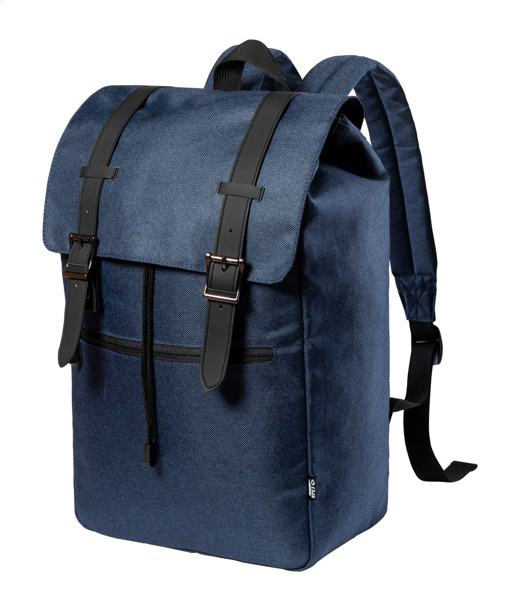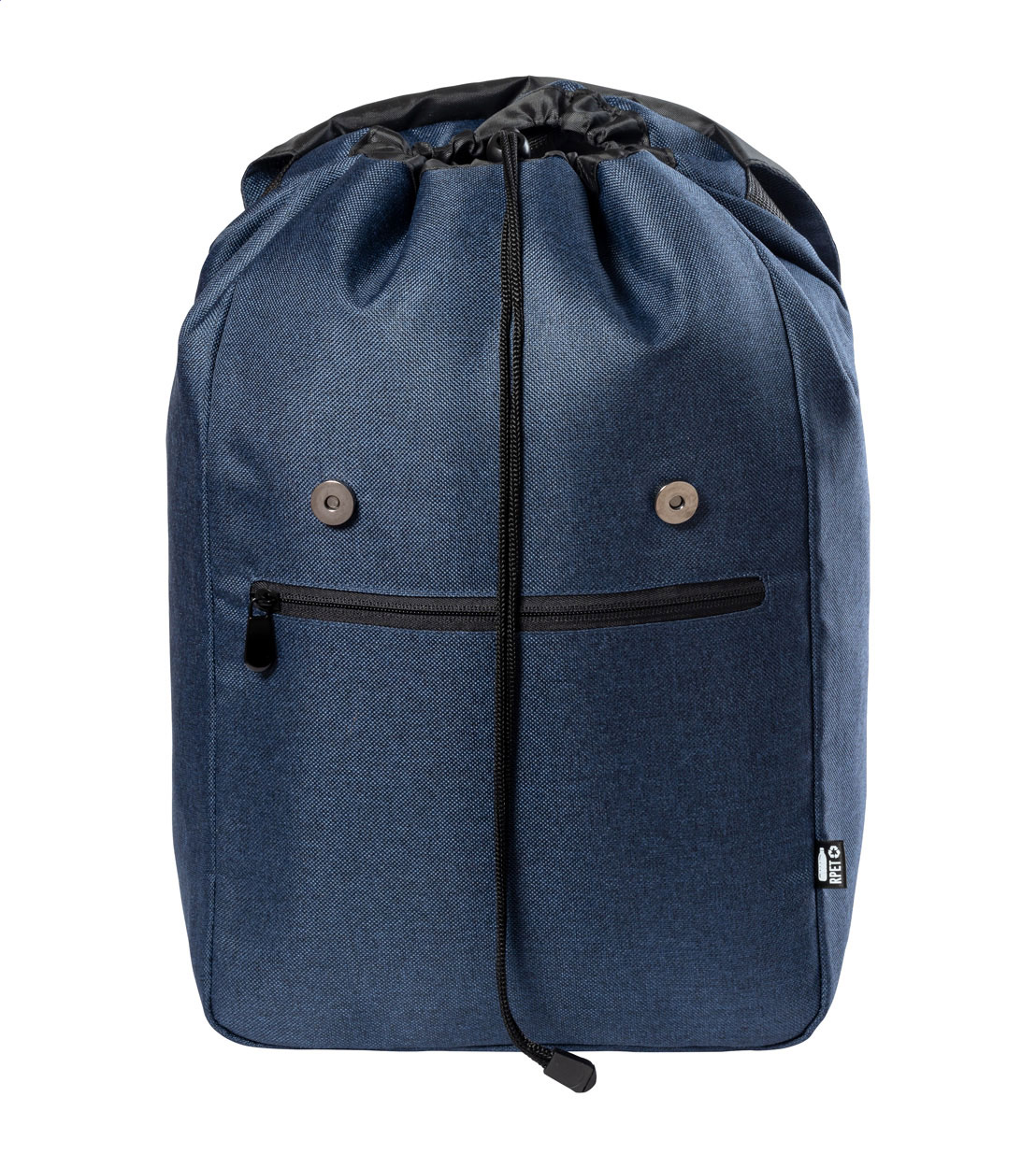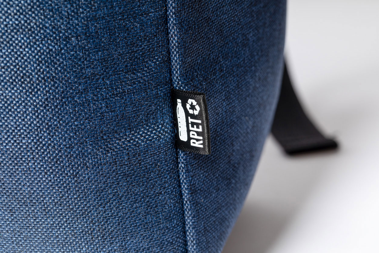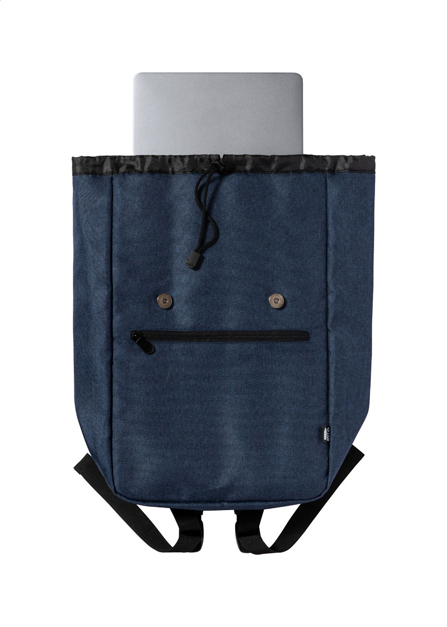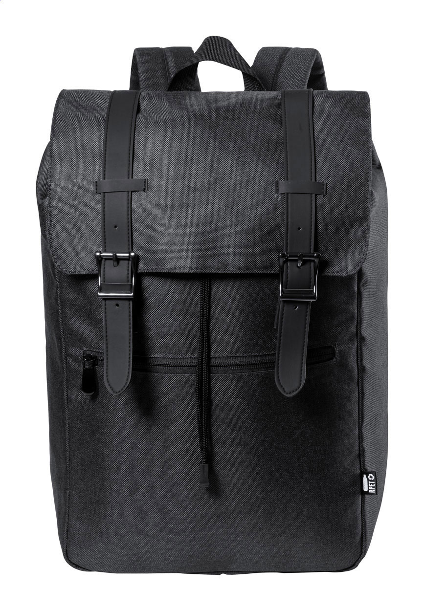 Rucksack aus RPET mit gepolstertem Laptop- (15") und Tabletfach (12"), Reißverschlusstasche Vorderseite, gepolstertem Rücken und Schultergurten. Hauptfach mit Kordelzug und magnetischem Druckknopfverschluss. Material: 300D RPET Polyester. Mit RPET-Label.