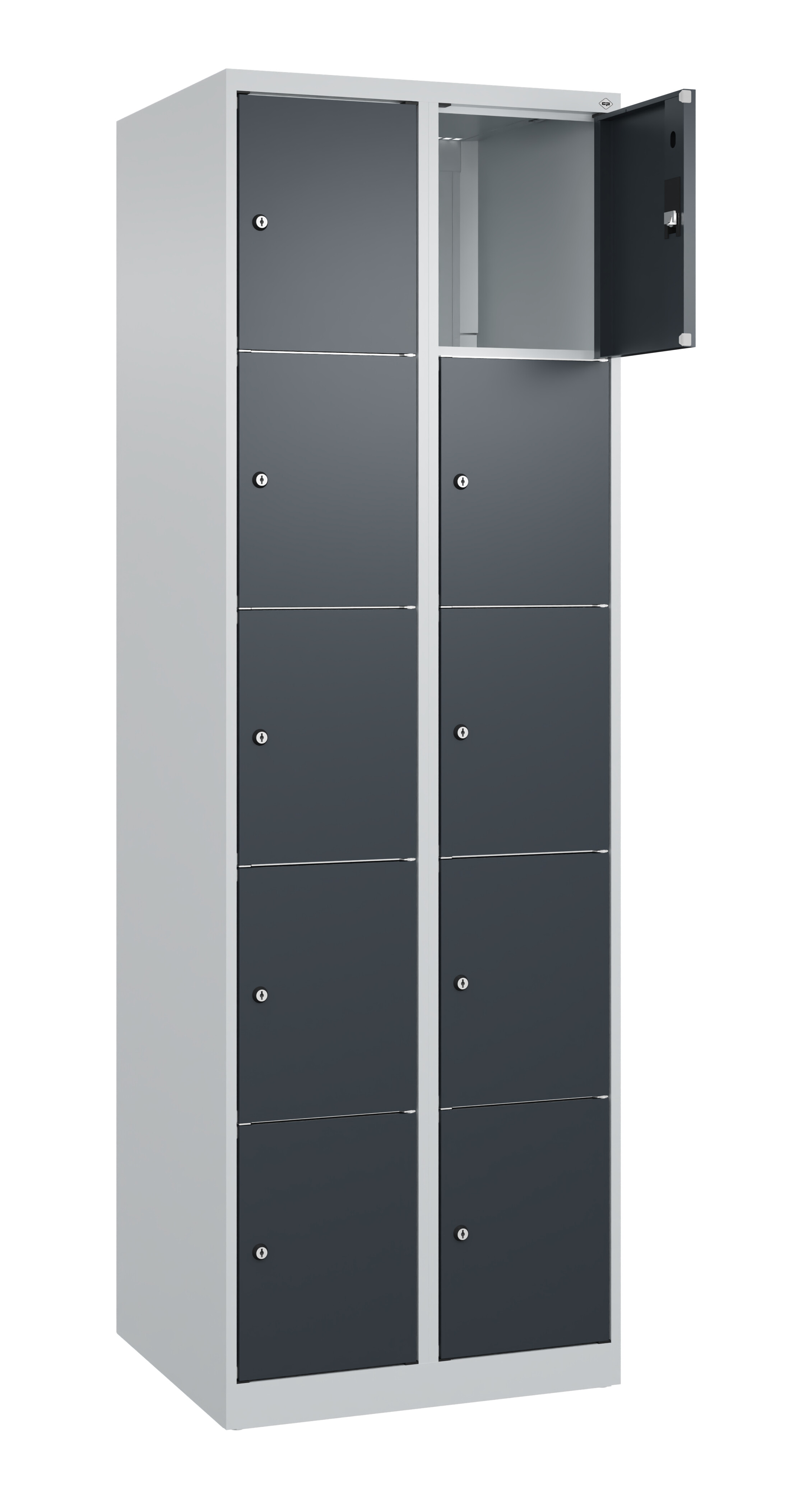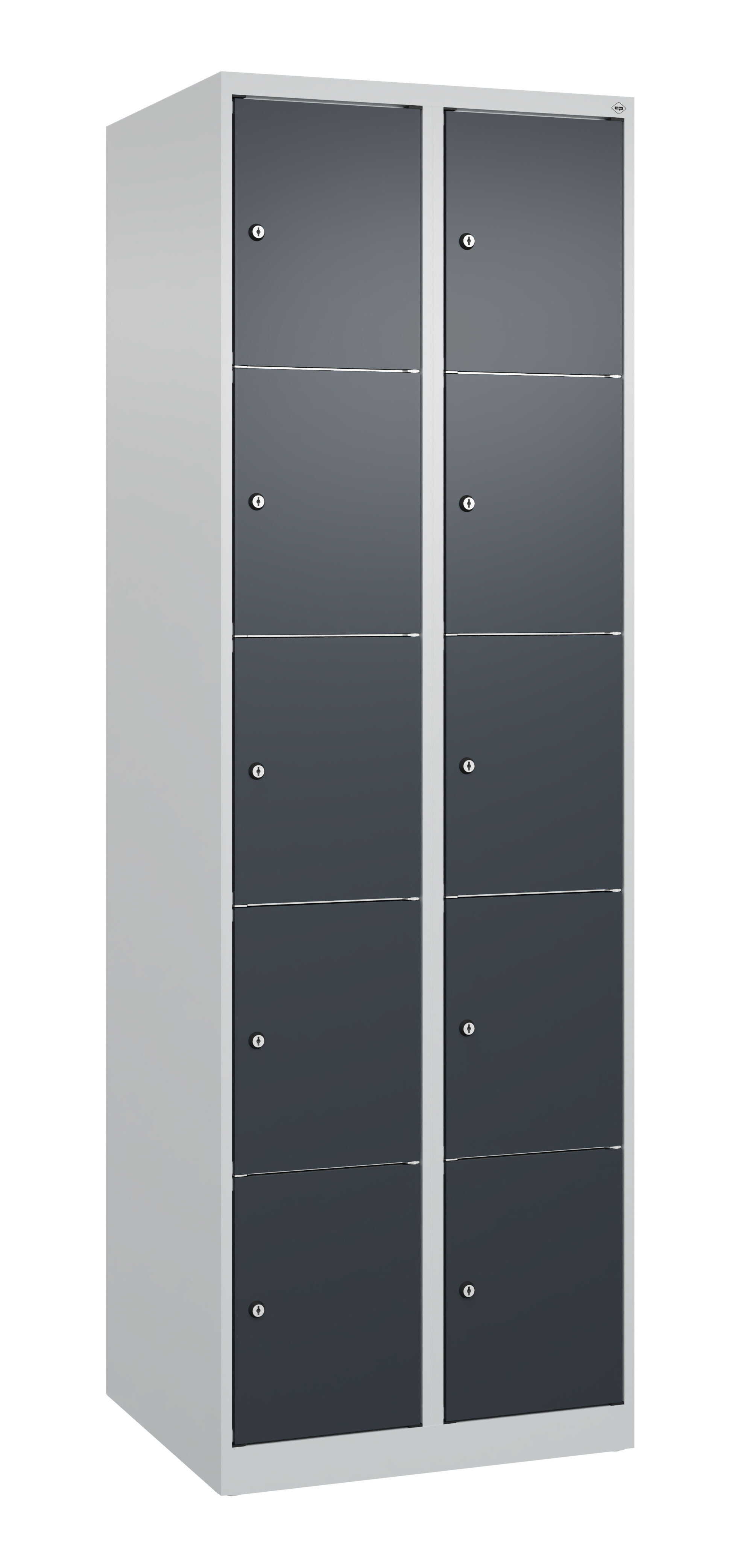 Schließfachschrank Classic PLUS, 2 Abteile mit je 5 Fächern, Abteilbreite 300 mm, Korpus aus stabiler Stahlkonstruktion mit hochwertiger Einbrennbeschichtung für hohe UV- und Korrosionsbeständigkeit, mit Bodengleitern als praktischer Schrank- und Fußbodenschutz, Türöffnungen 110 Grad, Türaufhängung rechts, Stahl-Türen mit Soft-Anschlag und geschlossenen Seitenprofilen für hohe Stabilität, Türaufhängung in stabilen Drehbolzen, 10 Zylinderschlösser mit 2 Schlüsseln, Schließkreis bis 1000 verschiedene Schließungen, Maße (H x B x T): 1850 x 600 x 500 mm, Korpus: RAL 7035 Lichtgrau, Türen Stahl: RAL 7016 Anthrazitgrau, Gewicht: 42 kg