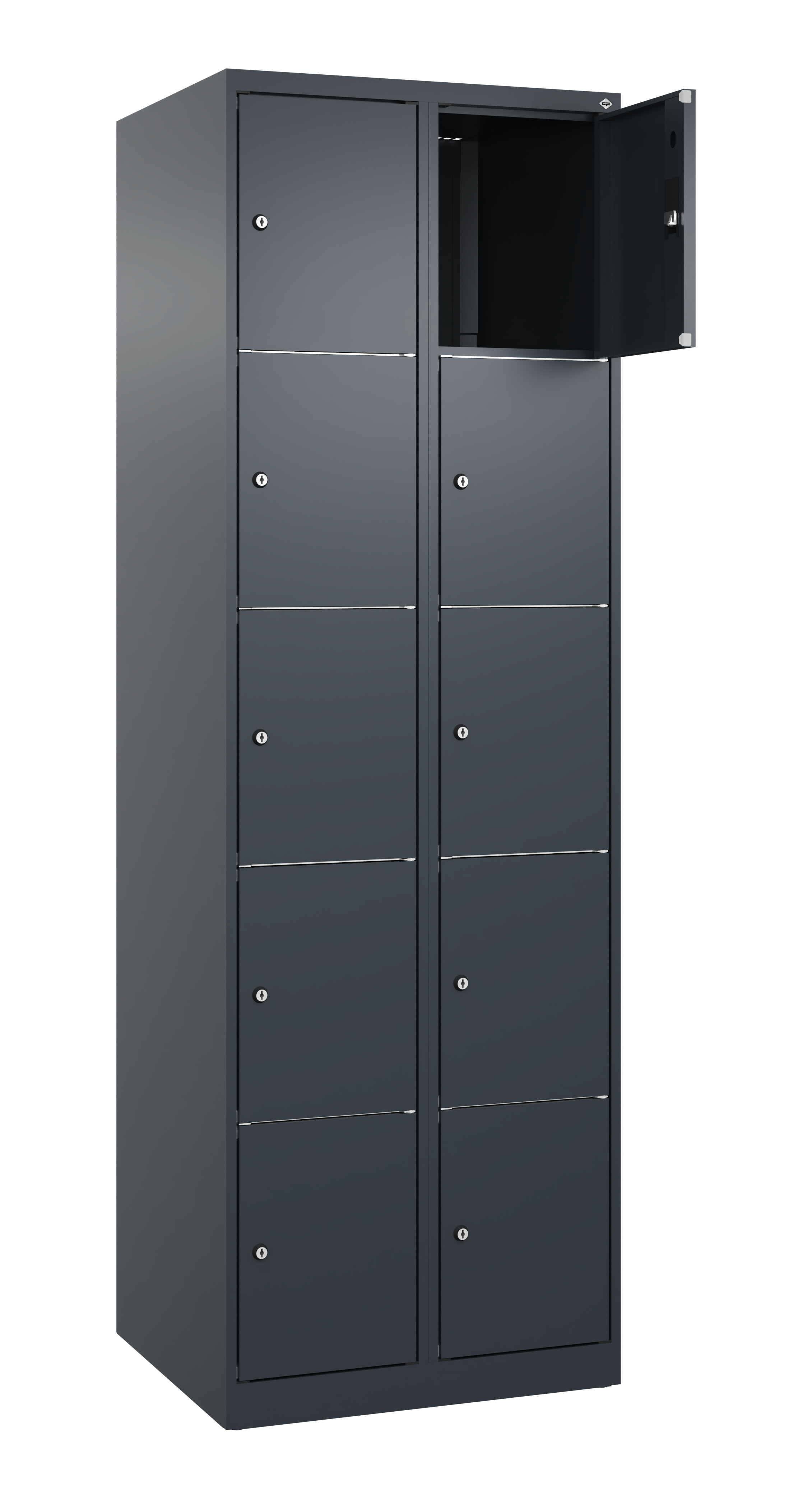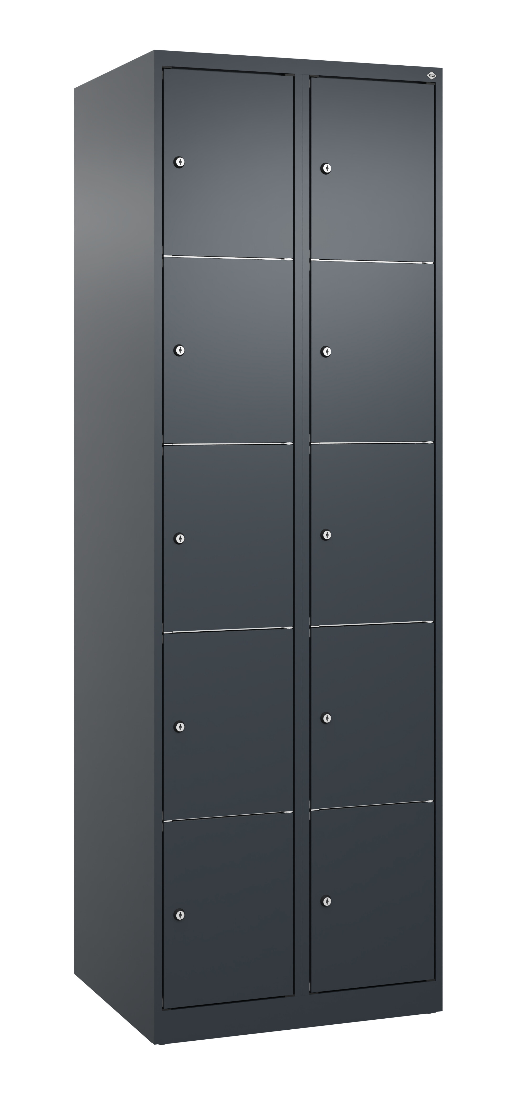 Schließfachschrank Classic PLUS, 2 Abteile mit je 5 Fächern, Abteilbreite 300 mm, Korpus aus stabiler Stahlkonstruktion mit hochwertiger Einbrennbeschichtung für hohe UV- und Korrosionsbeständigkeit, mit Bodengleitern als praktischer Schrank- und Fußbodenschutz, Türöffnungen 110 Grad, Türaufhängung rechts, Stahl-Türen mit Soft-Anschlag und geschlossenen Seitenprofilen für hohe Stabilität, Türaufhängung in stabilen Drehbolzen, 10 Zylinderschlösser mit 2 Schlüsseln, Schließkreis bis 1000 verschiedene Schließungen, Maße (H x B x T): 1850 x 600 x 500 mm, Korpus: RAL 7016 Anthrazitgrau, Türen Stahl: RAL 7016 Anthrazitgrau, Gewicht: 42 kg