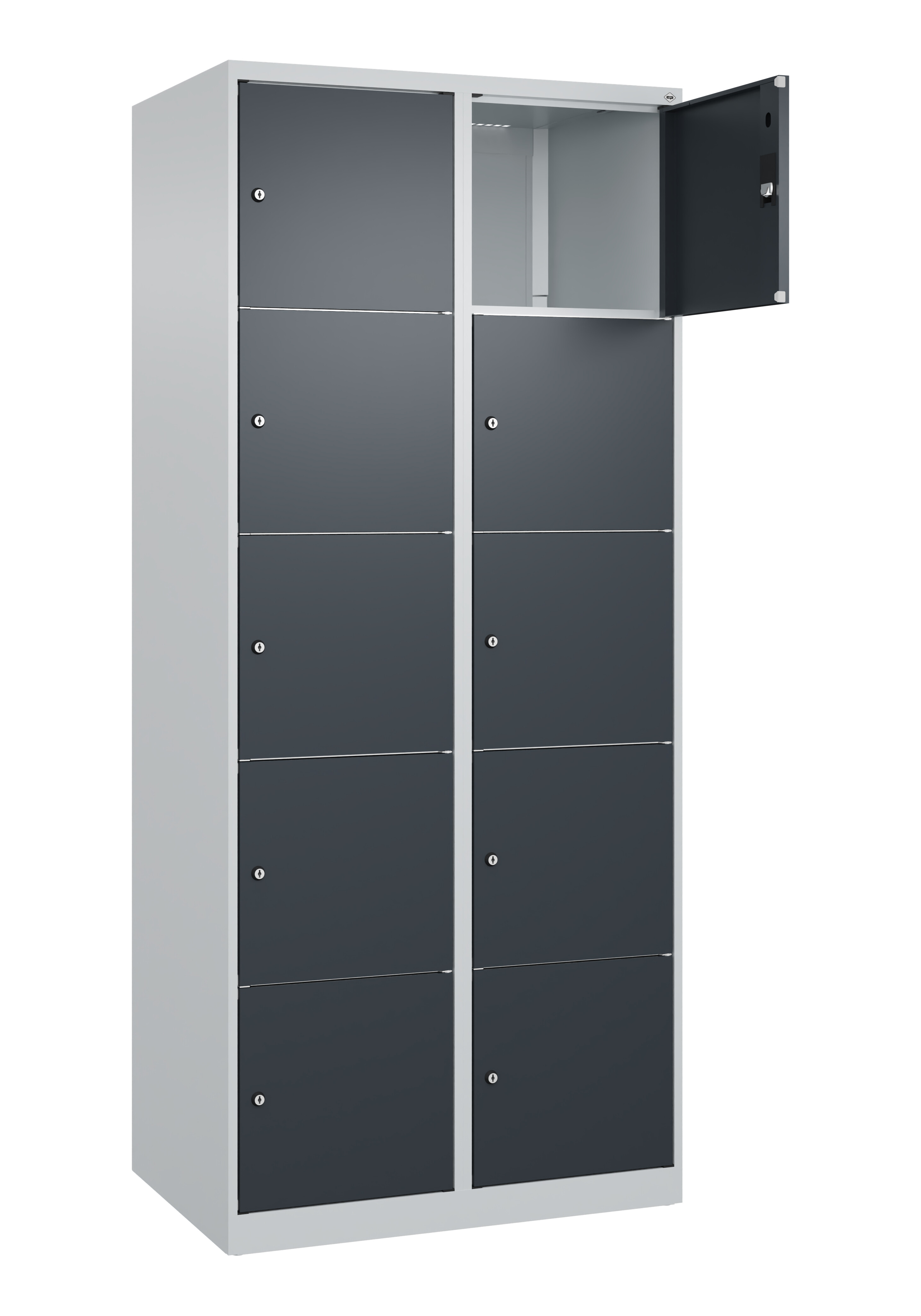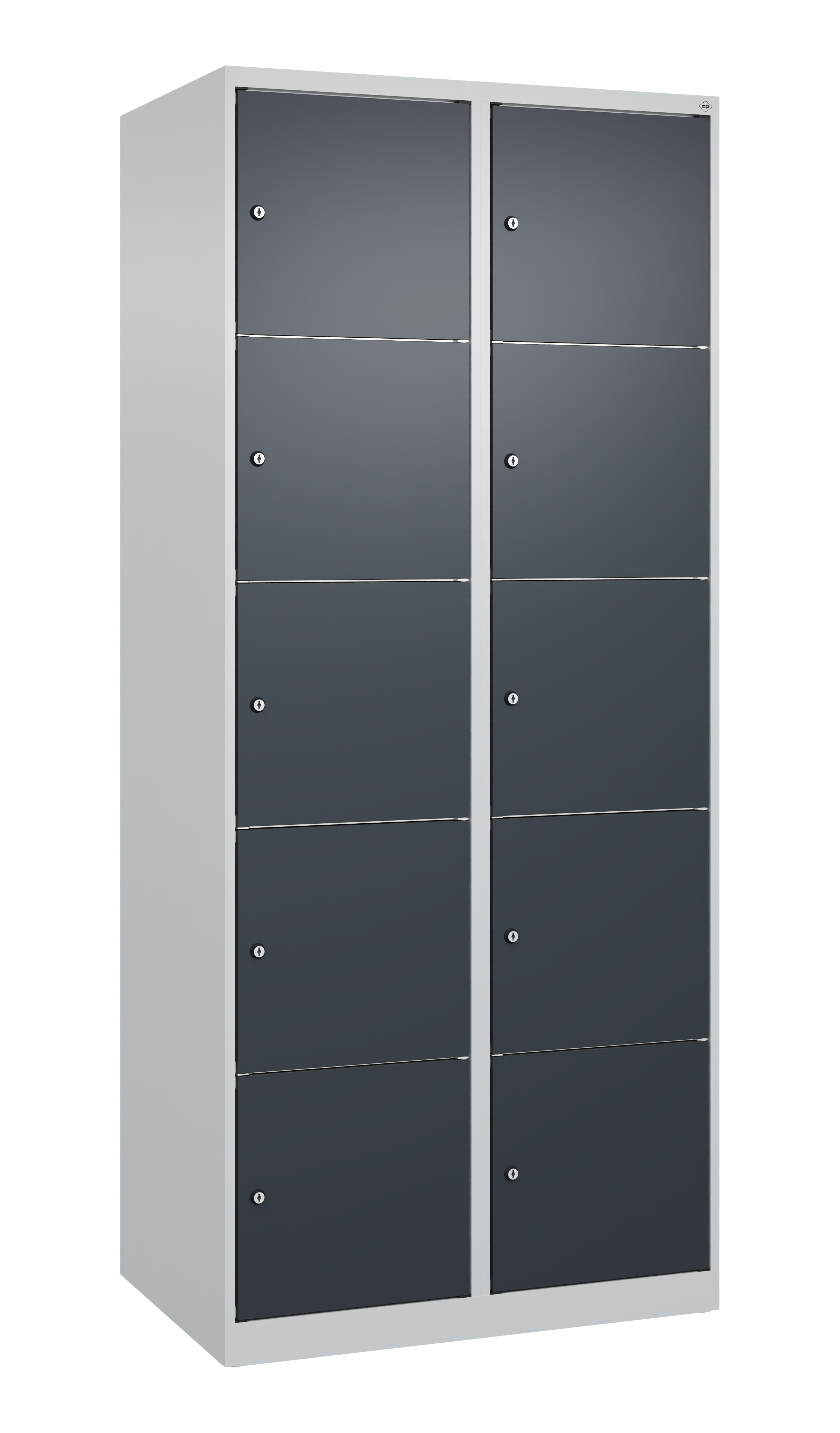 Schließfachschrank Classic PLUS, 2 Abteile mit je 5 Fächern, Abteilbreite 400 mm, Korpus aus stabiler Stahlkonstruktion mit hochwertiger Einbrennbeschichtung für hohe UV- und Korrosionsbeständigkeit, mit Bodengleitern als praktischer Schrank- und Fußbodenschutz, Türöffnungen 110 Grad, Stahl-Türen mit Soft-Anschlag und geschlossenen Seitenprofilen für hohe Stabilität, Türaufhängung in stabilen Drehbolzen, Türaufhängung rechts, 10 Zylinderschlösser mit 2 Schlüsseln, Schließkreis bis 1000 verschiedene Schließungen, Maße (H x B x T): 1850 x 800 x 500 mm, Korpus: RAL 7035 Lichtgrau, Türen Stahl: RAL 7016 Anthrazitgrau, Gewicht: 50 kg