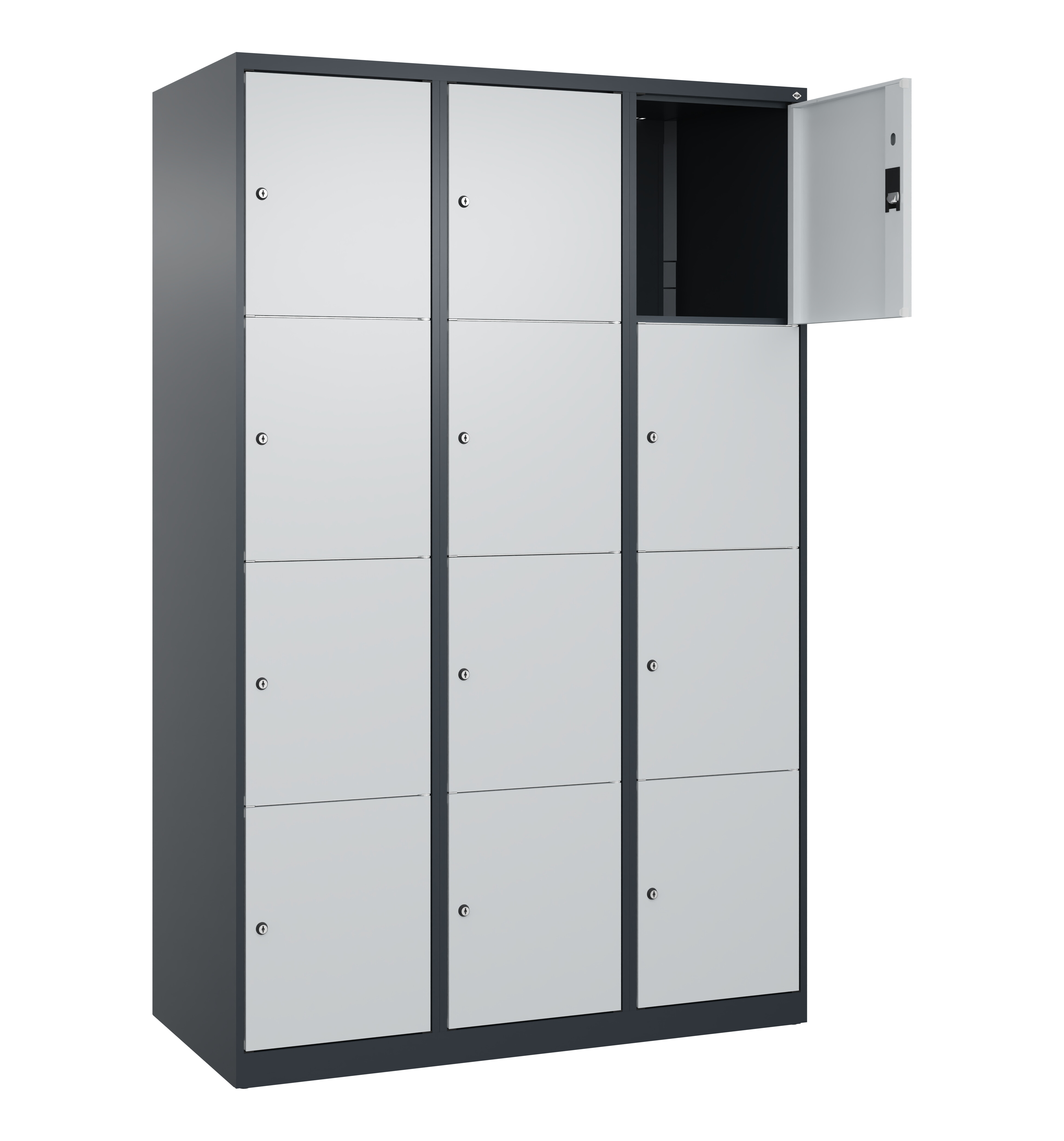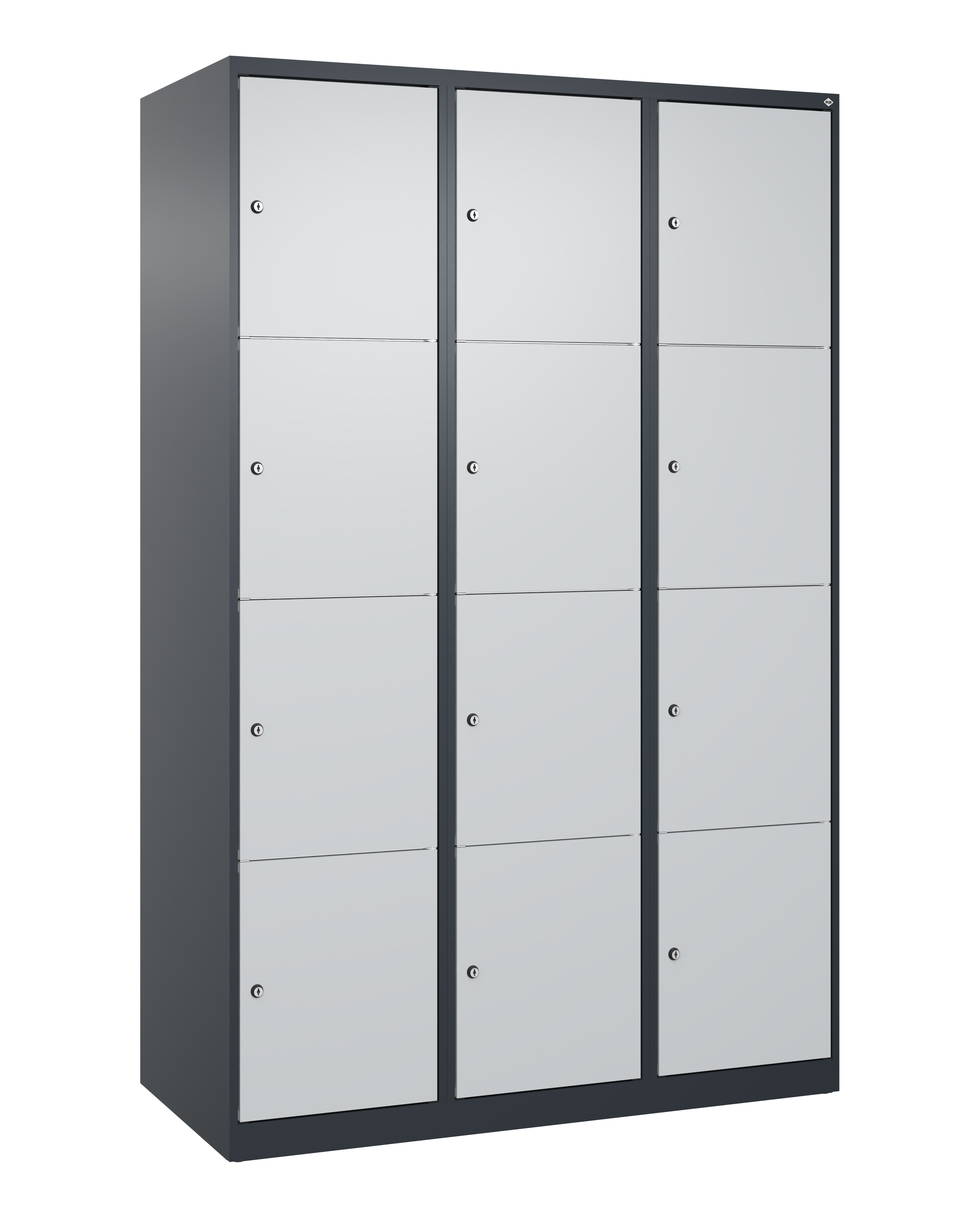 Schließfachschrank Classic PLUS, 3 Abteile mit je 4 Fächern, Abteilbreite 400 mm, Korpus aus stabiler Stahlkonstruktion mit hochwertiger Einbrennbeschichtung für hohe UV- und Korrosionsbeständigkeit, mit Bodengleitern als praktischer Schrank- und Fußbodenschutz, Türöffnungen 110 Grad, Türaufhängung rechts, Stahl-Türen mit Soft-Anschlag und geschlossenen Seitenprofilen für hohe Stabilität, Türaufhängung in stabilen Drehbolzen, 12 Zylinderschlösser mit 2 Schlüsseln, Schließkreis bis 1000 verschiedene Schließungen, Maße (H x B x T): 1850 x 1200 x 500 mm, Korpus: RAL 7016 Anthrazitgrau, Türen Stahl: RAL 7035 Lichtgrau, Gewicht: 66 kg