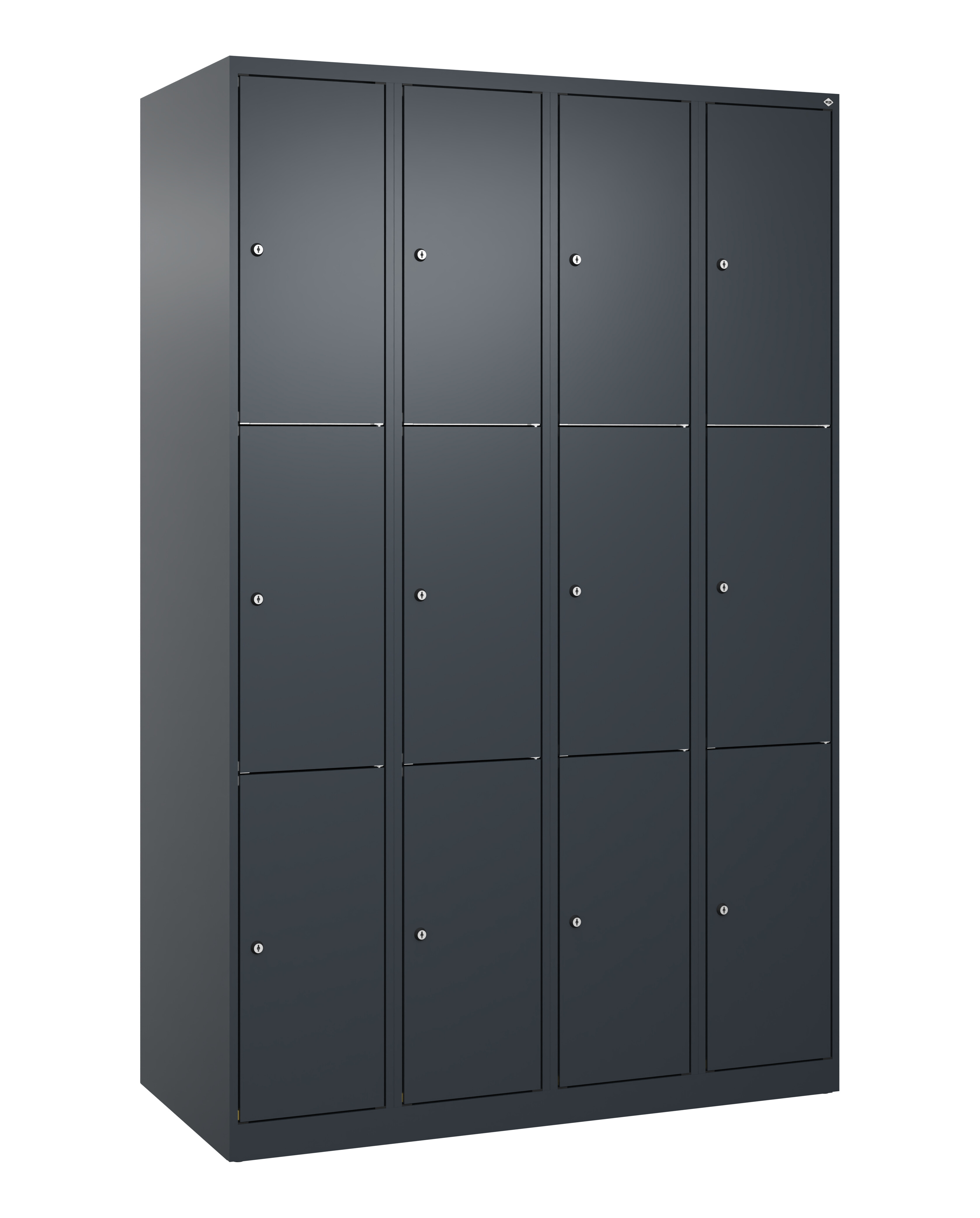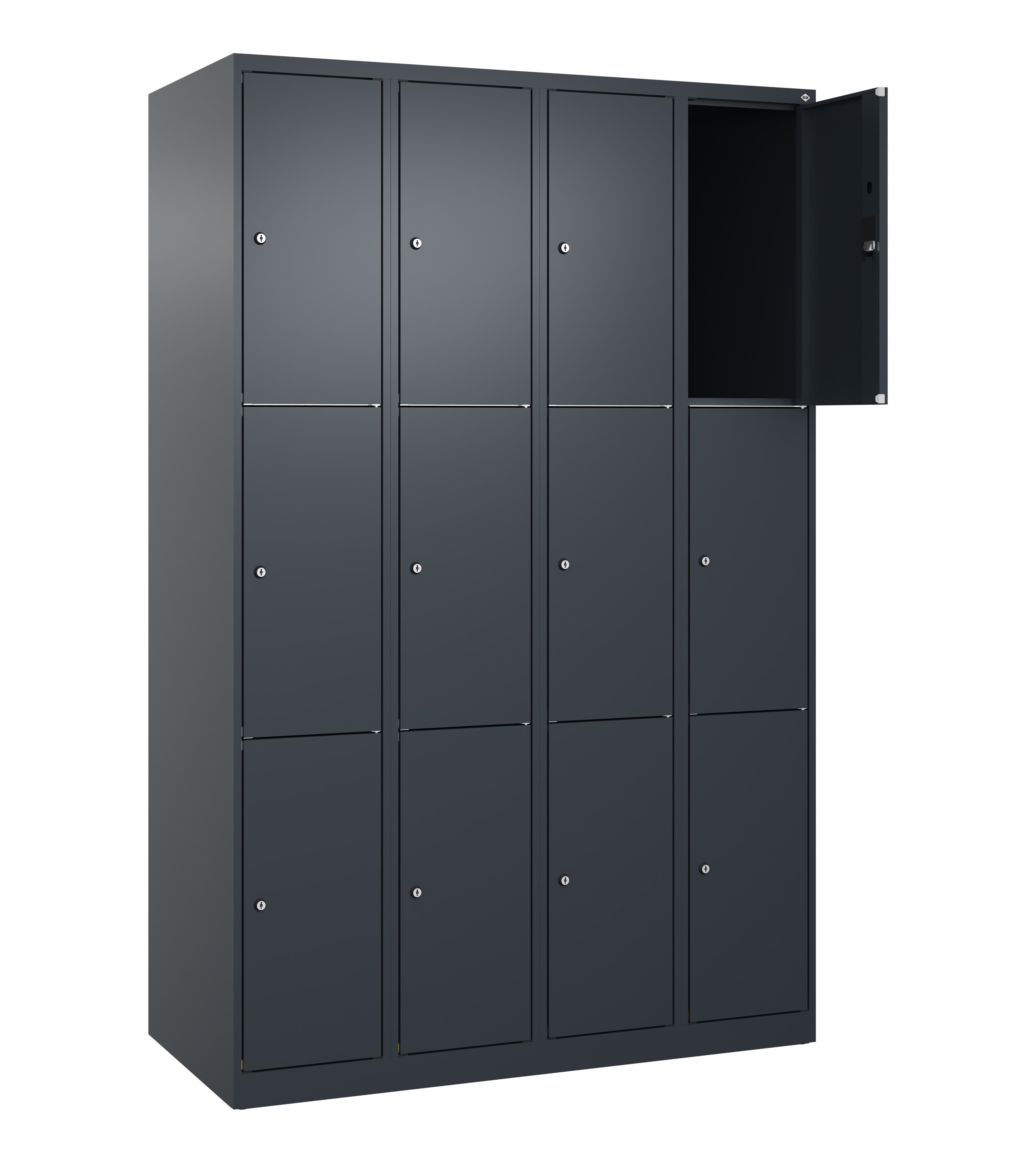 Schließfachschrank Classic PLUS, 4 Abteile mit je 3 Fächern, Abteilbreite 300 mm, Korpus aus stabiler Stahlkonstruktion mit hochwertiger Einbrennbeschichtung für hohe UV- und Korrosionsbeständigkeit, mit Bodengleitern als praktischer Schrank- und Fußbodenschutz, Türöffnungen 110 Grad, Türaufhängung rechts, Stahl-Türen mit Soft-Anschlag und geschlossenen Seitenprofilen für hohe Stabilität, Türaufhängung in stabilen Drehbolzen, 12 Zylinderschlösser mit 2 Schlüsseln, Schließkreis bis 1000 verschiedene Schließungen, Maße (H x B x T): 1850 x 1200 x 500 mm, Korpus: RAL 7016 Anthrazitgrau, Türen Stahl: RAL 7016 Anthrazitgrau, Gewicht: 67 kg