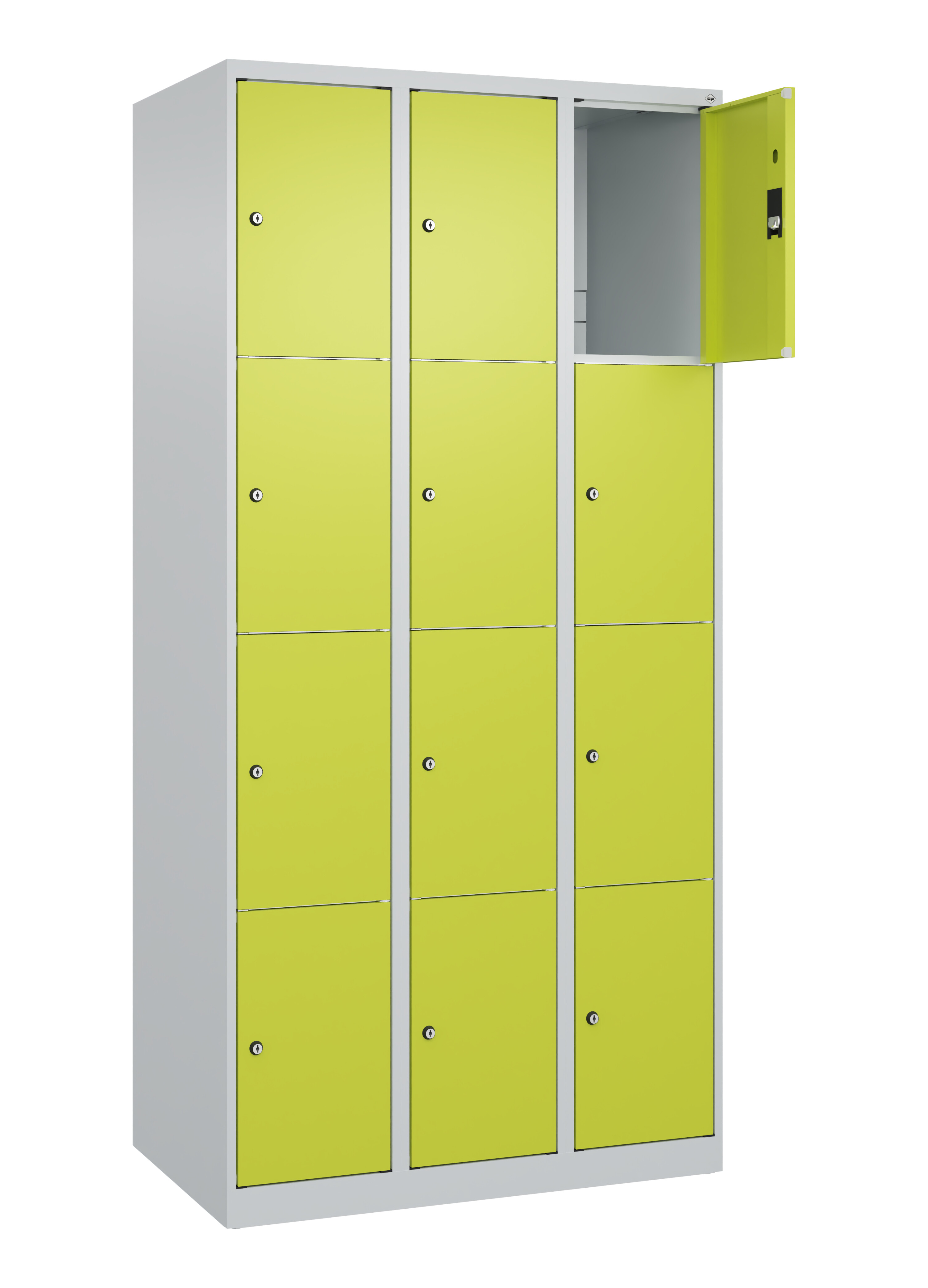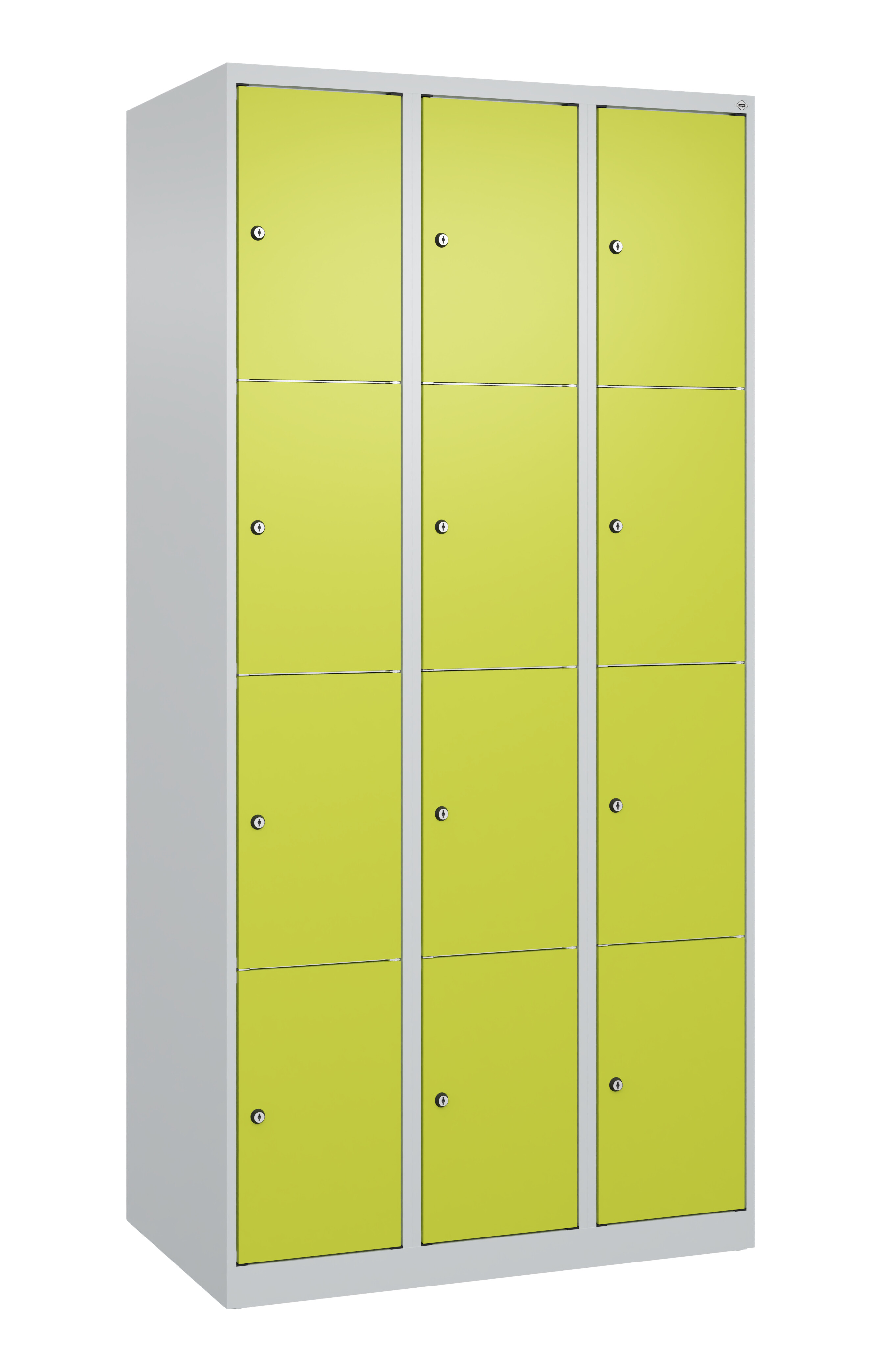 Schließfachschrank Classic PLUS, 3 Abteile mit je 4 Fächern, Abteilbreite 300 mm, Korpus aus stabiler Stahlkonstruktion mit hochwertiger Einbrennbeschichtung für hohe UV- und Korrosionsbeständigkeit, mit Bodengleitern als praktischer Schrank- und Fußbodenschutz, Türöffnungen 110 Grad, Türaufhängung rechts, Stahl-Türen mit Soft-Anschlag und geschlossenen Seitenprofilen für hohe Stabilität, Türaufhängung in stabilen Drehbolzen, 12 Zylinderschlösser mit 2 Schlüsseln, Schließkreis bis 1000 verschiedene Schließungen, Maße (H x B x T): 1850 x 900 x 500 mm, Korpus: RAL 7035 Lichtgrau, Türen Stahl: 1108060 RDS Clowngrün, Gewicht: 54 kg