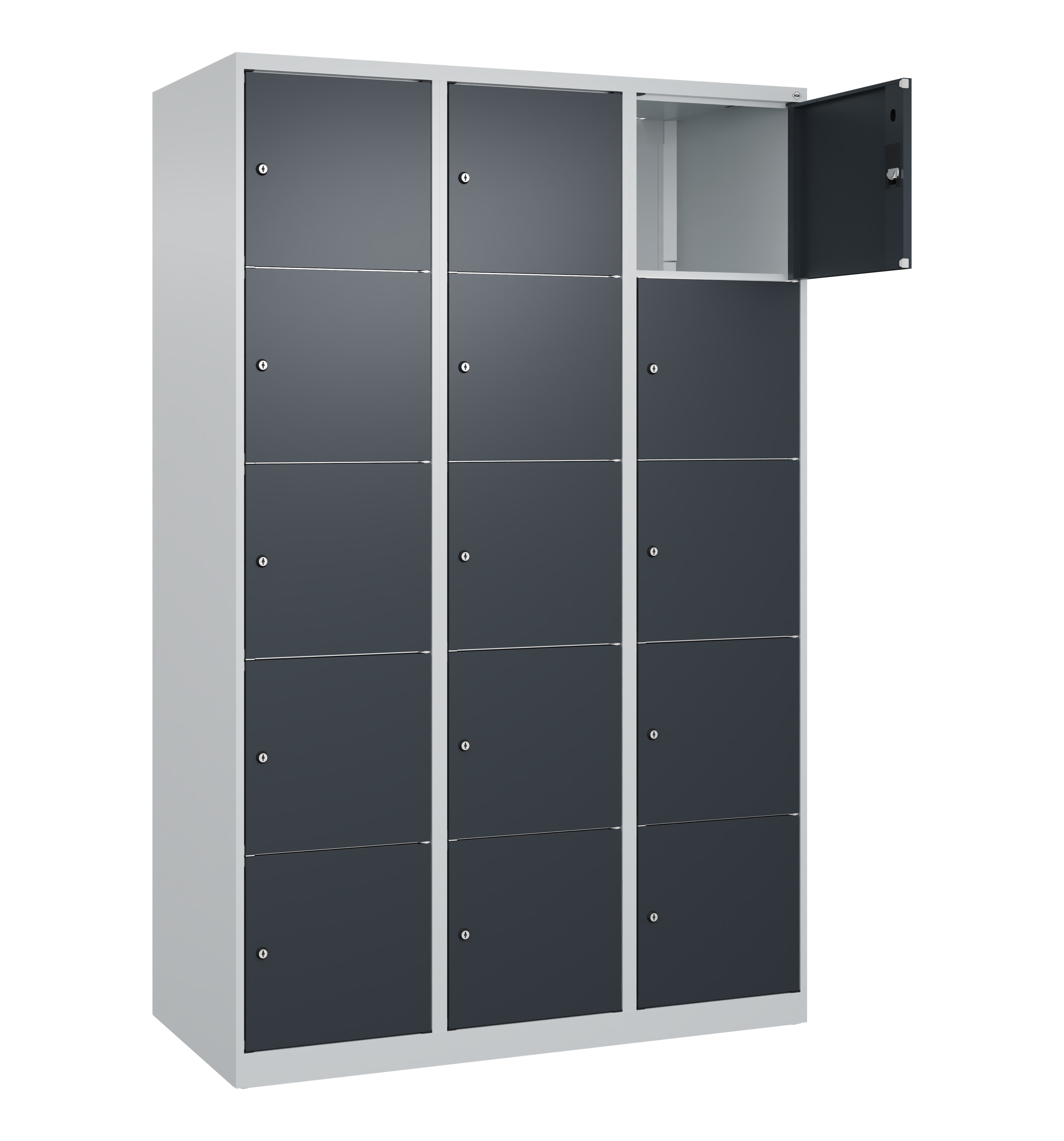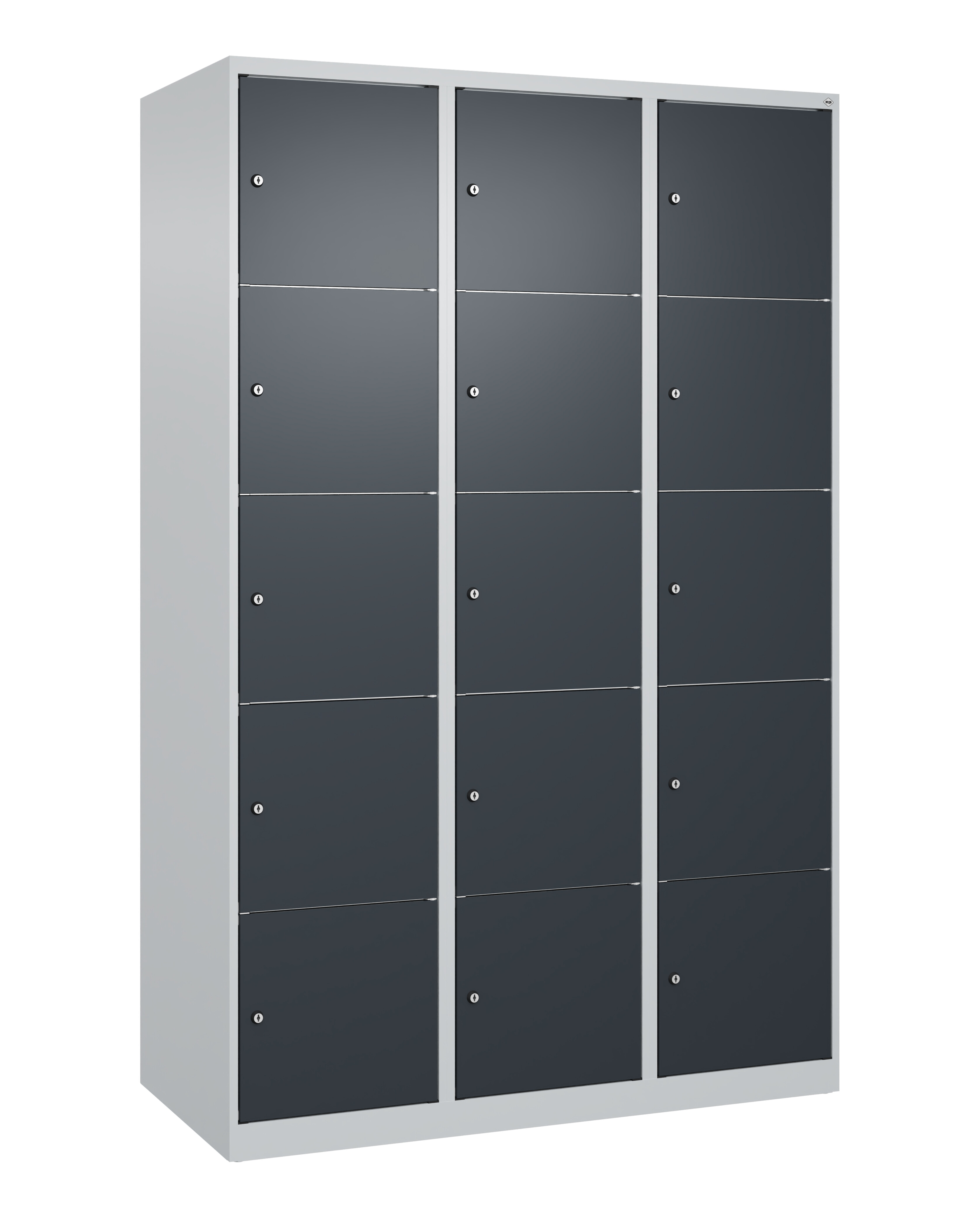 Schließfachschrank Classic PLUS, 3 Abteile mit je 5 Fächern, Abteilbreite 400 mm, Korpus aus stabiler Stahlkonstruktion mit hochwertiger Einbrennbeschichtung für hohe UV- und Korrosionsbeständigkeit, mit Bodengleitern als praktischer Schrank- und Fußbodenschutz, Türöffnungen 110 Grad, Türaufhängung rechts, Stahl-Türen mit Soft-Anschlag und geschlossenen Seitenprofilen für hohe Stabilität, Türaufhängung in stabilen Drehbolzen, 15 Zylinderschlösser mit 2 Schlüsseln, Schließkreis bis 1000 verschiedene Schließungen, Maße (H x B x T): 1850 x 1200 x 500 mm, Korpus: RAL 7035 Lichtgrau, Türen Stahl: RAL 7016 Anthrazitgrau, Gewicht: 71 kg