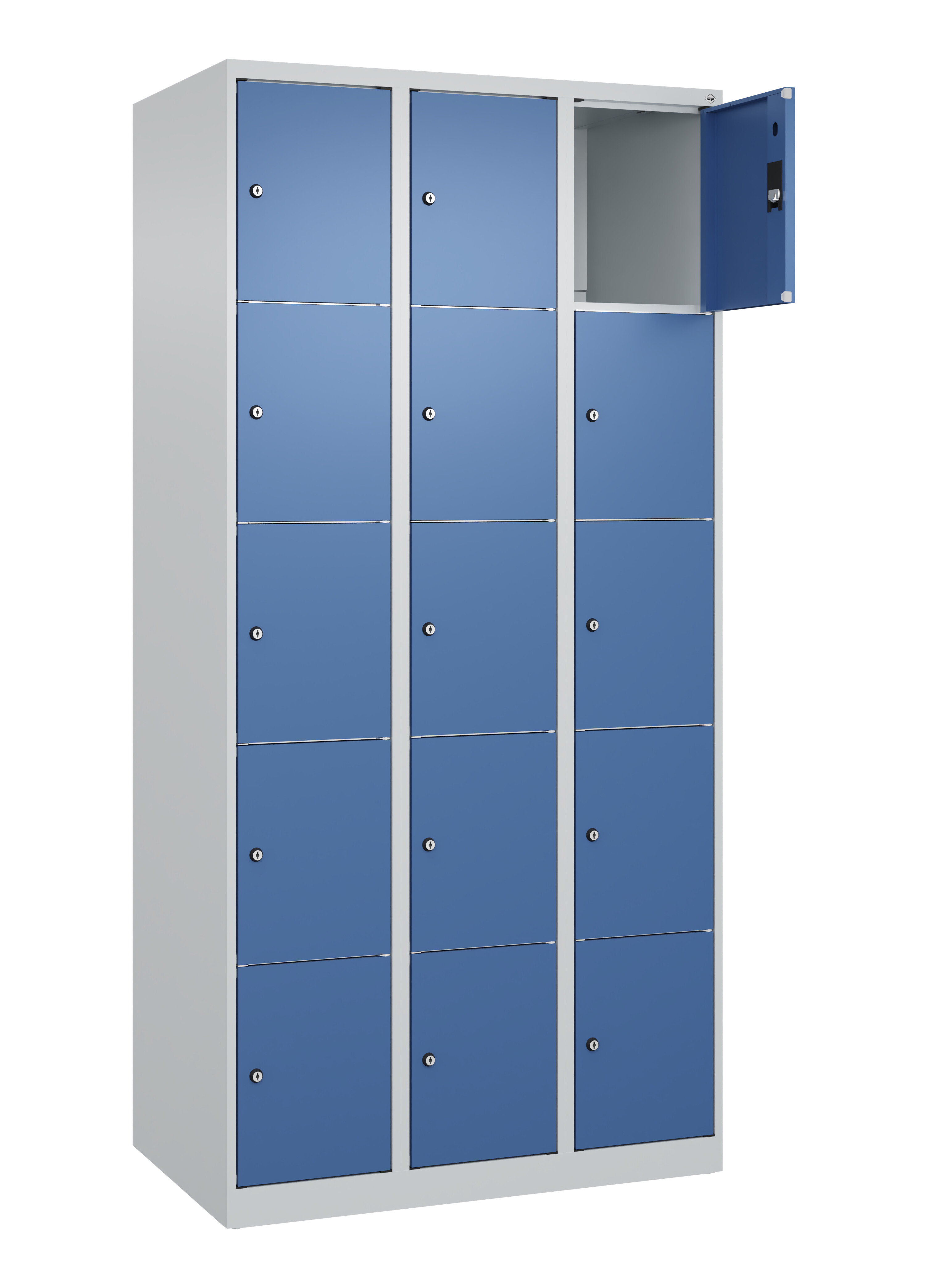 Schließfachschrank Classic PLUS, 3 Abteile mit je 5 Fächern, Abteilbreite 300 mm, Korpus aus stabiler Stahlkonstruktion mit hochwertiger Einbrennbeschichtung für hohe UV- und Korrosionsbeständigkeit, mit Bodengleitern als praktischer Schrank- und Fußbodenschutz, Türöffnungen 110 Grad, Türaufhängung rechts, Stahl-Türen mit Soft-Anschlag und geschlossenen Seitenprofilen für hohe Stabilität, Türaufhängung in stabilen Drehbolzen, 15 Zylinderschlösser mit 2 Schlüsseln, Schließkreis bis 1000 verschiedene Schließungen, Maße (H x B x T): 1850 x 900 x 500 mm, Korpus: RAL 7035 Lichtgrau, Türen Stahl: RAL 5023 Fernblau, Gewicht: 58 kg