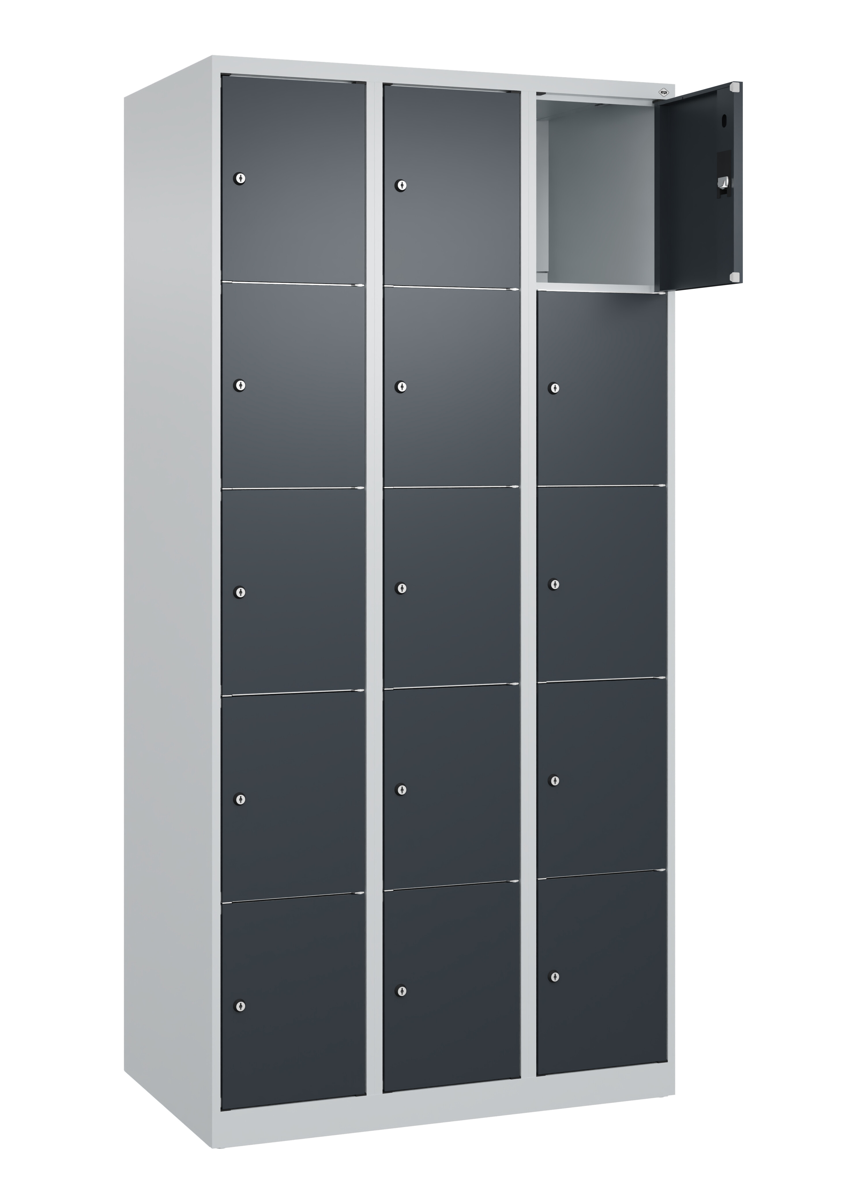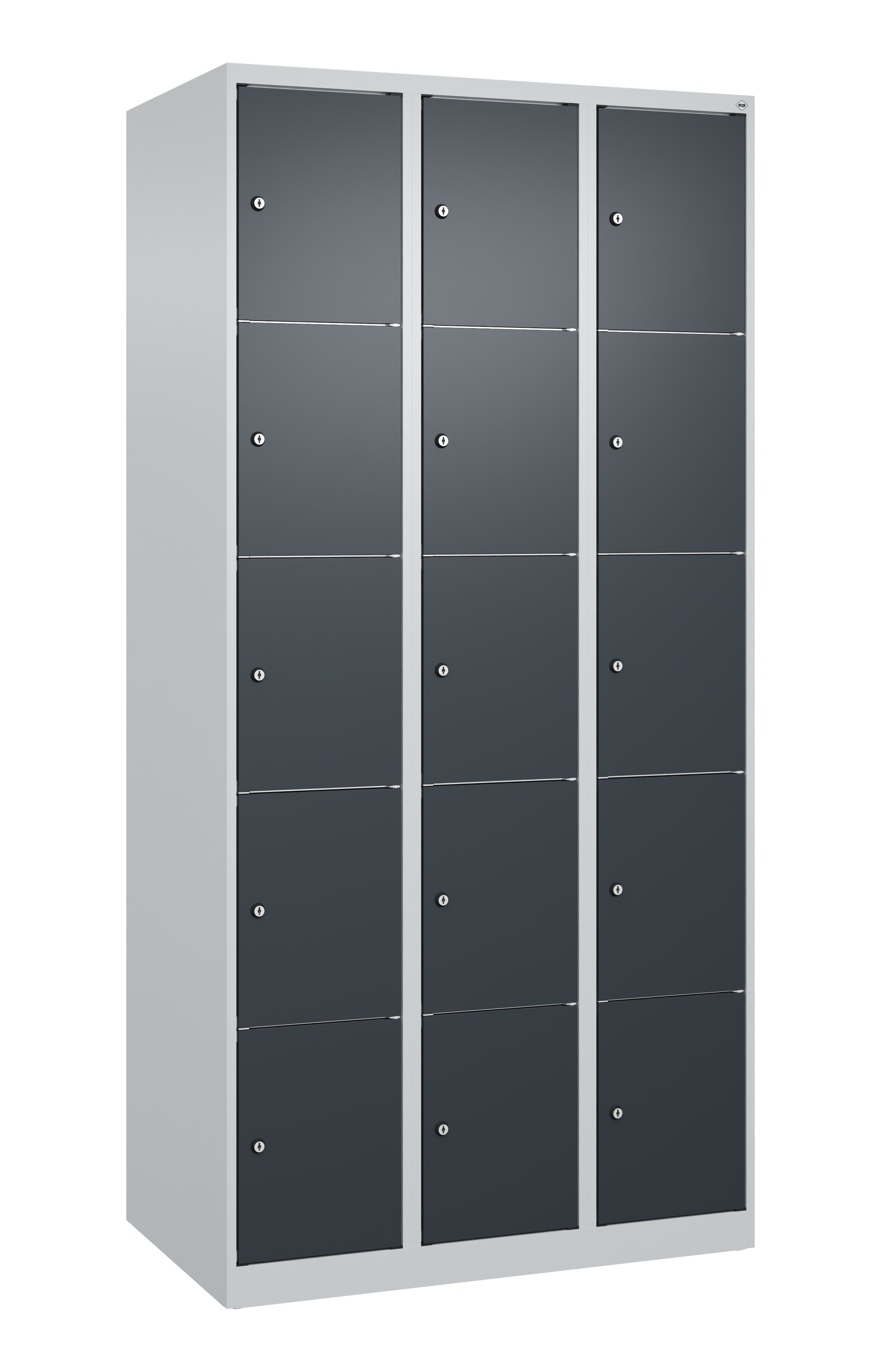 Schließfachschrank Classic PLUS, 3 Abteile mit je 5 Fächern, Abteilbreite 300 mm, Korpus aus stabiler Stahlkonstruktion mit hochwertiger Einbrennbeschichtung für hohe UV- und Korrosionsbeständigkeit, mit Bodengleitern als praktischer Schrank- und Fußbodenschutz, Türöffnungen 110 Grad, Türaufhängung rechts, Stahl-Türen mit Soft-Anschlag und geschlossenen Seitenprofilen für hohe Stabilität, Türaufhängung in stabilen Drehbolzen, 15 Zylinderschlösser mit 2 Schlüsseln, Schließkreis bis 1000 verschiedene Schließungen, Maße (H x B x T): 1850 x 900 x 500 mm, Korpus: RAL 7035 Lichtgrau, Türen Stahl: RAL 7016 Anthrazitgrau, Gewicht: 58 kg