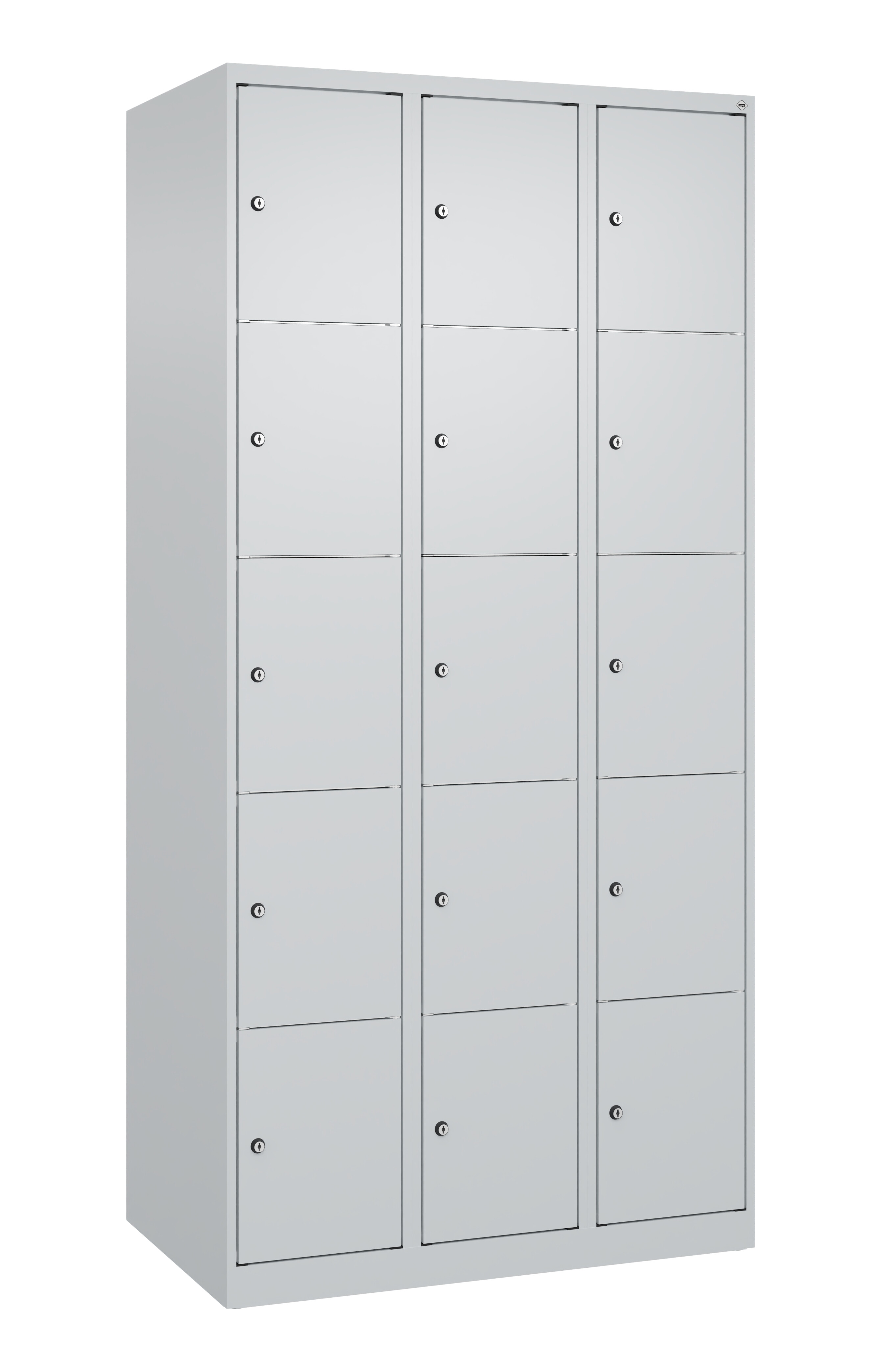 Schließfachschrank Classic PLUS, 3 Abteile mit je 5 Fächern, Abteilbreite 300 mm, Korpus aus stabiler Stahlkonstruktion mit hochwertiger Einbrennbeschichtung für hohe UV- und Korrosionsbeständigkeit, mit Bodengleitern als praktischer Schrank- und Fußbodenschutz, Türöffnungen 110 Grad, Türaufhängung rechts, Stahl-Türen mit Soft-Anschlag und geschlossenen Seitenprofilen für hohe Stabilität, Türaufhängung in stabilen Drehbolzen, 15 Zylinderschlösser mit 2 Schlüsseln, Schließkreis bis 1000 verschiedene Schließungen, Maße (H x B x T): 1850 x 900 x 500 mm, Korpus: RAL 7035 Lichtgrau, Türen Stahl: RAL 7035 Lichtgrau, Gewicht: 58 kg