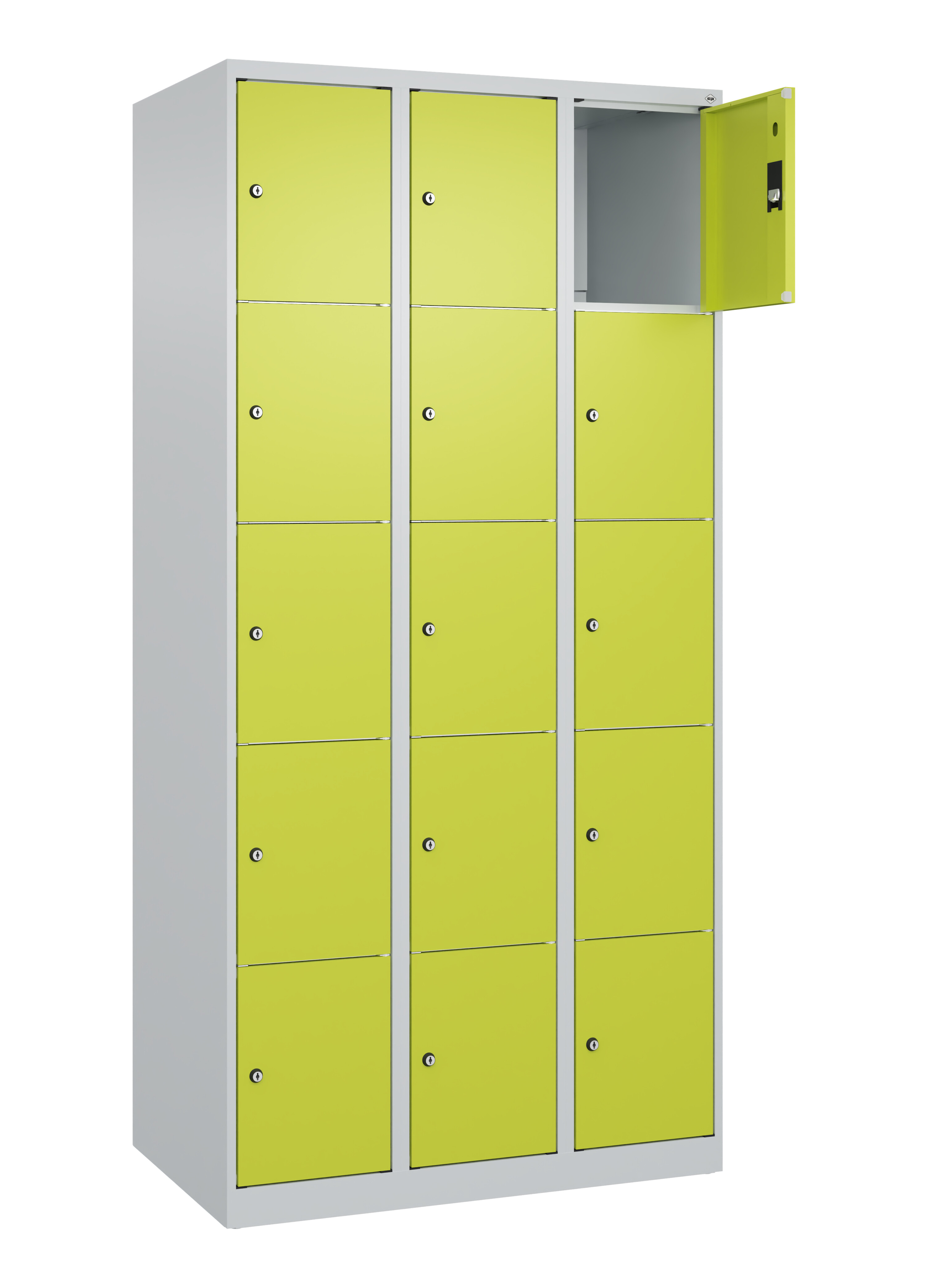 Schließfachschrank Classic PLUS, 3 Abteile mit je 5 Fächern, Abteilbreite 300 mm, Korpus aus stabiler Stahlkonstruktion mit hochwertiger Einbrennbeschichtung für hohe UV- und Korrosionsbeständigkeit, mit Bodengleitern als praktischer Schrank- und Fußbodenschutz, Türöffnungen 110 Grad, Türaufhängung rechts, Stahl-Türen mit Soft-Anschlag und geschlossenen Seitenprofilen für hohe Stabilität, Türaufhängung in stabilen Drehbolzen, 15 Zylinderschlösser mit 2 Schlüsseln, Schließkreis bis 1000 verschiedene Schließungen, Maße (H x B x T): 1850 x 900 x 500 mm, Korpus: RAL 7035 Lichtgrau, Türen Stahl: 1108060 RDS Clowngrün, Gewicht: 58 kg