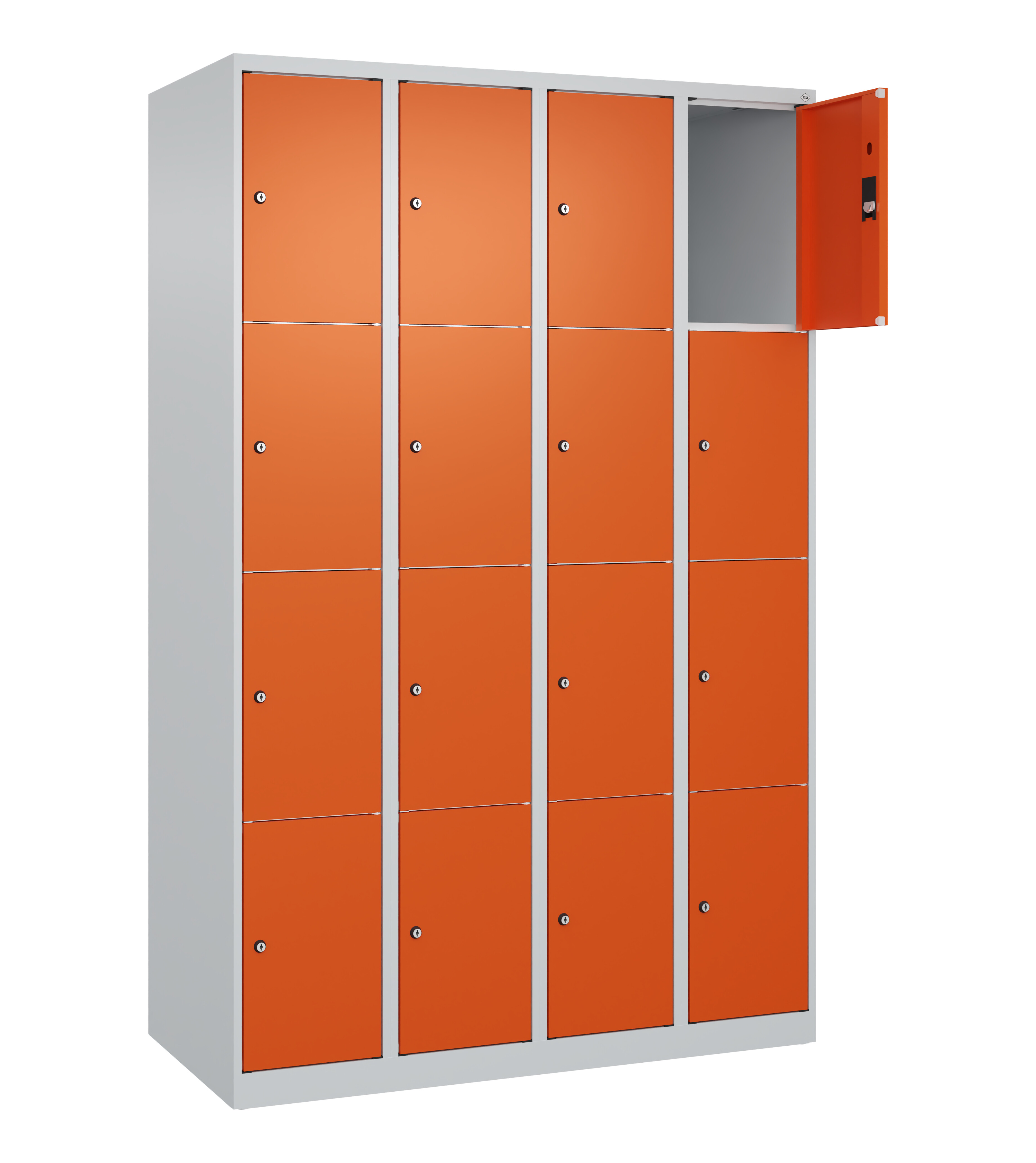 Schließfachschrank Classic PLUS, 4 Abteile mit je 4 Fächern, Abteilbreite 300 mm, Korpus aus stabiler Stahlkonstruktion mit hochwertiger Einbrennbeschichtung für hohe UV- und Korrosionsbeständigkeit, mit Bodengleitern als praktischer Schrank- und Fußbodenschutz, Türöffnungen 110 Grad, Türaufhängung rechts, Stahl-Türen mit Soft-Anschlag und geschlossenen Seitenprofilen für hohe Stabilität, Türaufhängung in stabilen Drehbolzen, 16 Zylinderschlösser mit 2 Schlüsseln, Schließkreis bis 1000 verschiedene Schließungen, Maße (H x B x T): 1850 x 1200 x 500 mm, Korpus: RAL 7035 Lichtgrau, Türen Stahl: RAL 2004 Reinorange, Gewicht: 71 kg