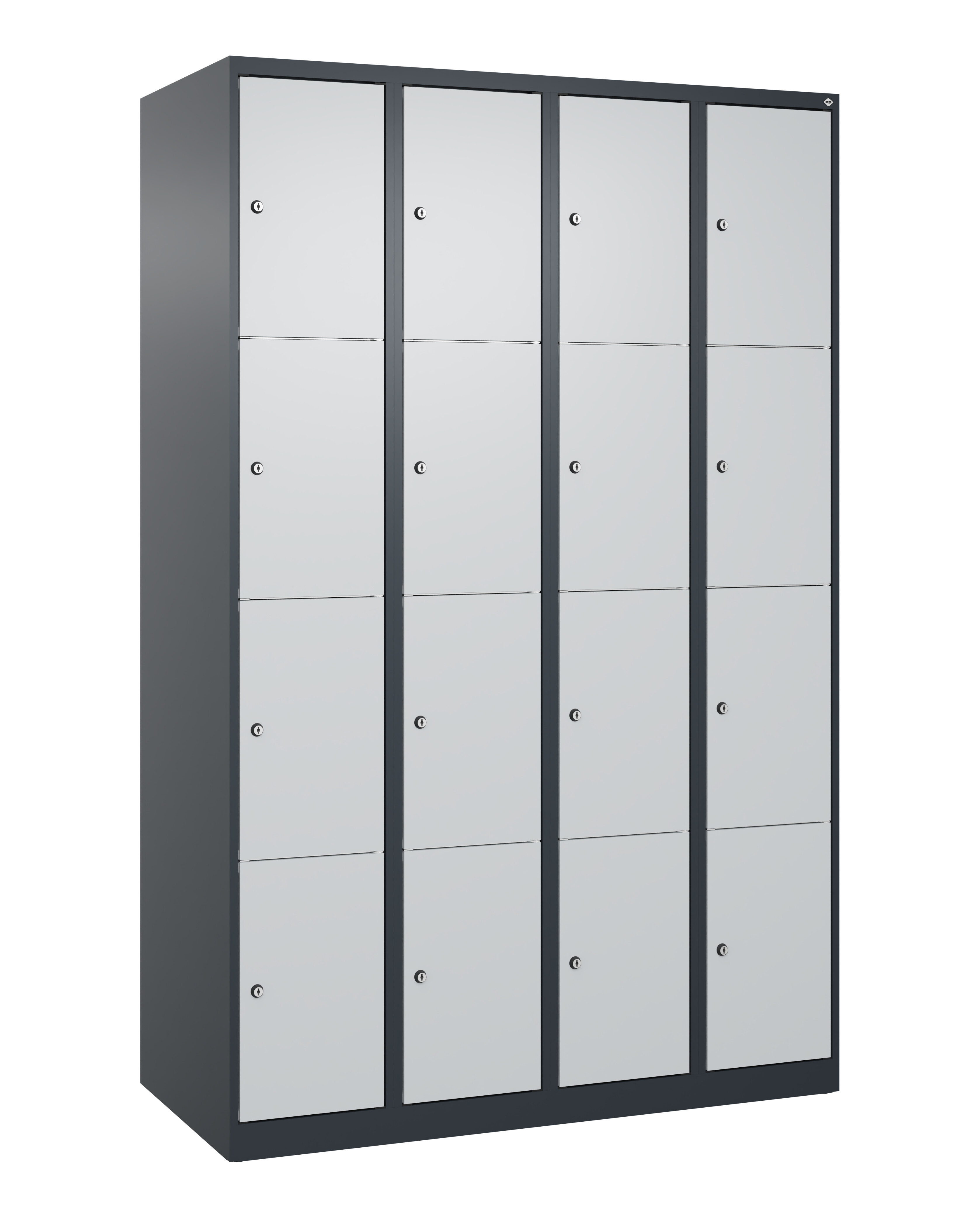 Schließfachschrank Classic PLUS, 4 Abteile mit je 4 Fächern, Abteilbreite 300 mm, Korpus aus stabiler Stahlkonstruktion mit hochwertiger Einbrennbeschichtung für hohe UV- und Korrosionsbeständigkeit, mit Bodengleitern als praktischer Schrank- und Fußbodenschutz, Türöffnungen 110 Grad, Türaufhängung rechts, Stahl-Türen mit Soft-Anschlag und geschlossenen Seitenprofilen für hohe Stabilität, Türaufhängung in stabilen Drehbolzen, 16 Zylinderschlösser mit 2 Schlüsseln, Schließkreis bis 1000 verschiedene Schließungen, Maße (H x B x T): 1850 x 1200 x 500 mm, Korpus: RAL 7016 Anthrazitgrau, Türen Stahl: RAL 7035 Lichtgrau, Gewicht: 71 kg
