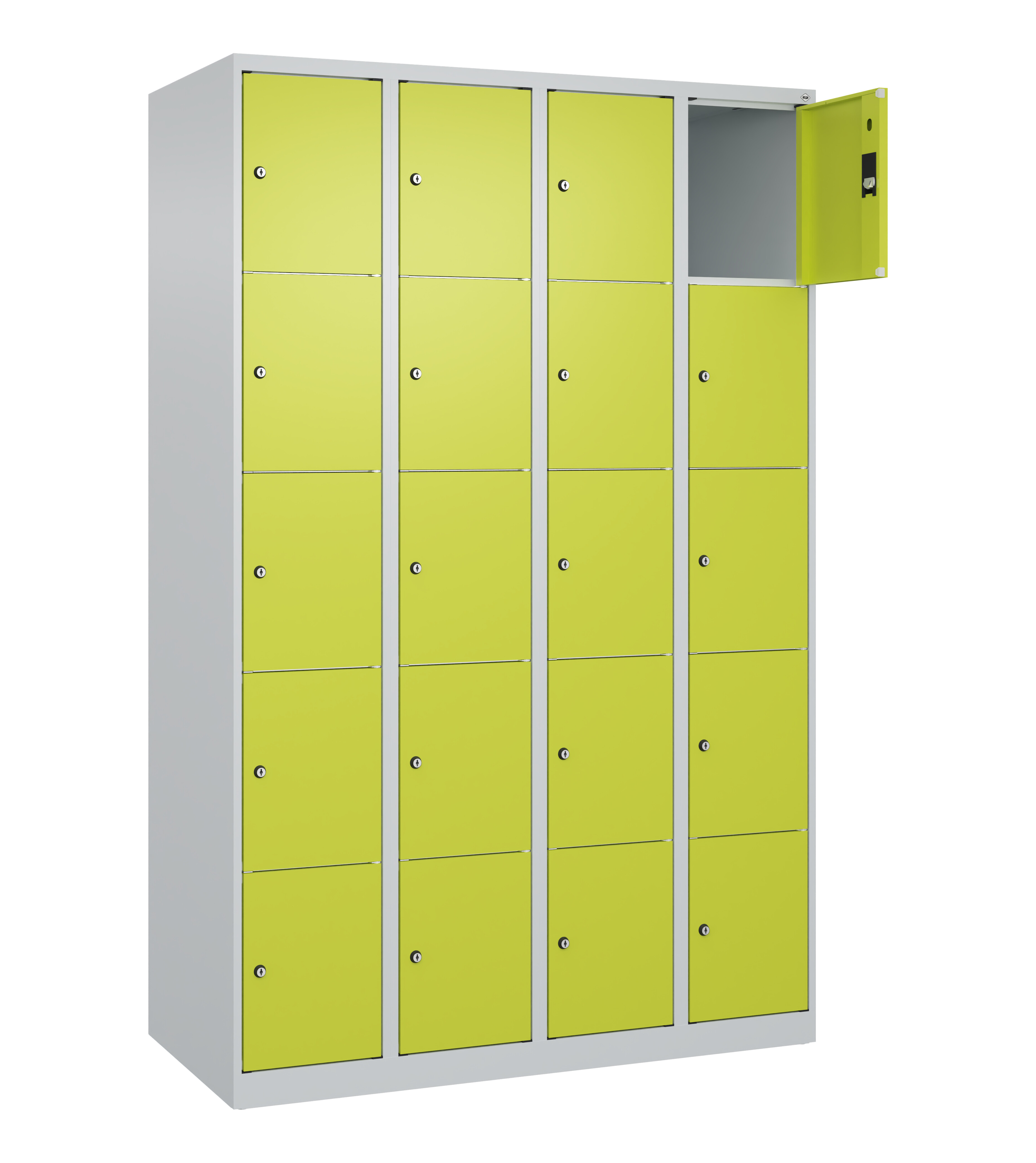 Schließfachschrank Classic PLUS, 4 Abteile mit je 5 Fächern, Abteilbreite 300 mm, Korpus aus stabiler Stahlkonstruktion mit hochwertiger Einbrennbeschichtung für hohe UV- und Korrosionsbeständigkeit, mit Bodengleitern als praktischer Schrank- und Fußbodenschutz, Türöffnungen 110 Grad, Türaufhängung rechts, Stahl-Türen mit Soft-Anschlag und geschlossenen Seitenprofilen für hohe Stabilität, Türaufhängung in stabilen Drehbolzen, 20 Zylinderschlösser mit 2 Schlüsseln, Schließkreis bis 1000 verschiedene Schließungen, Maße (H x B x T): 1850 x 1200 x 500 mm, Korpus: RAL 7035 Lichtgrau, Türen Stahl: 1108060 RDS Clowngrün, Gewicht: 76 kg