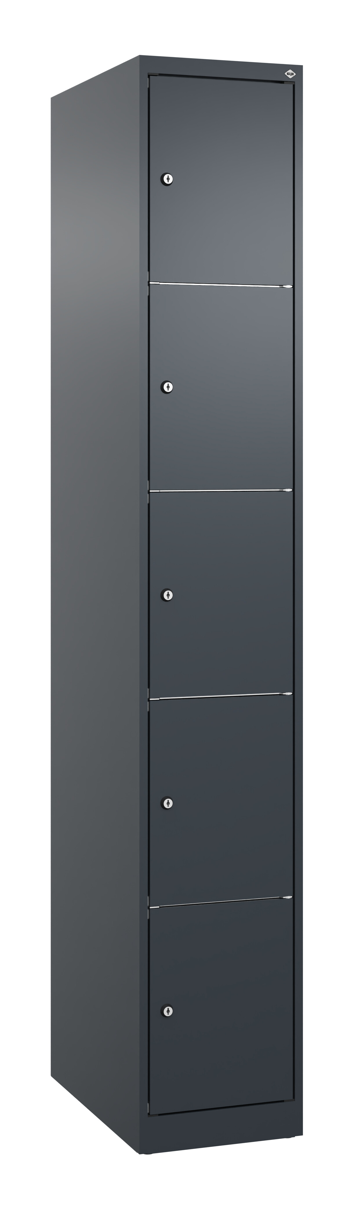 Schließfachschrank Classic PLUS, 1 Abteil mit 5 Fächern, Abteilbreite 300 mm, Korpus aus stabiler Stahlkonstruktion mit hochwertiger Einbrennbeschichtung für hohe UV- und Korrosionsbeständigkeit, mit Bodengleitern als praktischer Schrank- und Fußbodenschutz, Türöffnungen 110 Grad, Türaufhängung rechts, Stahl-Türen mit Soft-Anschlag und geschlossenen Seitenprofilen für hohe Stabilität, Türaufhängung in stabilen Drehbolzen, 5 Zylinderschlösser mit 2 Schlüsseln, Schließkreis bis 1000 verschiedene Schließungen, Maße (H x B x T): 1850 x 300 x 500 mm, Korpus: RAL 7016 Anthrazitgrau, Türen Stahl: RAL 7016 Anthrazitgrau, Gewicht: 24 kg