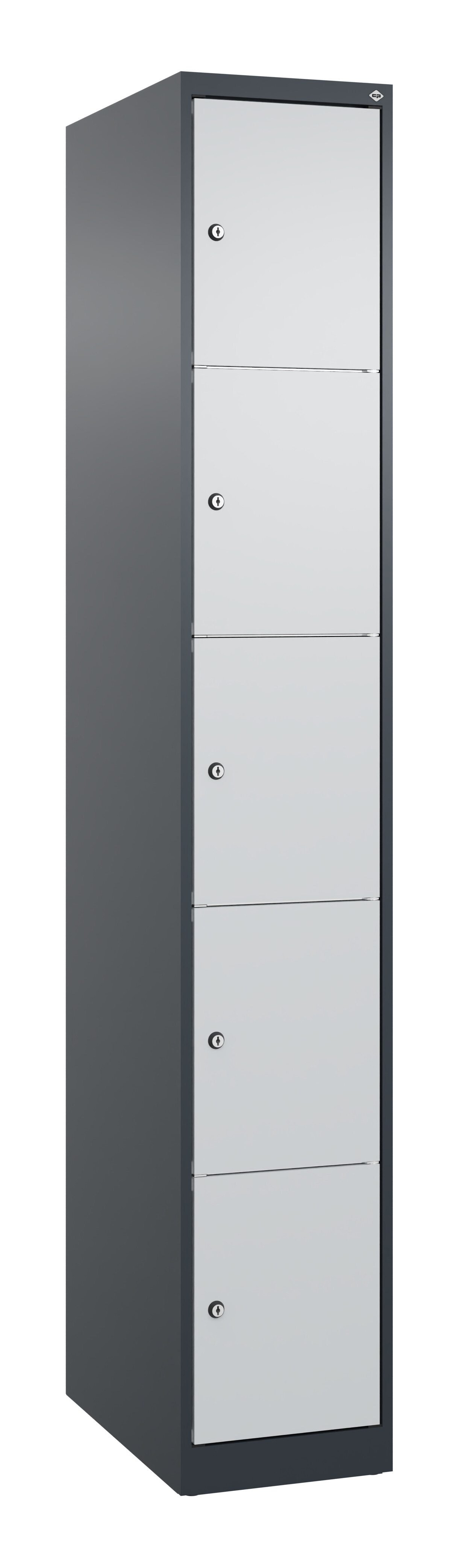 Schließfachschrank Classic PLUS, 1 Abteil mit 5 Fächern, Abteilbreite 300 mm, Korpus aus stabiler Stahlkonstruktion mit hochwertiger Einbrennbeschichtung für hohe UV- und Korrosionsbeständigkeit, mit Bodengleitern als praktischer Schrank- und Fußbodenschutz, Türöffnungen 110 Grad, Türaufhängung rechts, Stahl-Türen mit Soft-Anschlag und geschlossenen Seitenprofilen für hohe Stabilität, Türaufhängung in stabilen Drehbolzen, 5 Zylinderschlösser mit 2 Schlüsseln, Schließkreis bis 1000 verschiedene Schließungen, Maße (H x B x T): 1850 x 300 x 500 mm, Korpus: RAL 7016 Anthrazitgrau, Türen Stahl: RAL 7035 Lichtgrau, Gewicht: 24 kg