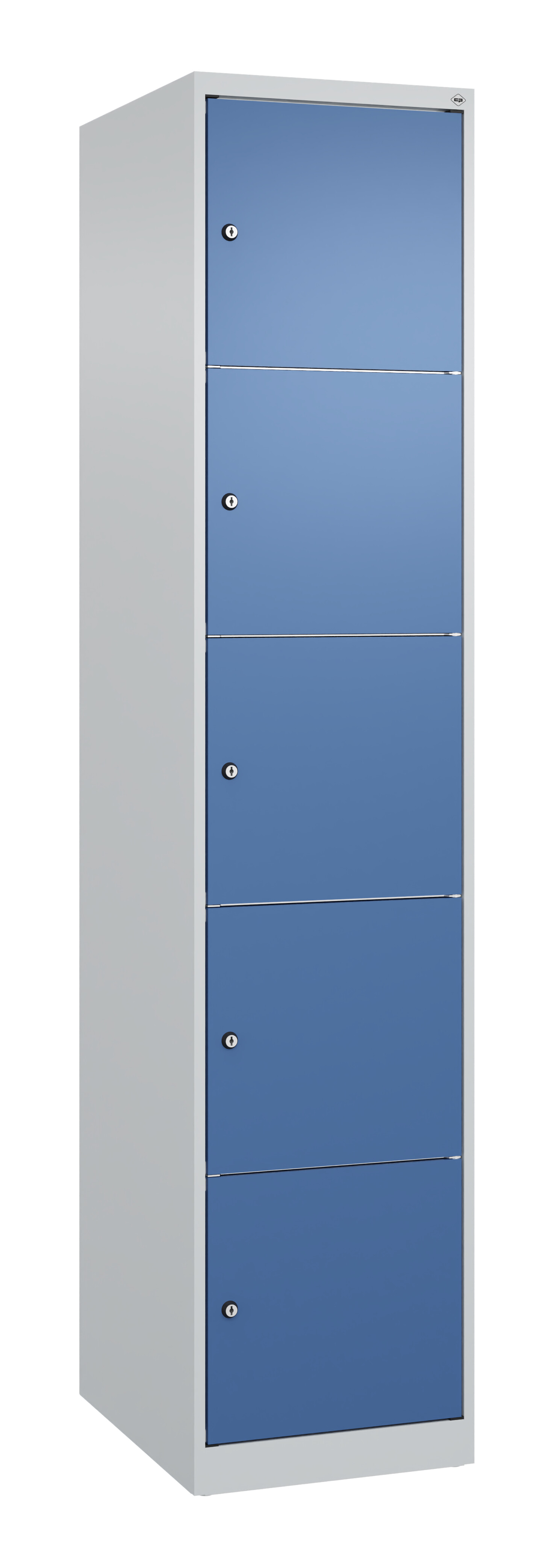 Schließfachschrank Classic PLUS, 1 Abteil mit 5 Fächern, Abteilbreite 400 mm, Korpus aus stabiler Stahlkonstruktion mit hochwertiger Einbrennbeschichtung für hohe UV- und Korrosionsbeständigkeit, mit Bodengleitern als praktischer Schrank- und Fußbodenschutz, Türöffnungen 110 Grad, Türaufhängung rechts, Stahl-Türen mit Soft-Anschlag und geschlossenen Seitenprofilen für hohe Stabilität, Türaufhängung in stabilen Drehbolzen, 5 Zylinderschlösser mit 2 Schlüsseln, Schließkreis bis 1000 verschiedene Schließungen, Maße (H x B x T): 1850 x 400 x 500 mm, Korpus: RAL 7035 Lichtgrau, Türen Stahl: RAL 5023 Fernblau, Gewicht: 28 kg