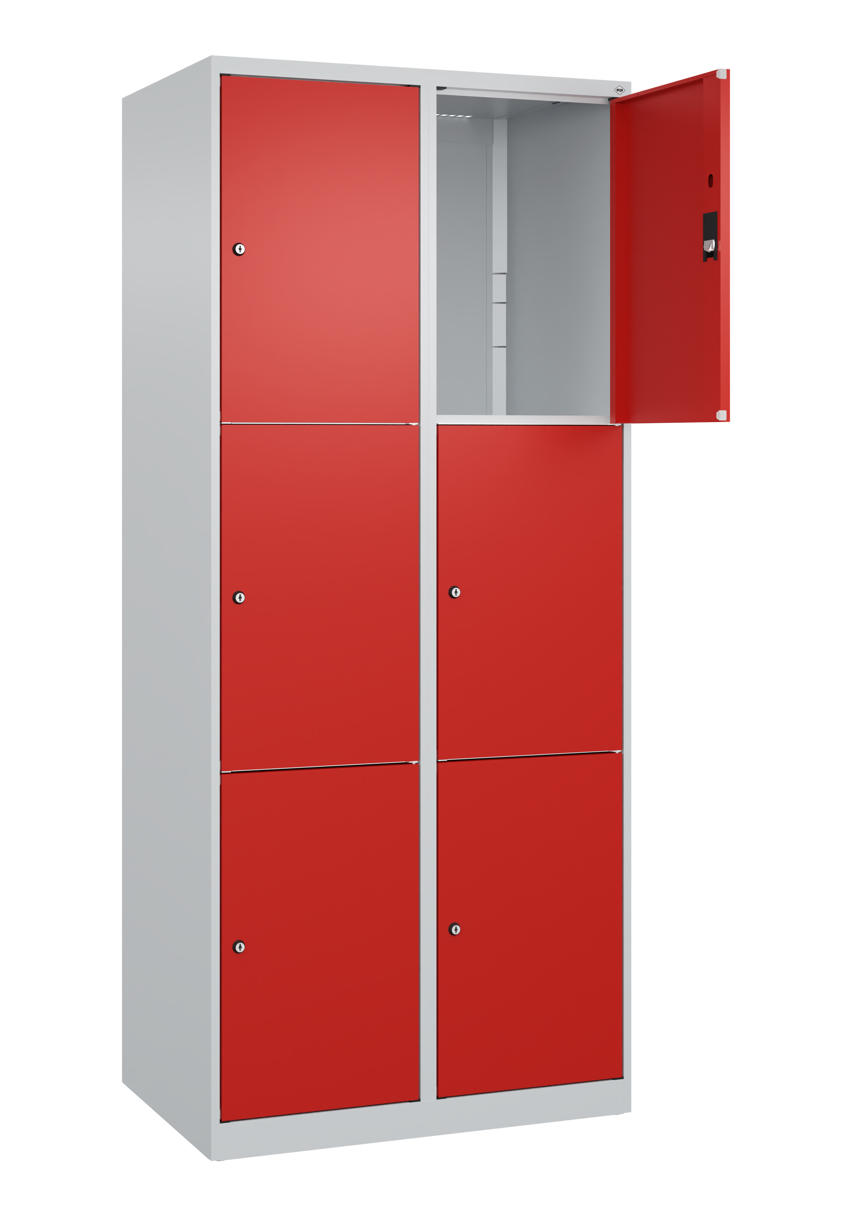 Schließfachschrank Classic PLUS, 2 Abteile mit je 3 Fächern, Abteilbreite 400 mm, Korpus aus stabiler Stahlkonstruktion mit hochwertiger Einbrennbeschichtung für hohe UV- und Korrosionsbeständigkeit, mit Bodengleitern als praktischer Schrank- und Fußbodenschutz, Türöffnungen 110 Grad, Stahl-Türen mit Soft-Anschlag und geschlossenen Seitenprofilen für hohe Stabilität, Türaufhängung in stabilen Drehbolzen, Türaufhängung rechts, 6 Zylinderschlösser mit 2 Schlüsseln, Schließkreis bis 1000 verschiedene Schließungen, Maße (H x B x T): 1850 x 800 x 500 mm, Korpus: RAL 7035 Lichtgrau, Türen Stahl: RAL 3020 Verkehrsrot, Gewicht: 44 kg