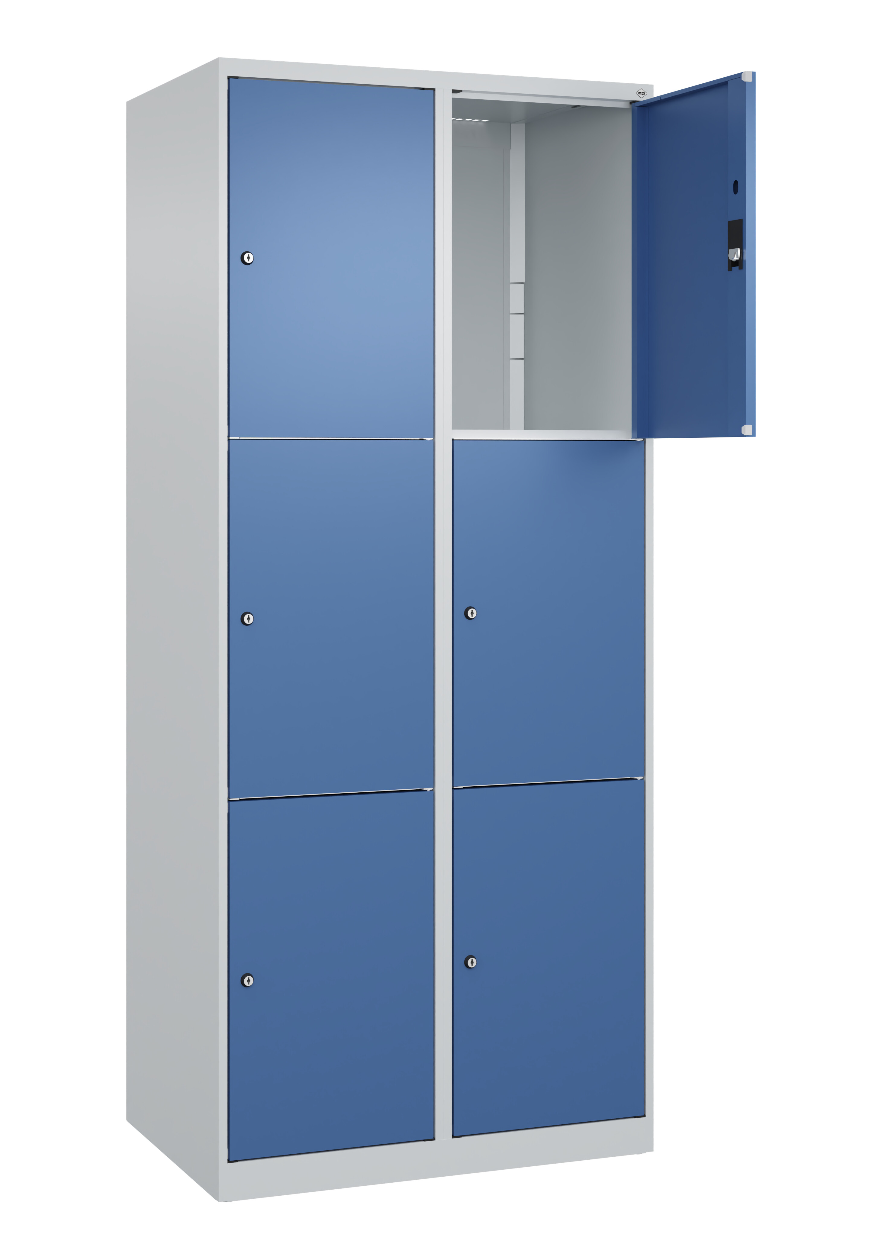 Schließfachschrank Classic PLUS, 2 Abteile mit je 3 Fächern, Abteilbreite 400 mm, Korpus aus stabiler Stahlkonstruktion mit hochwertiger Einbrennbeschichtung für hohe UV- und Korrosionsbeständigkeit, mit Bodengleitern als praktischer Schrank- und Fußbodenschutz, Türöffnungen 110 Grad, Türaufhängung rechts, Stahl-Türen mit Soft-Anschlag und geschlossenen Seitenprofilen für hohe Stabilität, Türaufhängung in stabilen Drehbolzen, 6 Zylinderschlösser mit 2 Schlüsseln, Schließkreis bis 1000 verschiedene Schließungen, Maße (H x B x T): 1850 x 800 x 500 mm, Korpus: RAL 7035 Lichtgrau, Türen Stahl: RAL 5023 Fernblau, Gewicht: 44 kg