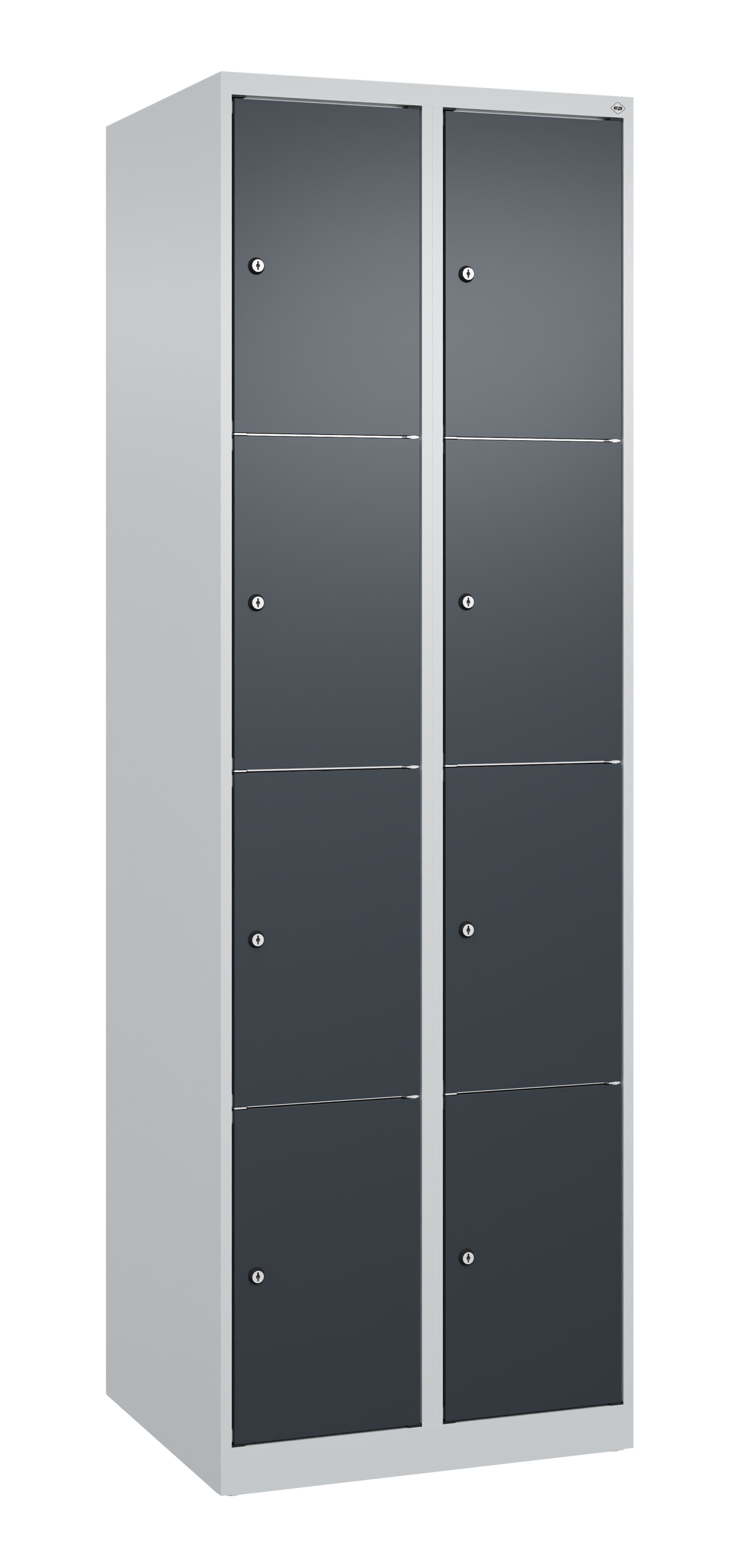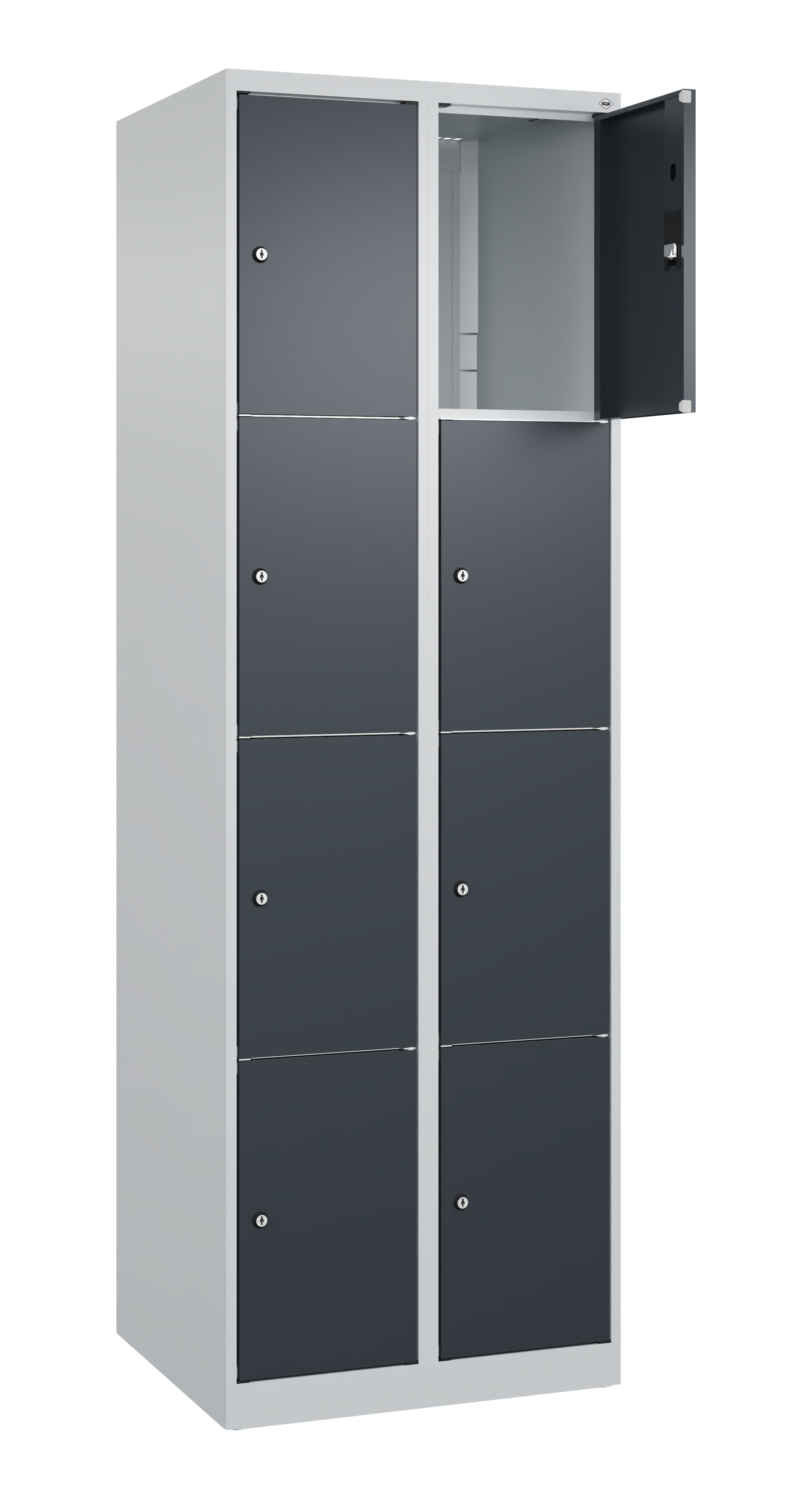 Schließfachschrank Classic PLUS, 2 Abteile mit je 4 Fächern, Abteilbreite 300 mm, Korpus aus stabiler Stahlkonstruktion mit hochwertiger Einbrennbeschichtung für hohe UV- und Korrosionsbeständigkeit, mit Bodengleitern als praktischer Schrank- und Fußbodenschutz, Türöffnungen 110 Grad, Türaufhängung rechts, Stahl-Türen mit Soft-Anschlag und geschlossenen Seitenprofilen für hohe Stabilität, Türaufhängung in stabilen Drehbolzen, 8 Zylinderschlösser mit 2 Schlüsseln, Schließkreis bis 1000 verschiedene Schließungen, Maße (H x B x T): 1850 x 600 x 500 mm, Korpus: RAL 7035 Lichtgrau, Türen Stahl: RAL 7016 Anthrazitgrau, Gewicht: 39 kg