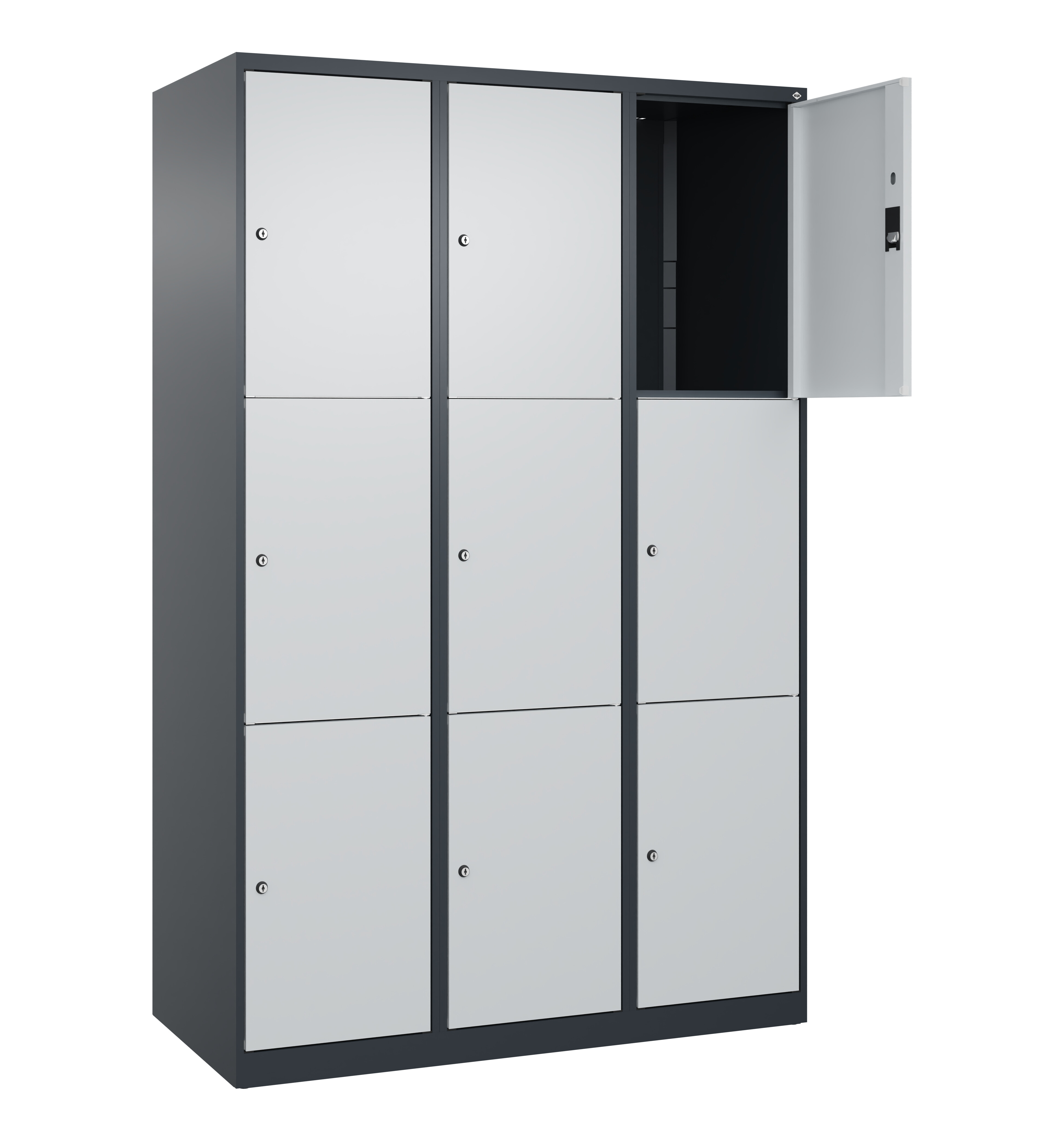 Schließfachschrank Classic PLUS, 3 Abteile mit je 3 Fächern, Abteilbreite 400 mm, Korpus aus stabiler Stahlkonstruktion mit hochwertiger Einbrennbeschichtung für hohe UV- und Korrosionsbeständigkeit, mit Bodengleitern als praktischer Schrank- und Fußbodenschutz, Türöffnungen 110 Grad, Türaufhängung rechts, Stahl-Türen mit Soft-Anschlag und geschlossenen Seitenprofilen für hohe Stabilität, Türaufhängung in stabilen Drehbolzen, 9 Zylinderschlösser mit 2 Schlüsseln, Schließkreis bis 1000 verschiedene Schließungen, Maße (H x B x T): 1850 x 1200 x 500 mm, Korpus: RAL 7016 Anthrazitgrau, Türen Stahl: RAL 7035 Lichtgrau, Gewicht: 62 kg