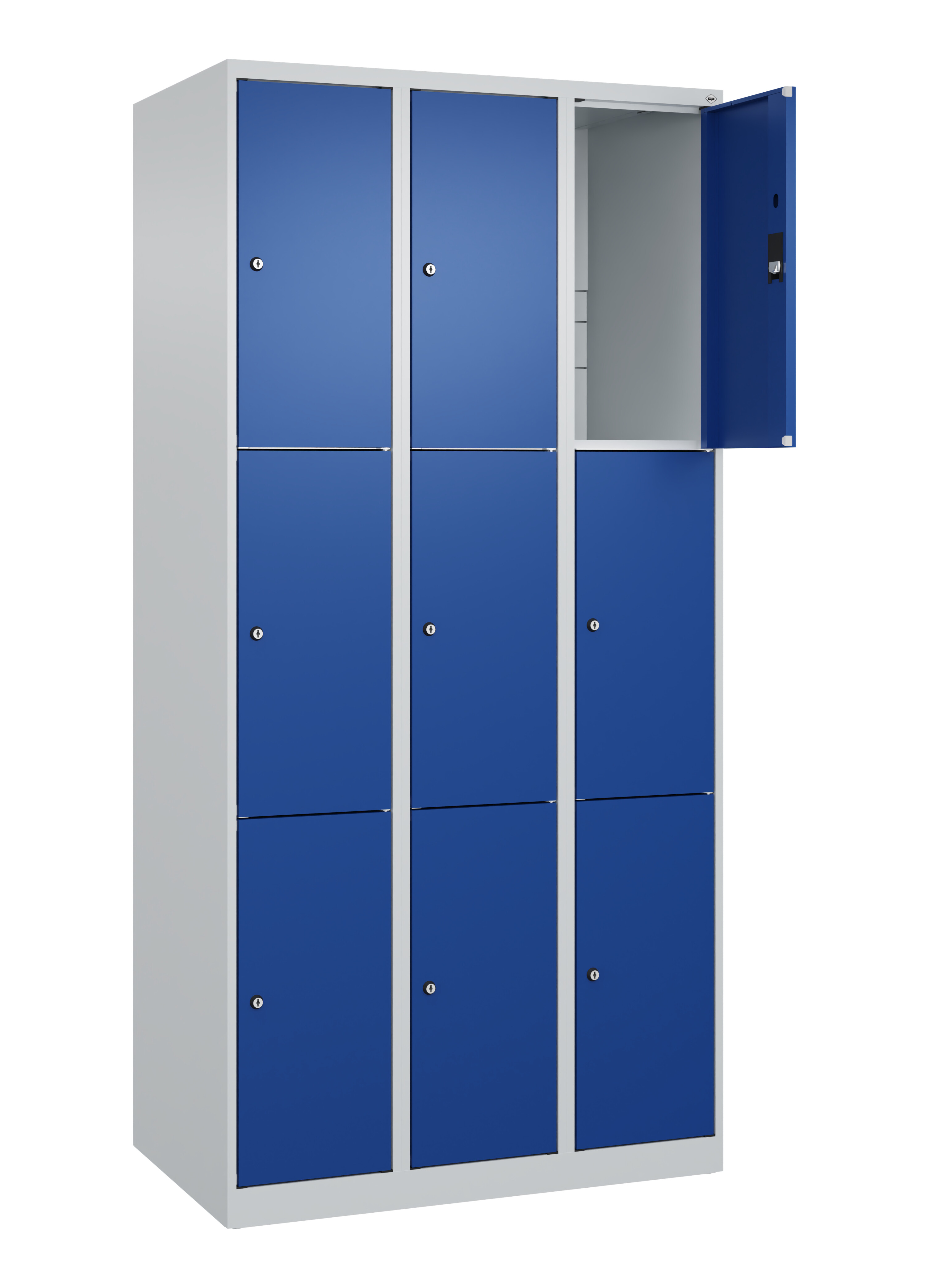 Schließfachschrank Classic PLUS, 3 Abteile mit je 3 Fächern, Abteilbreite 300 mm, Korpus aus stabiler Stahlkonstruktion mit hochwertiger Einbrennbeschichtung für hohe UV- und Korrosionsbeständigkeit, mit Bodengleitern als praktischer Schrank- und Fußbodenschutz, Türöffnungen 110 Grad, Türaufhängung rechts, Stahl-Türen mit Soft-Anschlag und geschlossenen Seitenprofilen für hohe Stabilität, Türaufhängung in stabilen Drehbolzen, 9 Zylinderschlösser mit 2 Schlüsseln, Schließkreis bis 1000 verschiedene Schließungen, Maße (H x B x T): 1850 x 900 x 500 mm, Korpus: RAL 7035 Lichtgrau, Türen Stahl: RAL 5010 Enzianblau, Gewicht: 51 kg