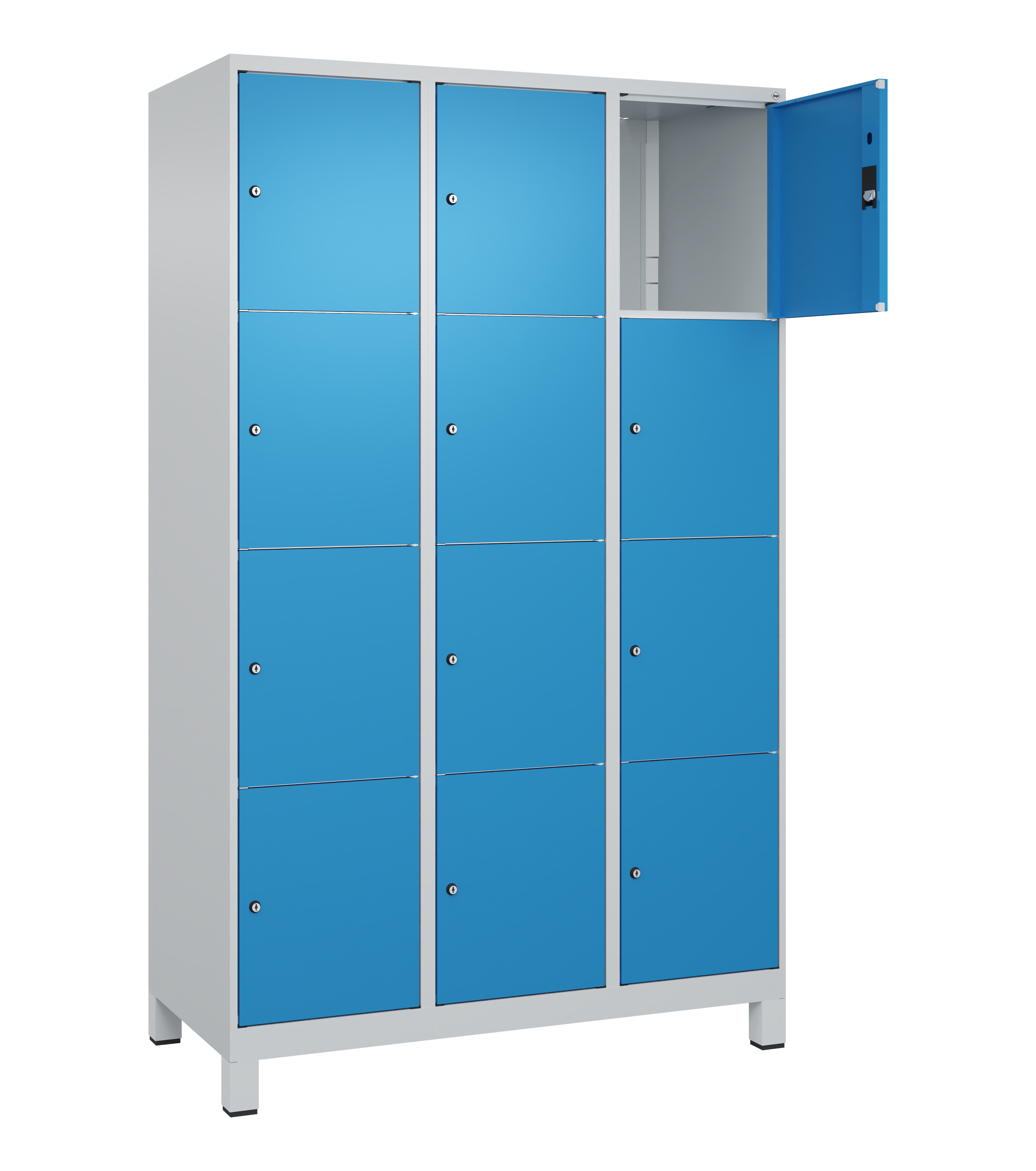 Schließfachschrank Classic Plus, Füße, 12 Fächer, 1950x1200x500mm RAL 5012 Lichtblau RAL 7035 Lichtgrau