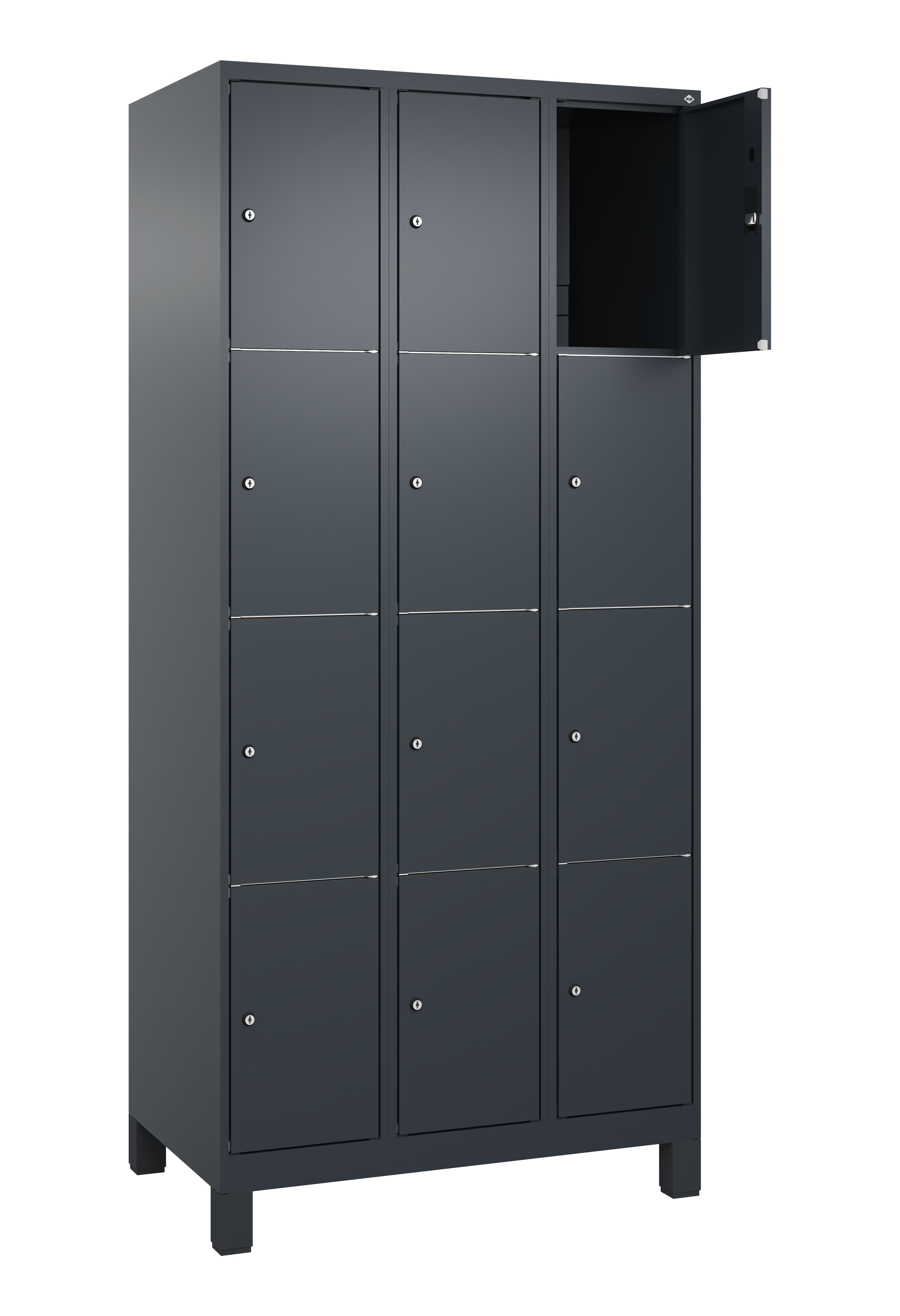 Schließfachschrank Classic PLUS, 3 Abteile mit je 4 Fächern, Abteilbreite 300 mm, Korpus aus stabiler Stahlkonstruktion mit hochwertiger Einbrennbeschichtung für hohe UV- und Korrosionsbeständigkeit, Türöffnungen 110 Grad, Türaufhängung rechts, Stahl-Türen mit Soft-Anschlag und geschlossenen Seitenprofilen für hohe Stabilität, Türaufhängung in stabilen Drehbolzen, 12 Zylinderschlösser mit 2 Schlüsseln, Schließkreis bis 1000 verschiedene Schließungen, 100 mm hohe Füße aus Kunststoff für erweiterten Korrosionsschutz, Maße (H x B x T): 1950 x 900 x 500 mm, Korpus: RAL 7016 Anthrazitgrau, Türen Stahl: RAL 7016 Anthrazitgrau, Füße: RAL 7021 Schwarzgrau, Gewicht: 54 kg