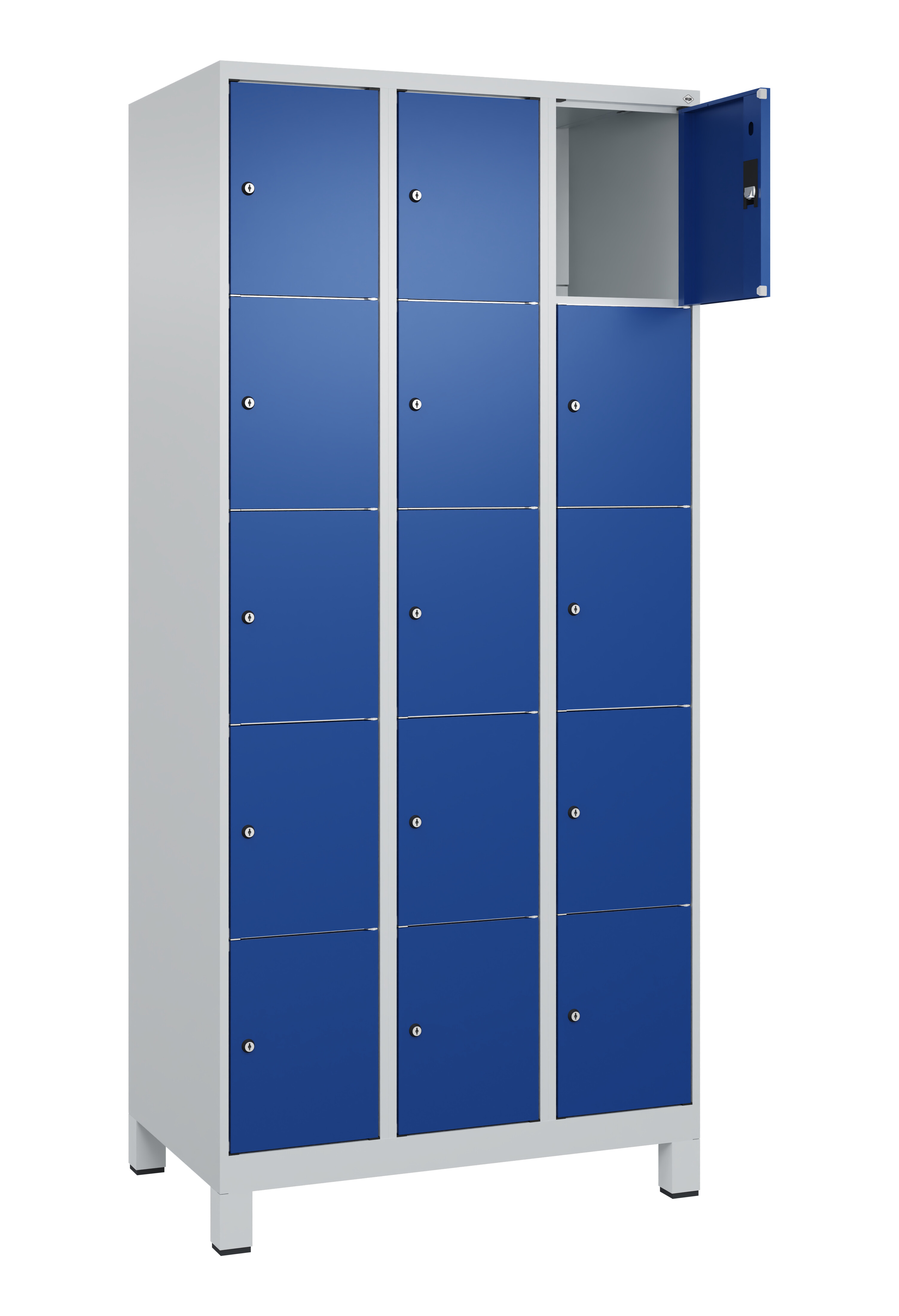 Schließfachschrank Classic PLUS, 3 Abteile mit je 5 Fächern, Abteilbreite 300 mm, Korpus aus stabiler Stahlkonstruktion mit hochwertiger Einbrennbeschichtung für hohe UV- und Korrosionsbeständigkeit, Türöffnungen 110 Grad, Stahl-Türen mit Soft-Anschlag und geschlossenen Seitenprofilen für hohe Stabilität, Türaufhängung in stabilen Drehbolzen, Türaufhängung rechts, 15 Zylinderschlösser mit 2 Schlüsseln, Schließkreis bis 1000 verschiedene Schließungen, 100 mm hohe Füße aus Kunststoff für erweiterten Korrosionsschutz, Maße (H x B x T): 1950 x 900 x 500 mm, Korpus: RAL 7035 Lichtgrau, Türen Stahl: RAL 5010 Enzianblau, Füße: RAL 7035 Lichtgrau, Gewicht: 58 kg
