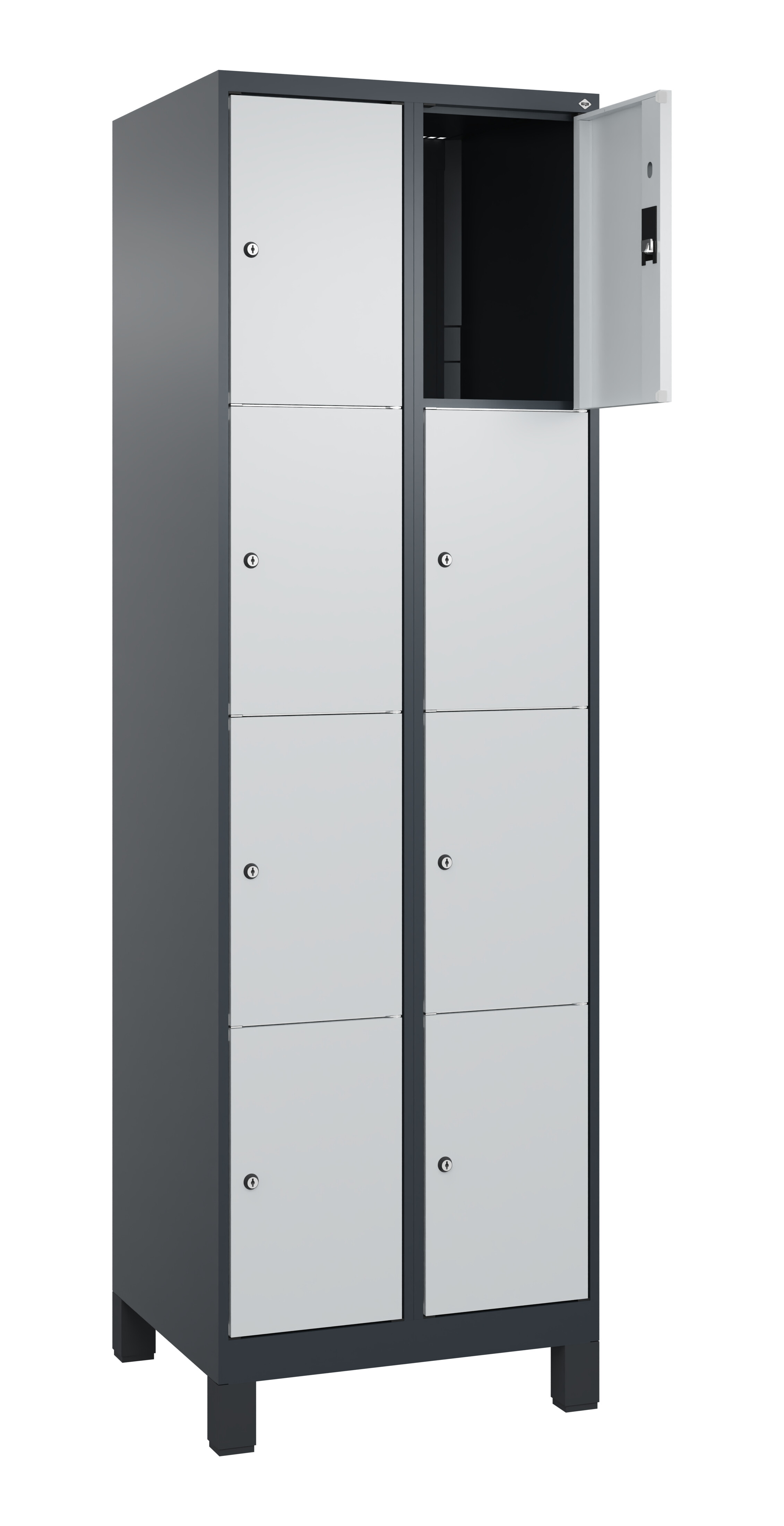 Schließfachschrank Classic PLUS, 2 Abteile mit je 4 Fächern, Abteilbreite 300 mm, Korpus aus stabiler Stahlkonstruktion mit hochwertiger Einbrennbeschichtung für hohe UV- und Korrosionsbeständigkeit, Türöffnungen 110 Grad, Türaufhängung rechts, Stahl-Türen mit Soft-Anschlag und geschlossenen Seitenprofilen für hohe Stabilität, Türaufhängung in stabilen Drehbolzen, 8 Zylinderschlösser mit 2 Schlüsseln, Schließkreis bis 1000 verschiedene Schließungen, 100 mm hohe Füße aus Kunststoff für erweiterten Korrosionsschutz, Maße (H x B x T): 1950 x 600 x 500 mm, Korpus: RAL 7016 Anthrazitgrau, Türen Stahl: RAL 7035 Lichtgrau, Füße: RAL 7021 Schwarzgrau, Gewicht: 39 kg