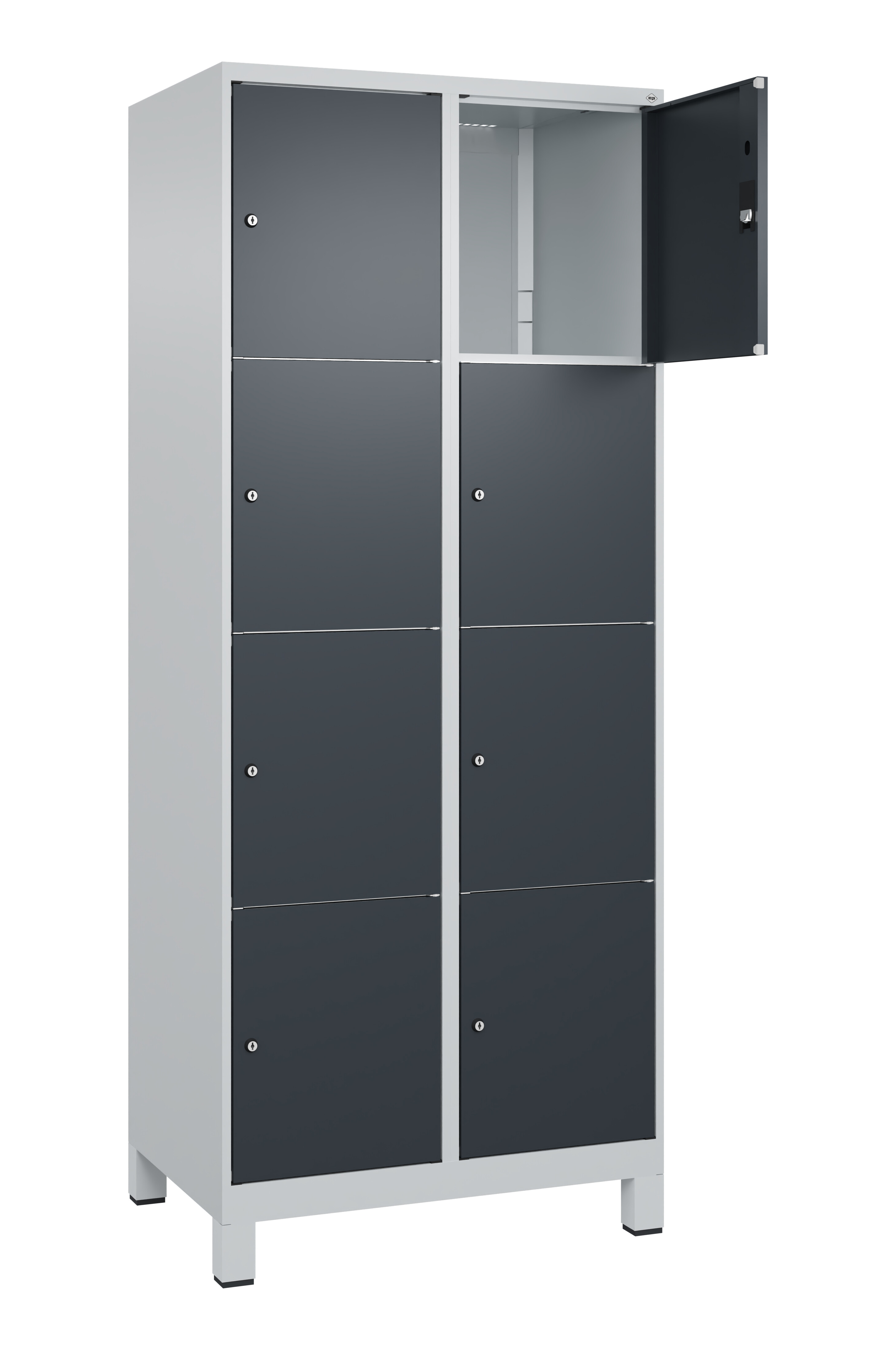 Schließfachschrank Classic Plus, Füße, 8 Fächer, 1950x800x500mm RAL 7016 Anthrazitgrau RAL 7035 Lichtgrau