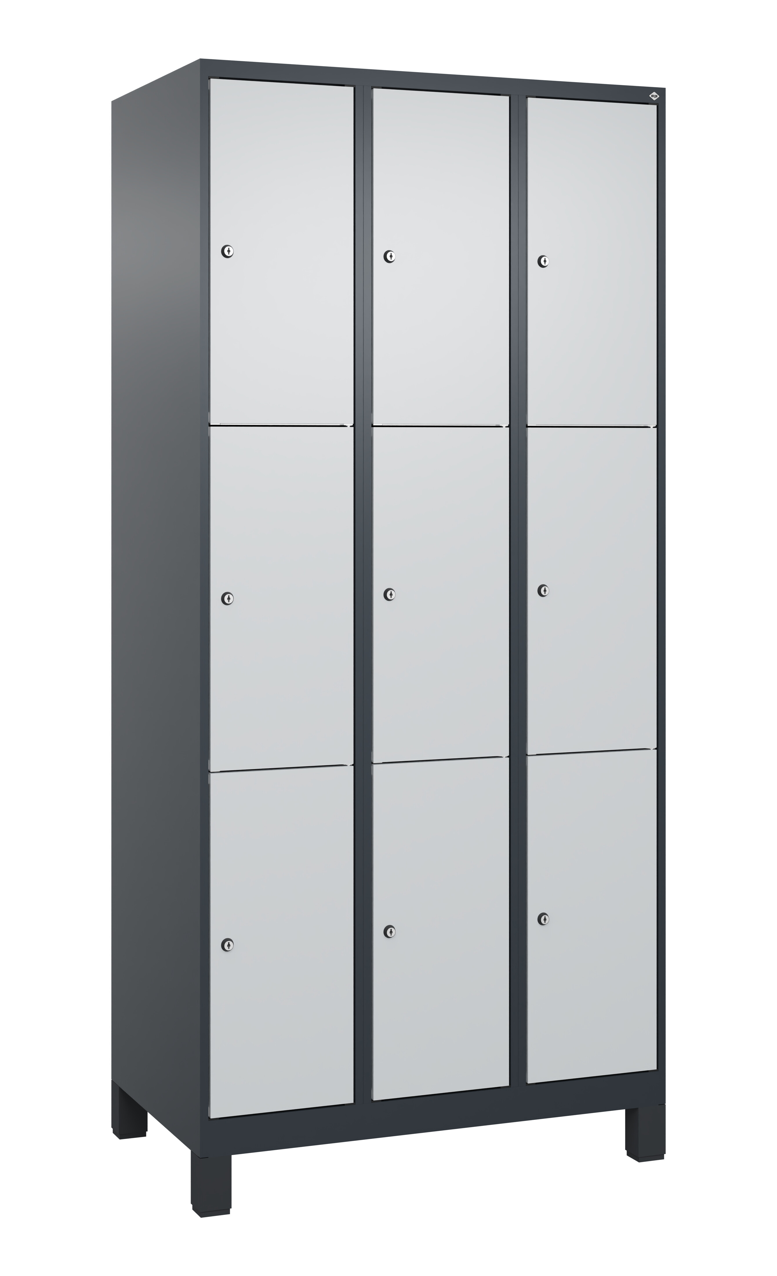 Schließfachschrank Classic PLUS, 3 Abteile mit je 3 Fächern, Abteilbreite 300 mm, Korpus aus stabiler Stahlkonstruktion mit hochwertiger Einbrennbeschichtung für hohe UV- und Korrosionsbeständigkeit, Türöffnungen 110 Grad, Türaufhängung rechts, Stahl-Türen mit Soft-Anschlag und geschlossenen Seitenprofilen für hohe Stabilität, Türaufhängung in stabilen Drehbolzen, 9 Zylinderschlösser mit 2 Schlüsseln, Schließkreis bis 1000 verschiedene Schließungen, 100 mm hohe Füße aus Kunststoff für erweiterten Korrosionsschutz, Maße (H x B x T): 1950 x 900 x 500 mm, Korpus: RAL 7016 Anthrazitgrau, Türen Stahl: RAL 7035 Lichtgrau, Füße: RAL 7021 Schwarzgrau, Gewicht: 51 kg