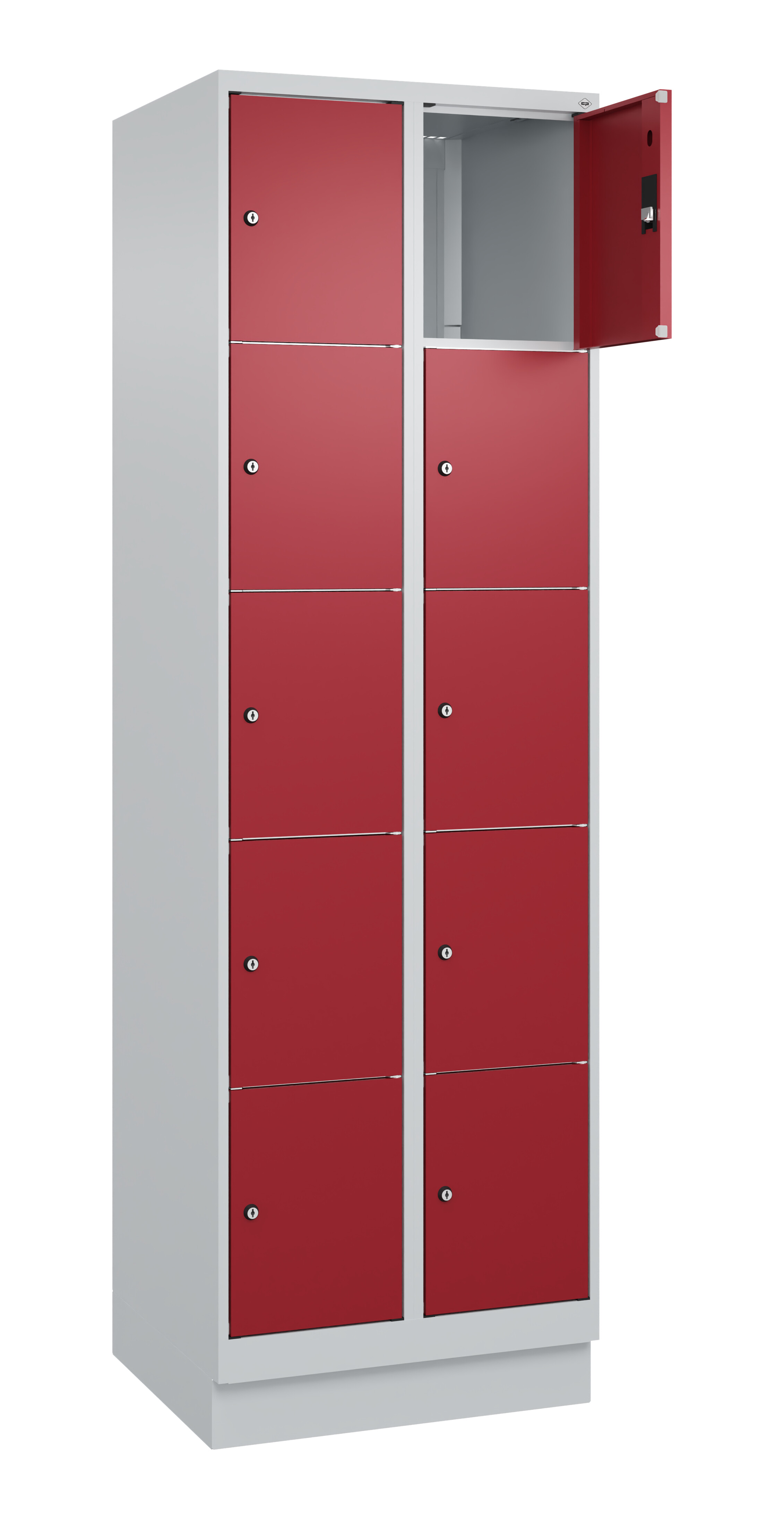 Schließfachschrank Classic PLUS, 2 Abteile mit je 5 Fächern, Abteilbreite 300 mm, Korpus aus stabiler Stahlkonstruktion mit hochwertiger Einbrennbeschichtung für hohe UV- und Korrosionsbeständigkeit, auf 100 mm hohem Sockel, Türöffnungen 110 Grad, Türaufhängung rechts, Stahl-Türen mit Soft-Anschlag und geschlossenen Seitenprofilen für hohe Stabilität, Türaufhängung in stabilen Drehbolzen, 10 Zylinderschlösser mit 2 Schlüsseln, Schließkreis bis 1000 verschiedene Schließungen, Maße (H x B x T): 1950 x 600 x 500 mm, Korpus: RAL 7035 Lichtgrau, Türen Stahl: RAL 3003 Rubinrot, Sockel: RAL 7035 Lichtgrau, Gewicht: 42 kg