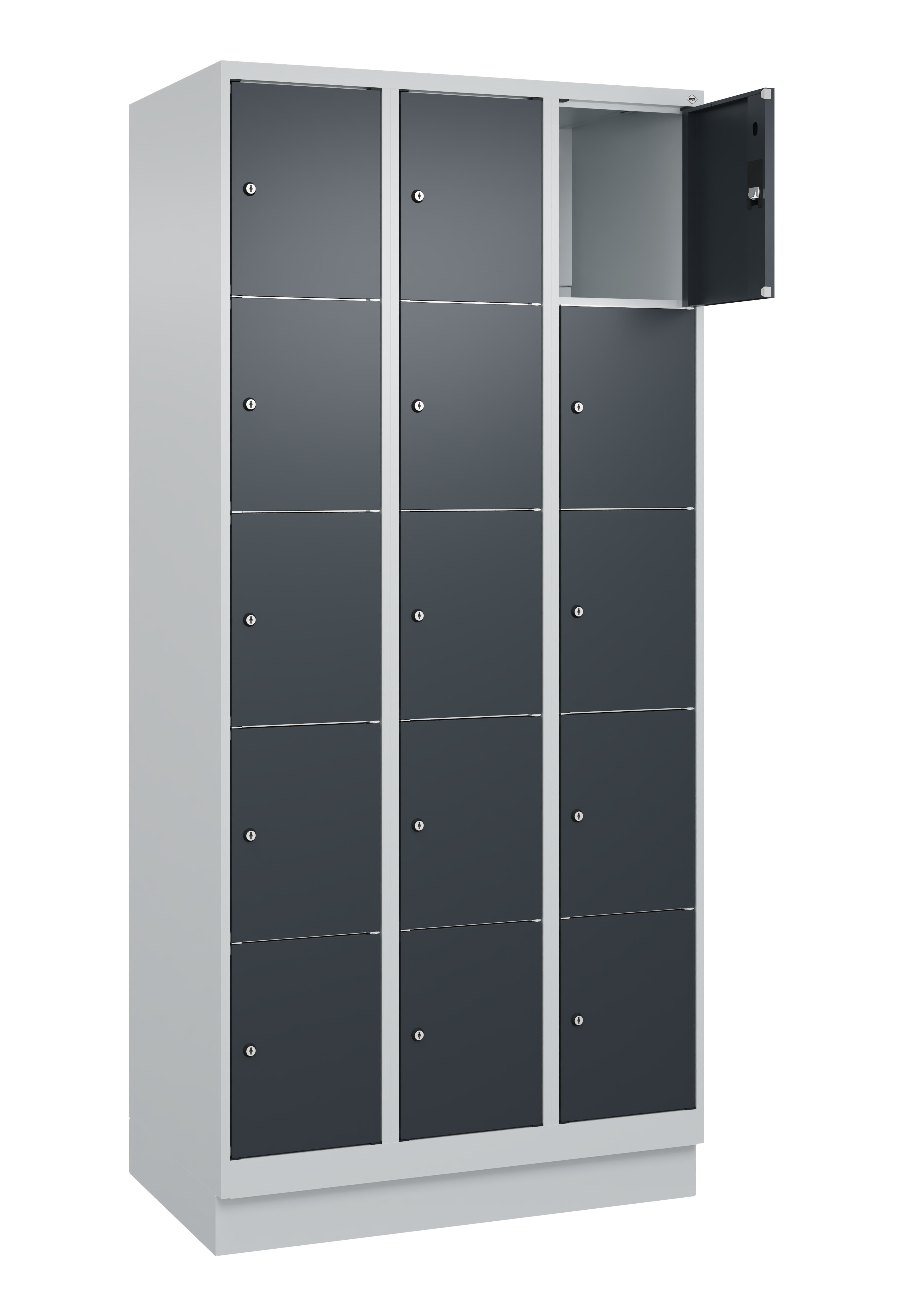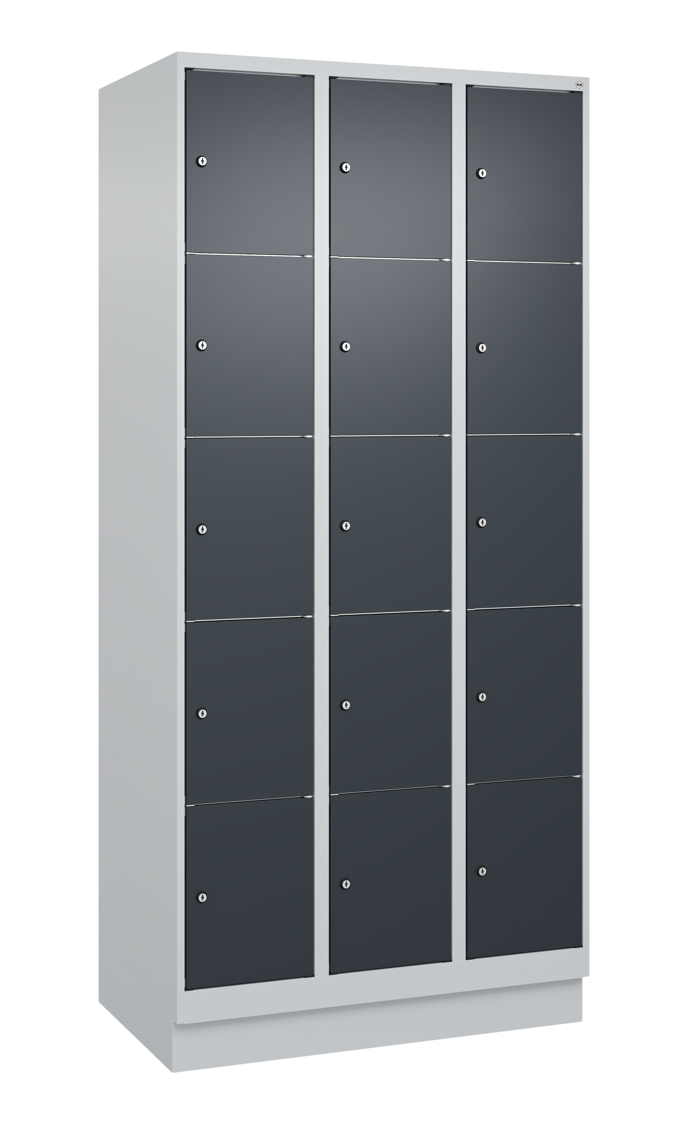 Schließfachschrank Classic Plus, Sockel, 15 Fächer, 1950x900x500mm RAL 7016 Anthrazitgrau RAL 7035 Lichtgrau
