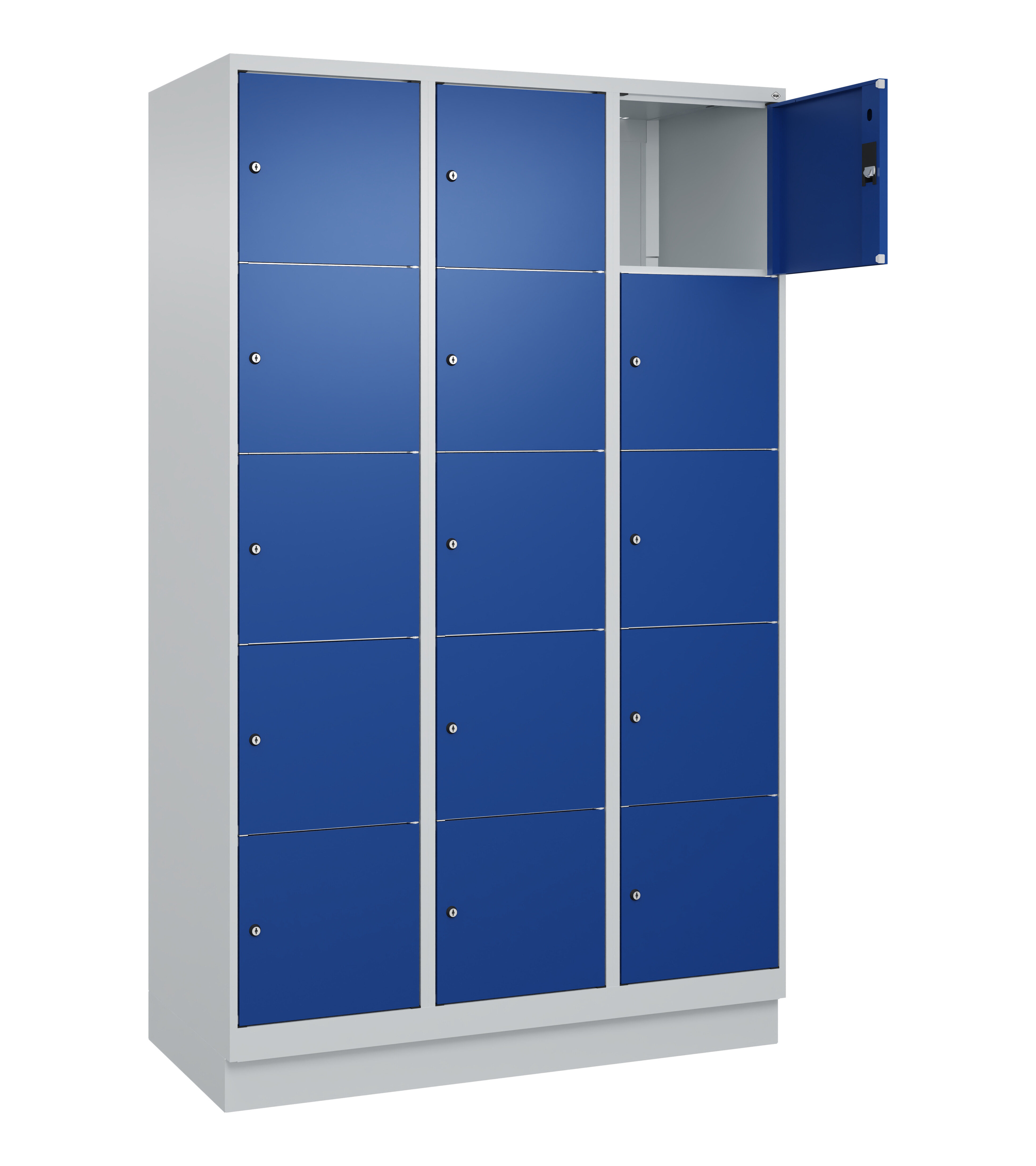 Schließfachschrank Classic PLUS, 3 Abteile mit je 5 Fächern, Abteilbreite 400 mm, Korpus aus stabiler Stahlkonstruktion mit hochwertiger Einbrennbeschichtung für hohe UV- und Korrosionsbeständigkeit, auf 100 mm hohem Sockel, Türöffnungen 110 Grad, Türaufhängung rechts, Stahl-Türen mit Soft-Anschlag und geschlossenen Seitenprofilen für hohe Stabilität, Türaufhängung in stabilen Drehbolzen, 15 Zylinderschlösser mit 2 Schlüsseln, Schließkreis bis 1000 verschiedene Schließungen, Maße (H x B x T): 1950 x 1200 x 500 mm, Korpus: RAL 7035 Lichtgrau, Türen Stahl: RAL 5010 Enzianblau, Sockel: RAL 7035 Lichtgrau, Gewicht: 73 kg