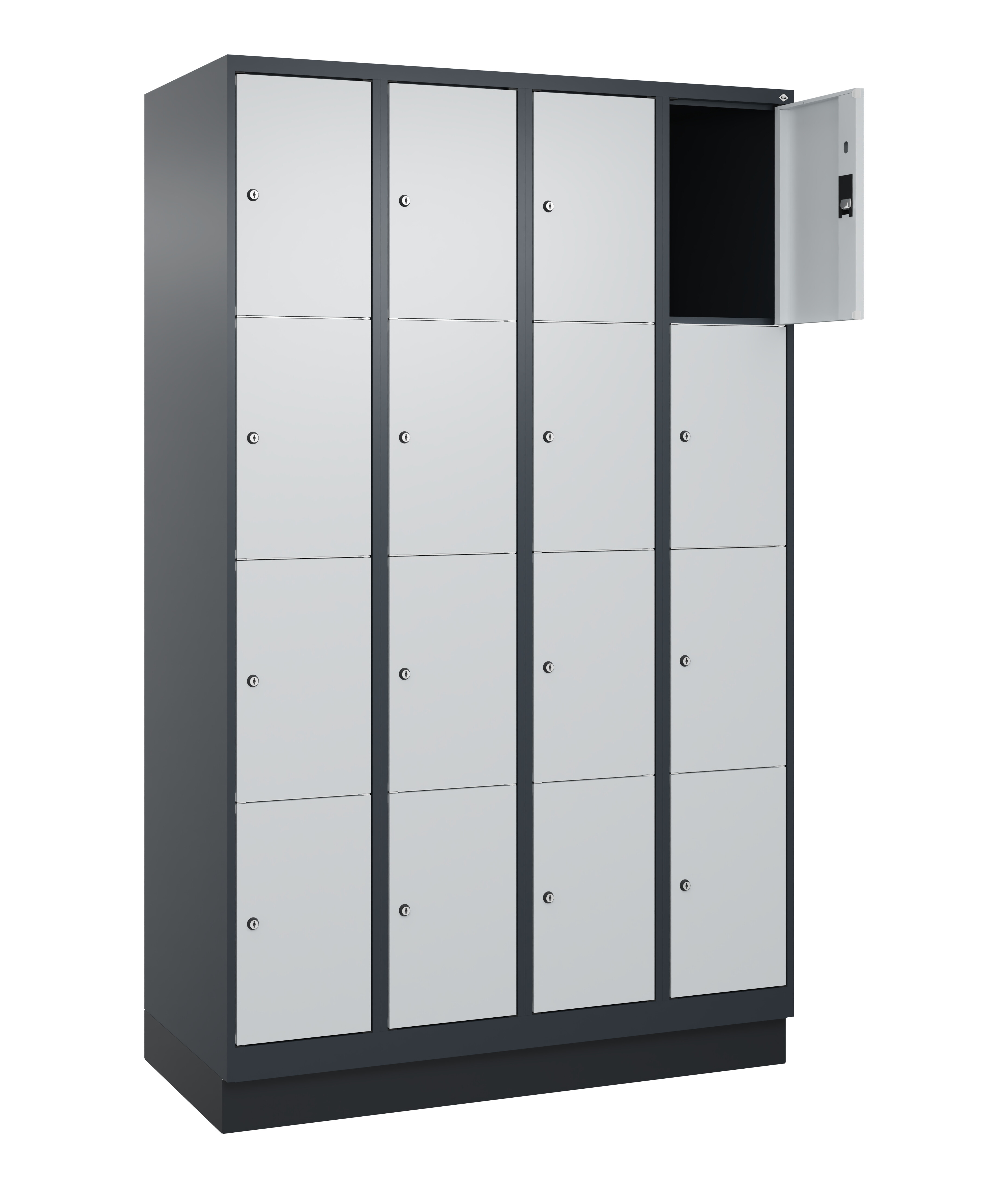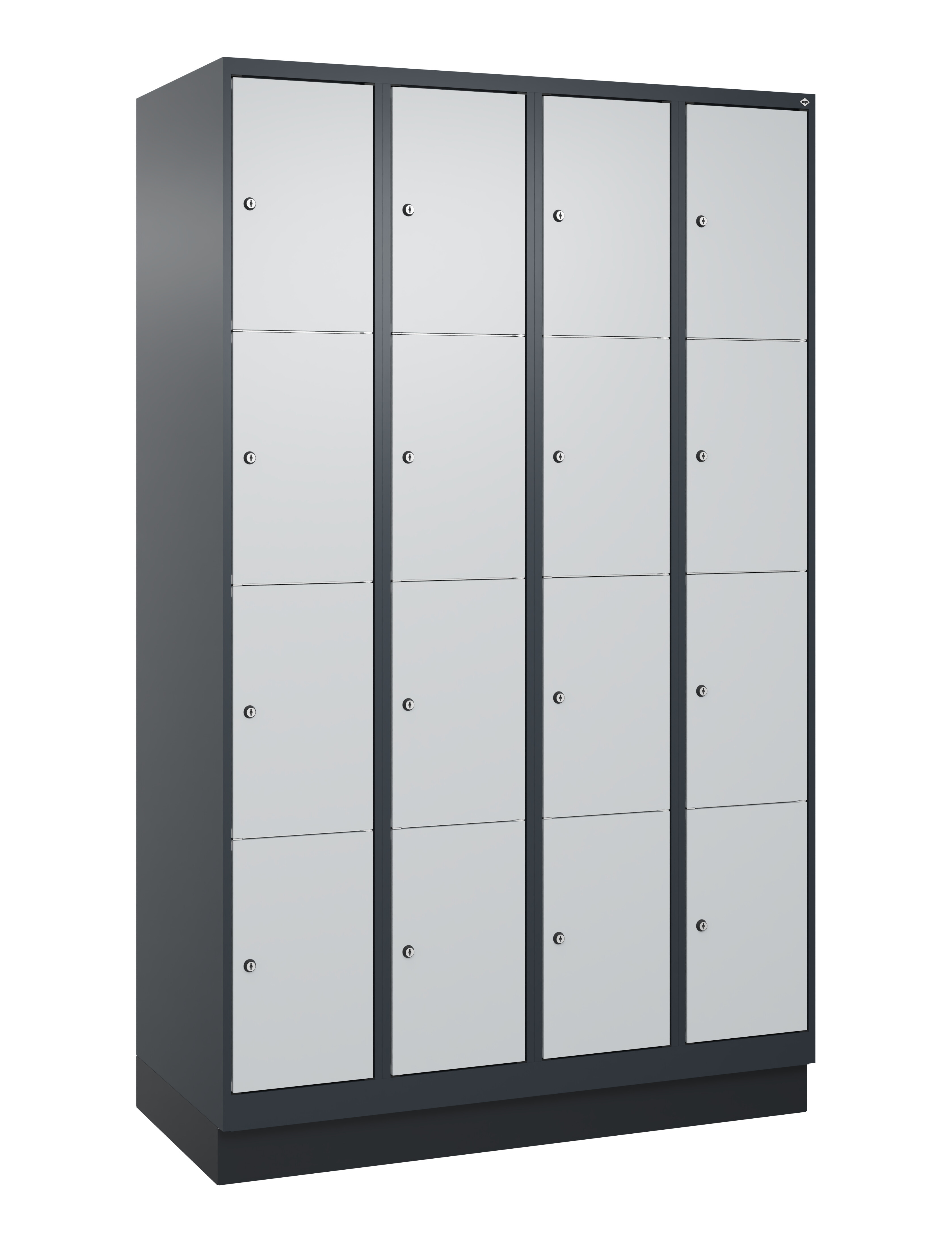 Schließfachschrank Classic PLUS, 4 Abteile mit je 4 Fächern, Abteilbreite 300 mm, Korpus aus stabiler Stahlkonstruktion mit hochwertiger Einbrennbeschichtung für hohe UV- und Korrosionsbeständigkeit, auf 100 mm hohem Sockel, Türöffnungen 110 Grad, Türaufhängung rechts, Stahl-Türen mit Soft-Anschlag und geschlossenen Seitenprofilen für hohe Stabilität, Türaufhängung in stabilen Drehbolzen, 16 Zylinderschlösser mit 2 Schlüsseln, Schließkreis bis 1000 verschiedene Schließungen, Maße (H x B x T): 1950 x 1200 x 500 mm, Korpus: RAL 7016 Anthrazitgrau, Türen Stahl: RAL 7035 Lichtgrau, Sockel: RAL 7021 Schwarzgrau, Gewicht: 73 kg