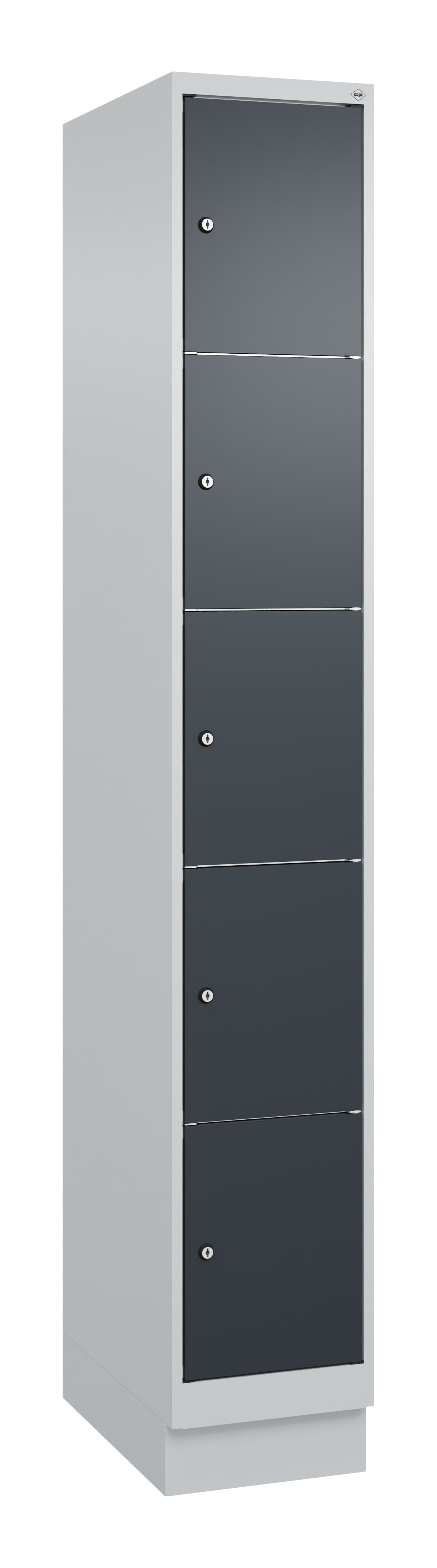 Schließfachschrank Classic Plus, Sockel, 5 Fächer, 1950x300x500mm RAL 7016 Anthrazitgrau RAL 7035 Lichtgrau