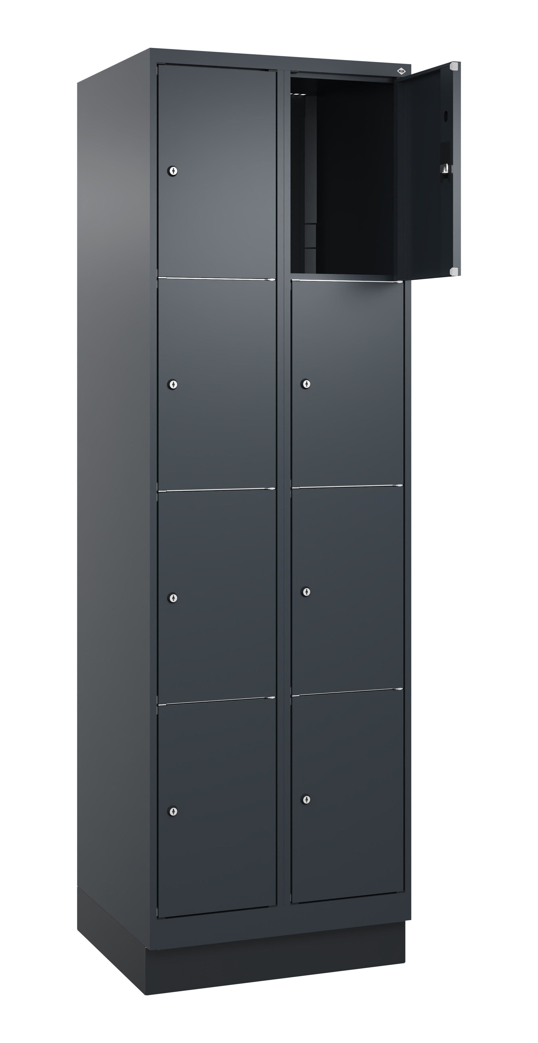 Schließfachschrank Classic PLUS, 2 Abteile mit je 4 Fächern, Abteilbreite 300 mm, Korpus aus stabiler Stahlkonstruktion mit hochwertiger Einbrennbeschichtung für hohe UV- und Korrosionsbeständigkeit, auf 100 mm hohem Sockel, Türöffnungen 110 Grad, Stahl-Türen mit Soft-Anschlag und geschlossenen Seitenprofilen für hohe Stabilität, Türaufhängung in stabilen Drehbolzen, Türaufhängung rechts, 8 Zylinderschlösser mit 2 Schlüsseln, Schließkreis bis 1000 verschiedene Schließungen, Maße (H x B x T): 1950 x 600 x 500 mm, Korpus: RAL 7016 Anthrazitgrau, Türen Stahl: RAL 7016 Anthrazitgrau, Sockel: RAL 7021 Schwarzgrau, Gewicht: 40 kg