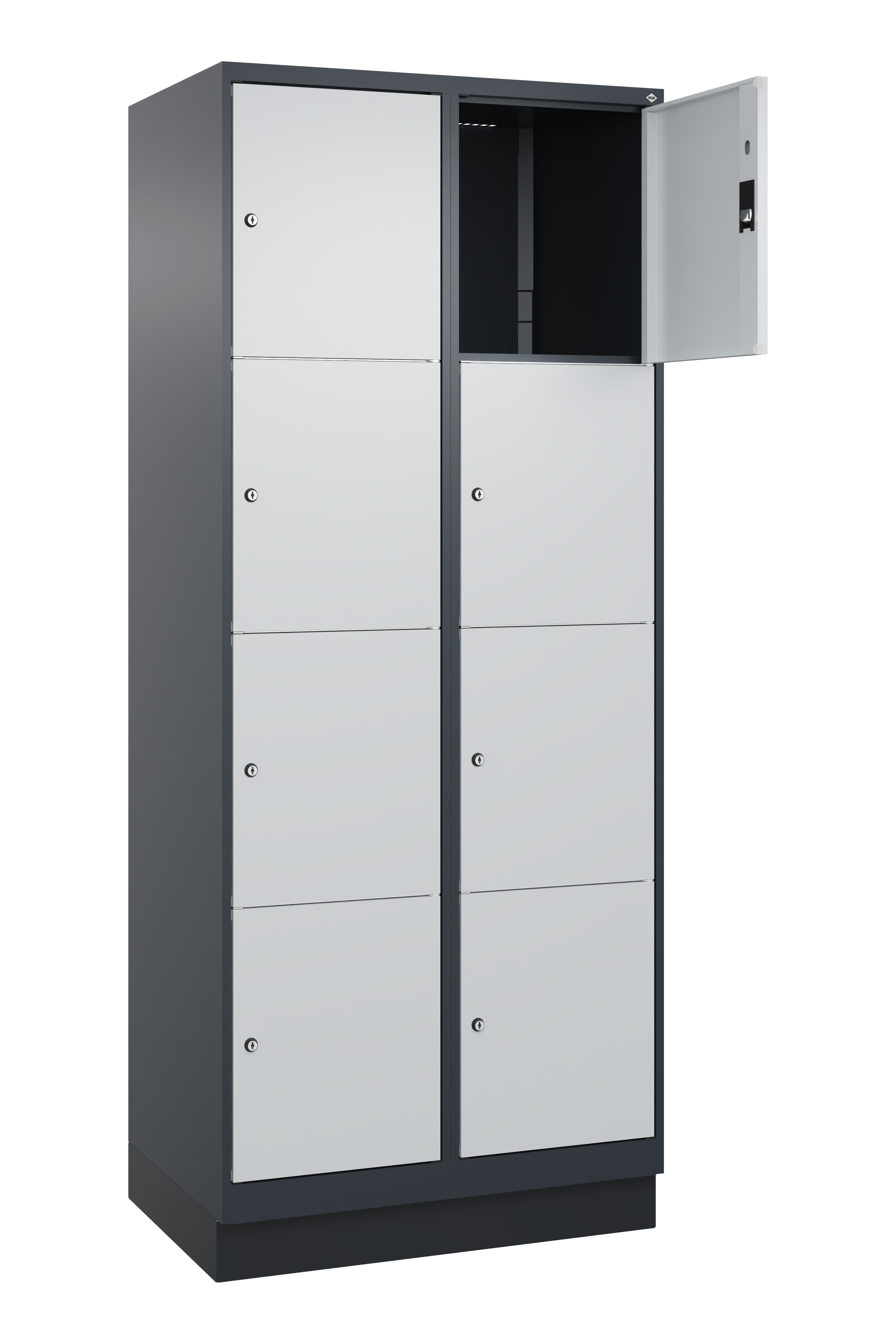 Schließfachschrank Classic Plus, Sockel, 8 Fächer, 2120x800x500mm RAL 7035 Lichtgrau RAL 7016 Anthrazitgrau