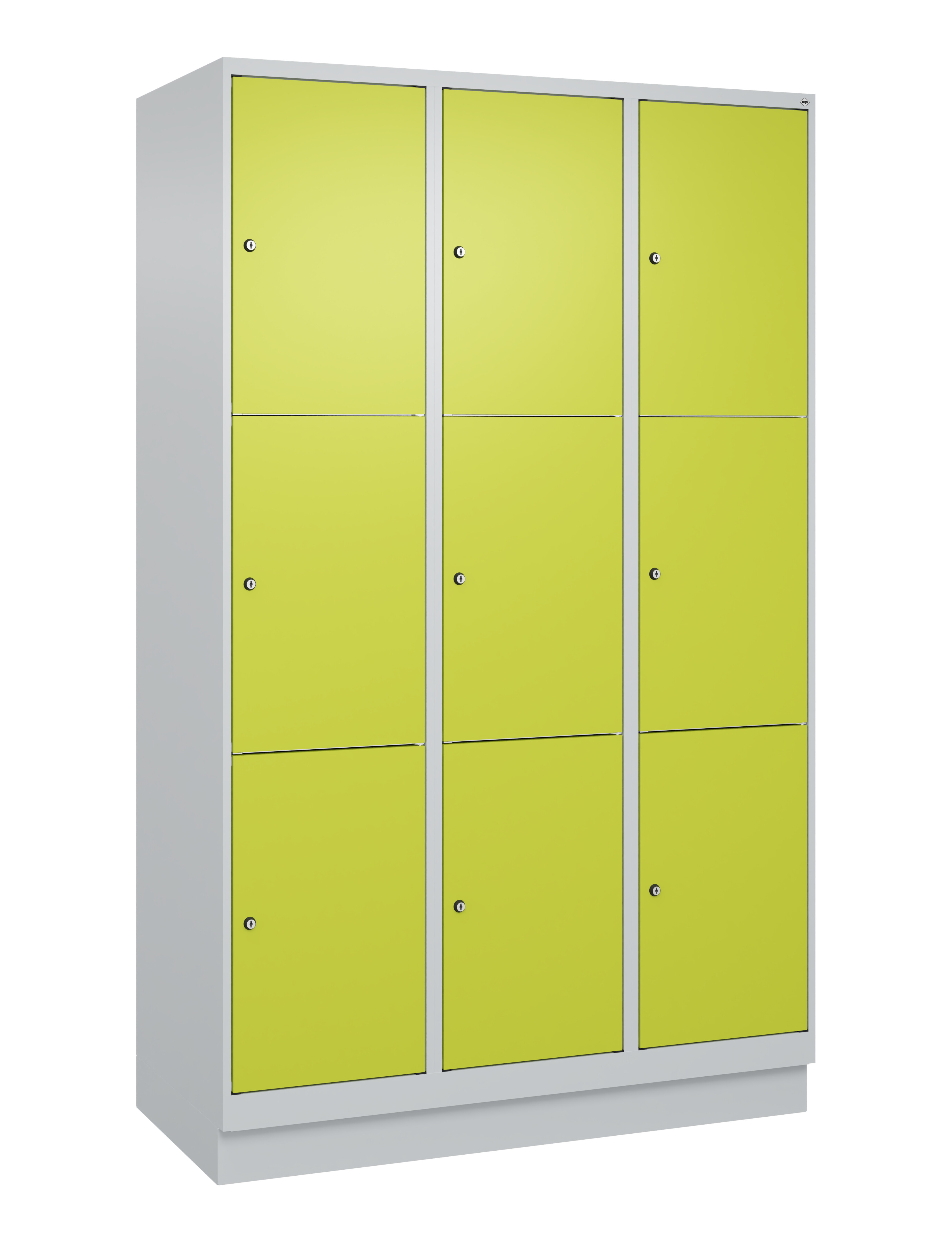 Schließfachschrank Classic Plus, Sockel, 9 Fächer, 2120x1200x500mm RAL 1108060 Clowngrün RAL 7035 Lichtgrau