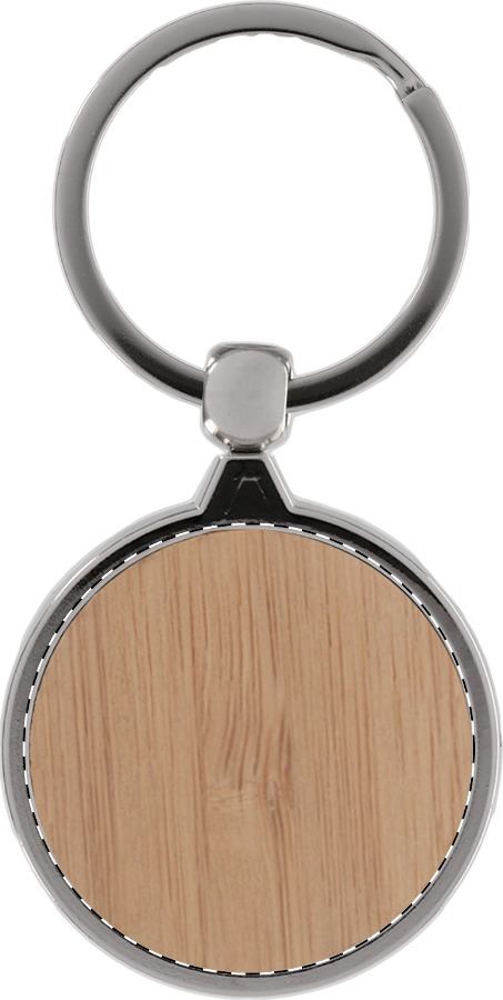 Runder Metallschlüsselanhänger mit Bambuseinsatz. Einzeln in Pappschachtel.