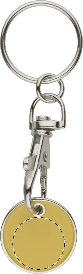 Metall-Schlüsselanhänger mit Einkaufswagen-Chip. Chip mit einer farbigen Seite und Einkaufswagen-Motiv auf der Rückseite. Chipgröße: ø23×1,7 mm.