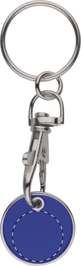 Metall-Schlüsselanhänger mit Einkaufswagen-Chip. Chip mit einer farbigen Seite und Einkaufswagen-Motiv auf der Rückseite. Chipgröße: ø23×1,7 mm.