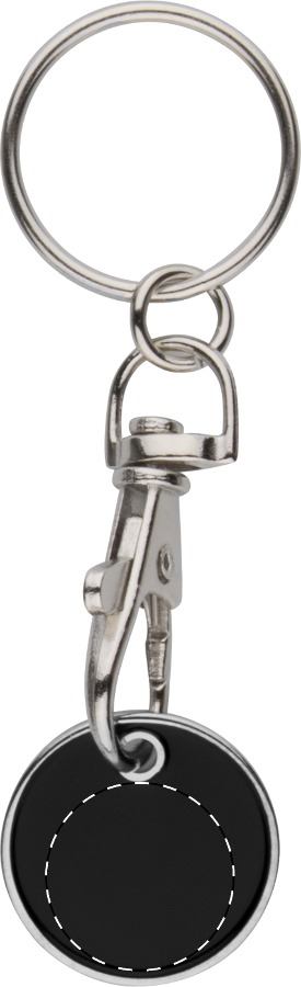 Metall-Schlüsselanhänger mit Einkaufswagen-Chip. Chip mit einer farbigen Seite und Einkaufswagen-Motiv auf der Rückseite. Chipgröße: ø23×1,7 mm.