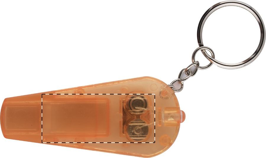 Transparente Pfeife aus Kunststoff mit Metall-Schlüsselring und weißem LED-Licht. Inkl. Knopfzellenbatterie.