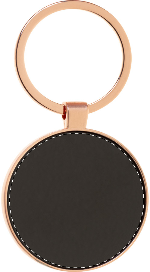 Runder Metallschlüsselanhänger mit goldfarbener Oberfläche mit Gunmetal-Plättchen. Einzeln in Kraftpapierbox.