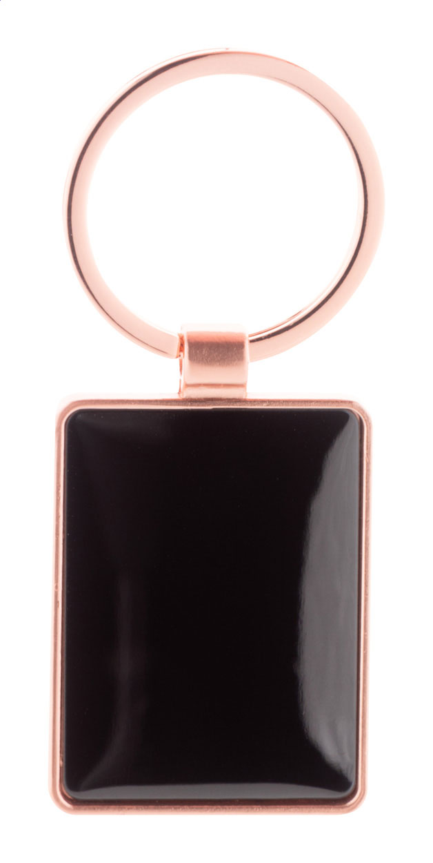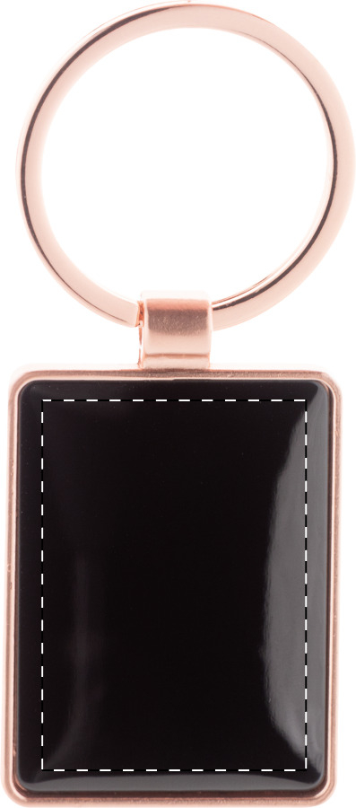 Rechteckiger Metallschlüsselanhänger mit goldfarbener Oberfläche mit Gunmetal-Plättchen. Einzeln in Kraftpapierbox.