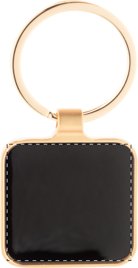 Quadratischer Metallschlüsselanhänger mit goldfarbener Oberfläche mit Gunmetal-Plättchen. Einzeln in Kraftpapierbox.